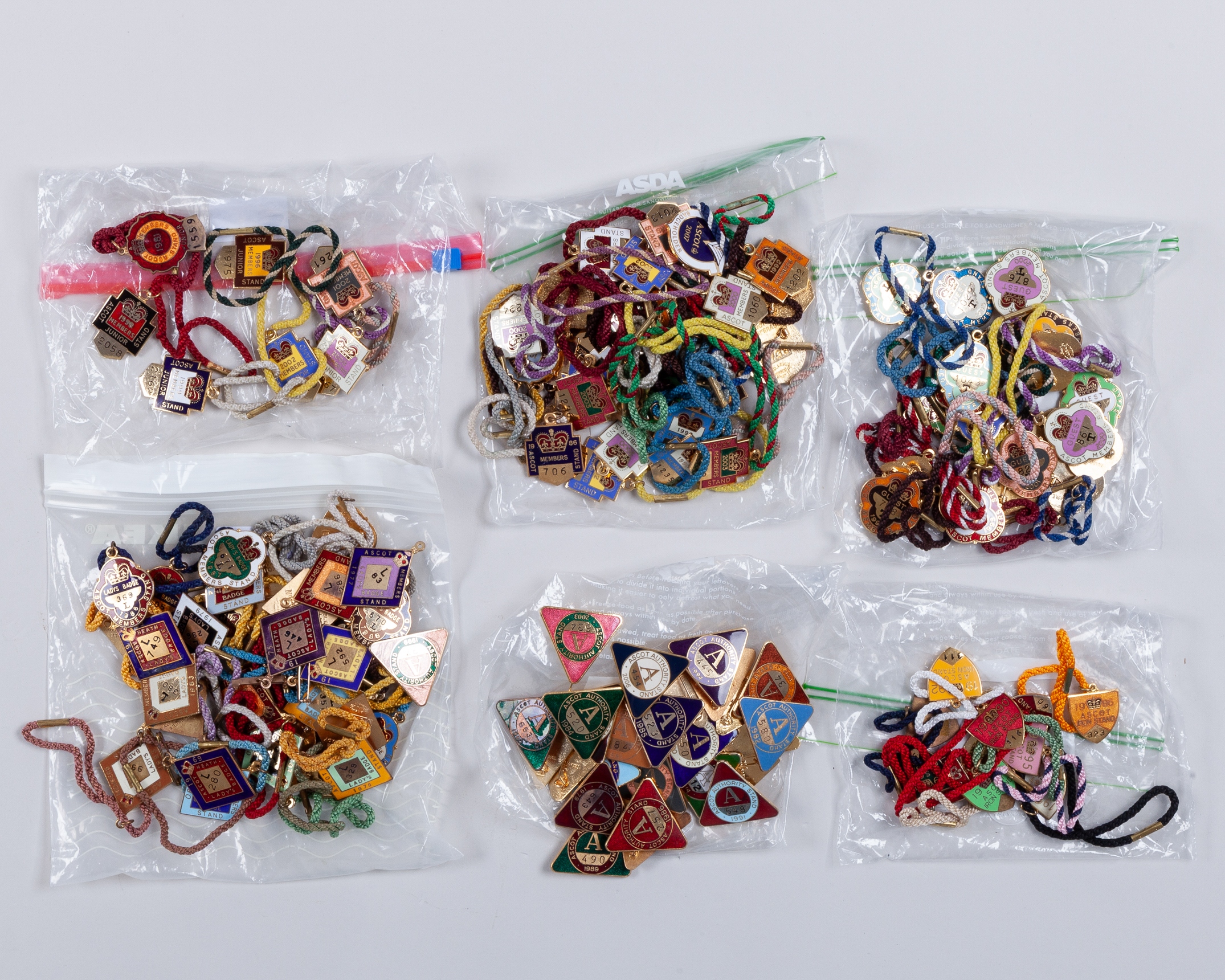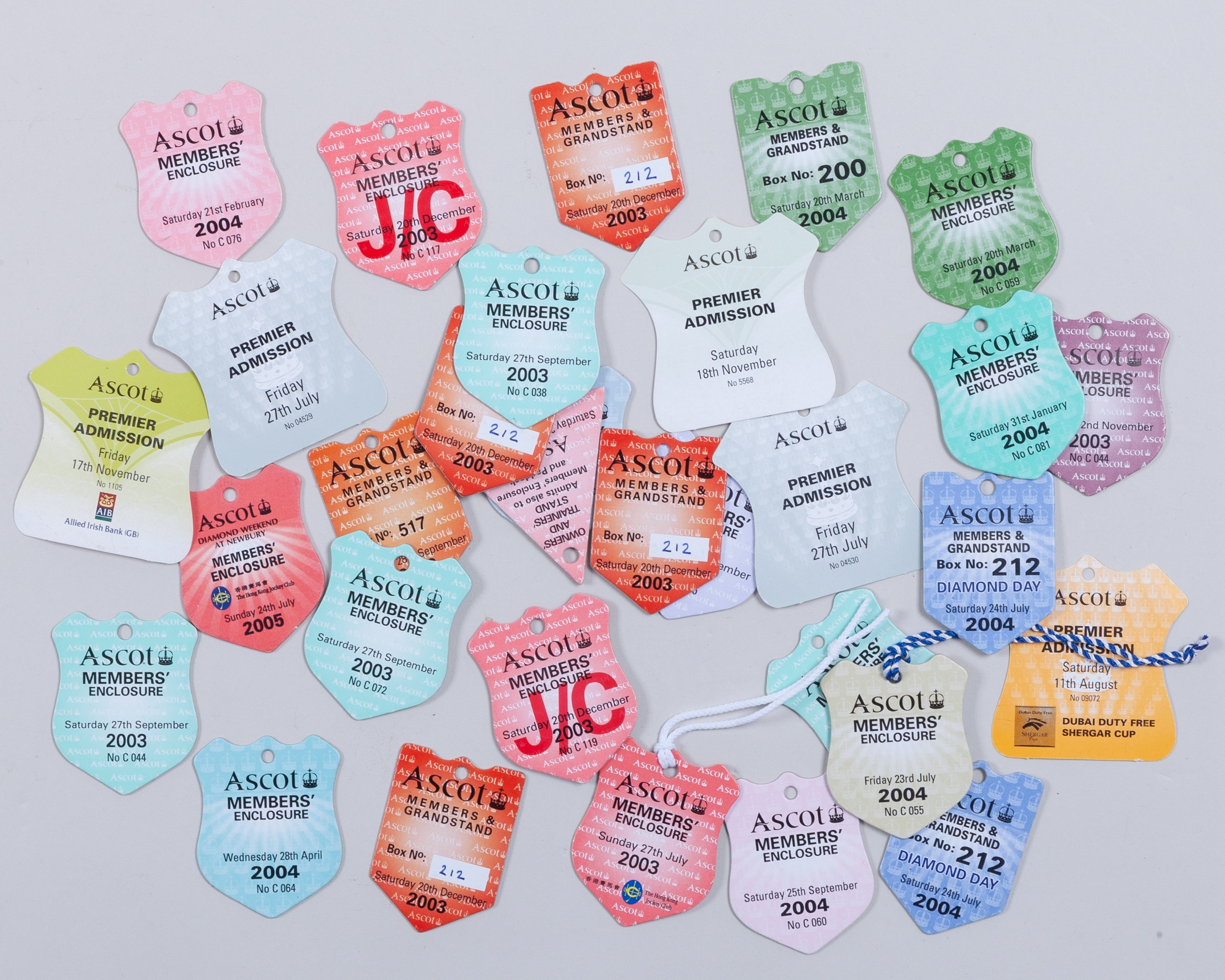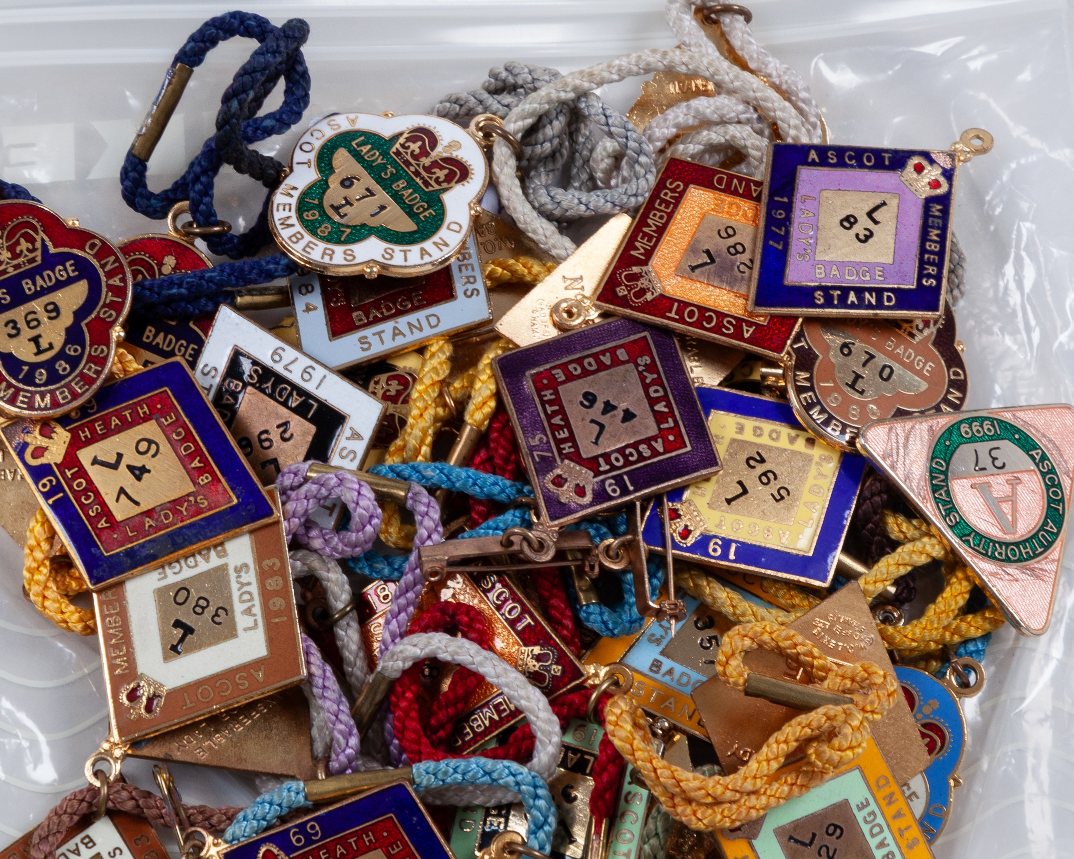 for the Ascot Authority Stand, 1977 to 2004 inclusive, 2006, 2014 & 2017; Ascot Junior Stand, for 1981, 1996 and 1998 to 2002 inc.; Ascot Members Stand (Ladies) for 1969 x 2, 1972, 1974 to 1976, 1977 x 2, 1978 x 2, 1979, 1980, 1981 x 4, 1982 x 2, 1983 x 2, 1984 x 2, 1985, 1986 x 2, 1987 x 2, 1988, 1989 x 2 and 1990 x 2; Ascot Members Stand (Gents) for 1957, 1982, 1984, 1986, 1987 x 2, 1988, 1989, 1990 x 3, 1991 x 2, 1992 x 3, 1993, 1994 x 3, 1995 x 2, 1996, 1998, 1999, 2000 x 3, 2001, 2002 x 3, 2003 x 3, 2004 x 2, 2005, 2007 x 2 & 2013; Ascot Guest for 1991 x 2, 1992 x 2, 1993 x 3, 1994 x 2, 1995 x 2, 1996 x 2, 1997 x 2, 2000 x 2, 2001 & 2002; and Ascot Iron Stand for 1976, 1982, 1986 x 2, 1987, 1990, 1992, 1994, 1995 & 1997 x 2; the lot also including QIPCO Champions Day badges for 2014 x 4, 2018 & 2019 x 2; five badges for Ascot's 300th anniversary celebrations; and 31 various cardboard day passes, post-2000