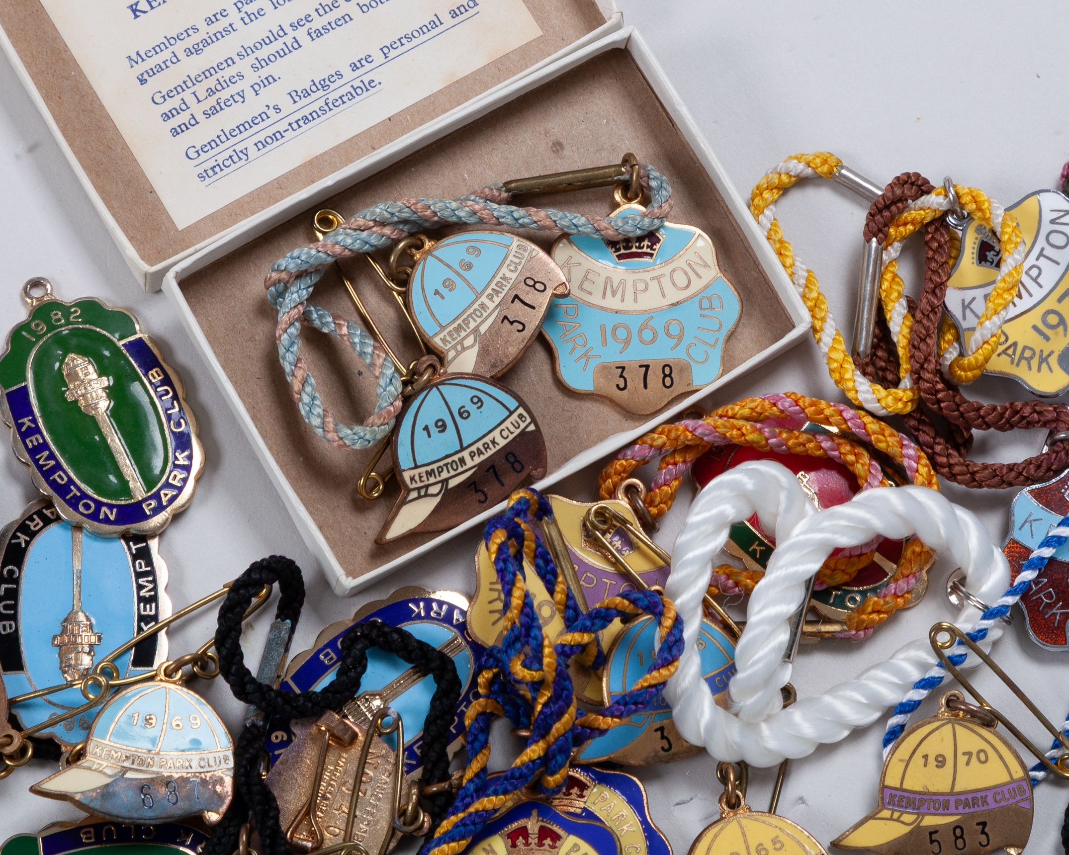 for 1888, 1908, 1957 x 2, 1958, 1960 x 2, 1961, 1962, 1964, 1965 x 3 (a matched trio), 1966 x 2 (a matched pair), 1967 x 5 (a matched trio, and two singles), 1969 x 6 (a boxed matched-trio, and an unboxed matched trio), 1970 x 6 (two sets of matched trios), 1971 to 1975, 1980, 1982, 1989, 1990, 1997-98 and 2013-14 x 2; sold together with joint-badges for Kempton Park And Sandown Park (United Racecourses) for 1984-85 to 1987-88 inc., 1990-91 to 1993-94 inc., and 2000 to 2003 inc.