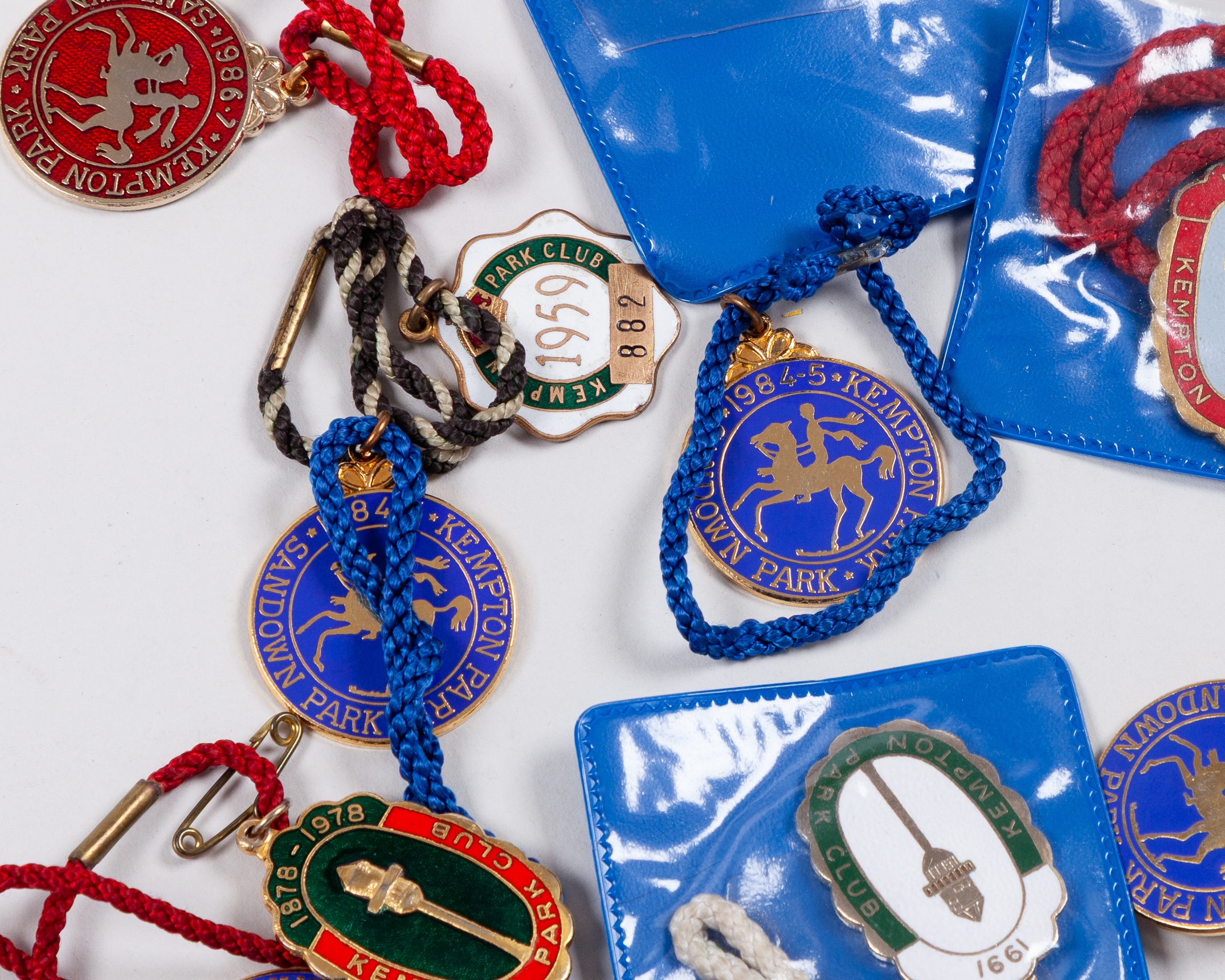 an early example for 1886 but with some enamel loss; then 1959, 1963, 1964, 1969, 1978, 1980, 1981, 1982, 1983, 1984, 1985, 1986, 1987, 1988, 1989, 1990, 1991, 1992, 1993, 1994, 1995, 1996-97, 1997-98, 1998 and two for 1999-2000; the remaing badges issued by United Racecourses allowed entry to both Kempton Park and Sandown Park, seven for 1984-85 and three for 1986-87