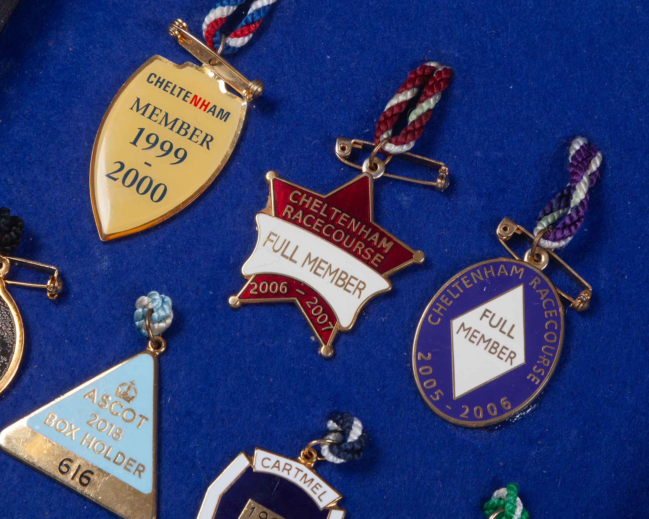 mostly annual members badges and mostly for Cheltenham, also Royal Windsor, Cartmel, Arena Leisure, QIPCO Champions Day, At The Races Gold Cup, 23 badges in total, similarly mounted, framed & glazed, the larger 38 by 23cm.