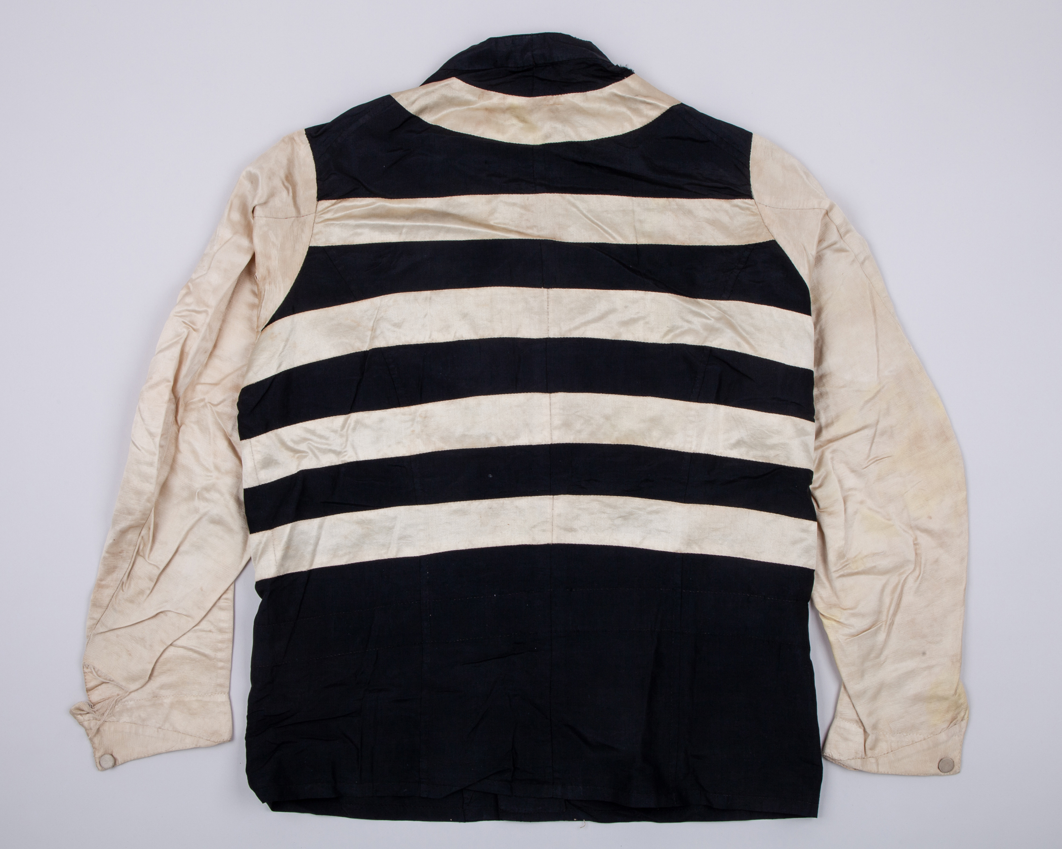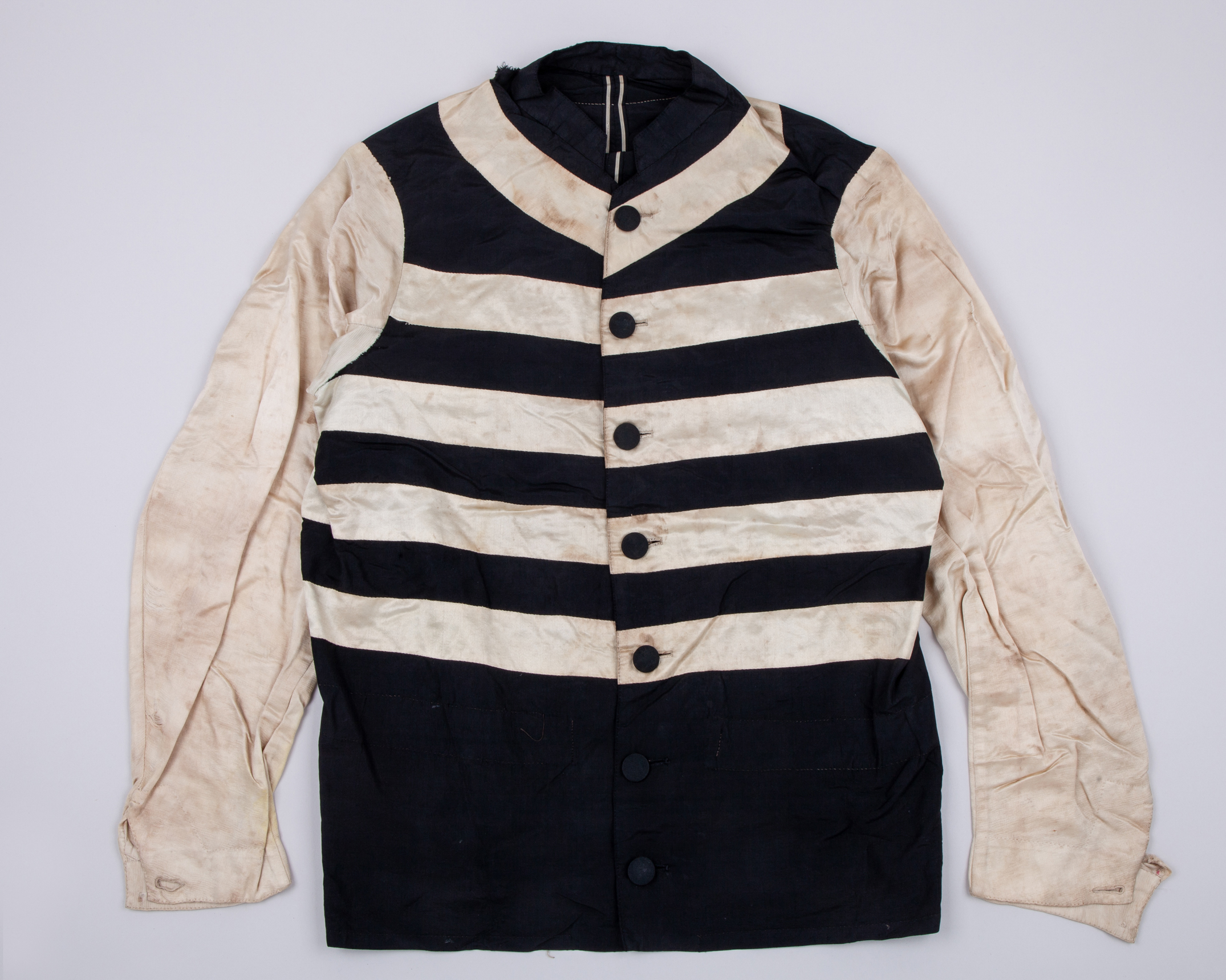 white with black hoops to body, black buttons, cuff buttons white, some tears and stains to silk, but overall in good condition for age