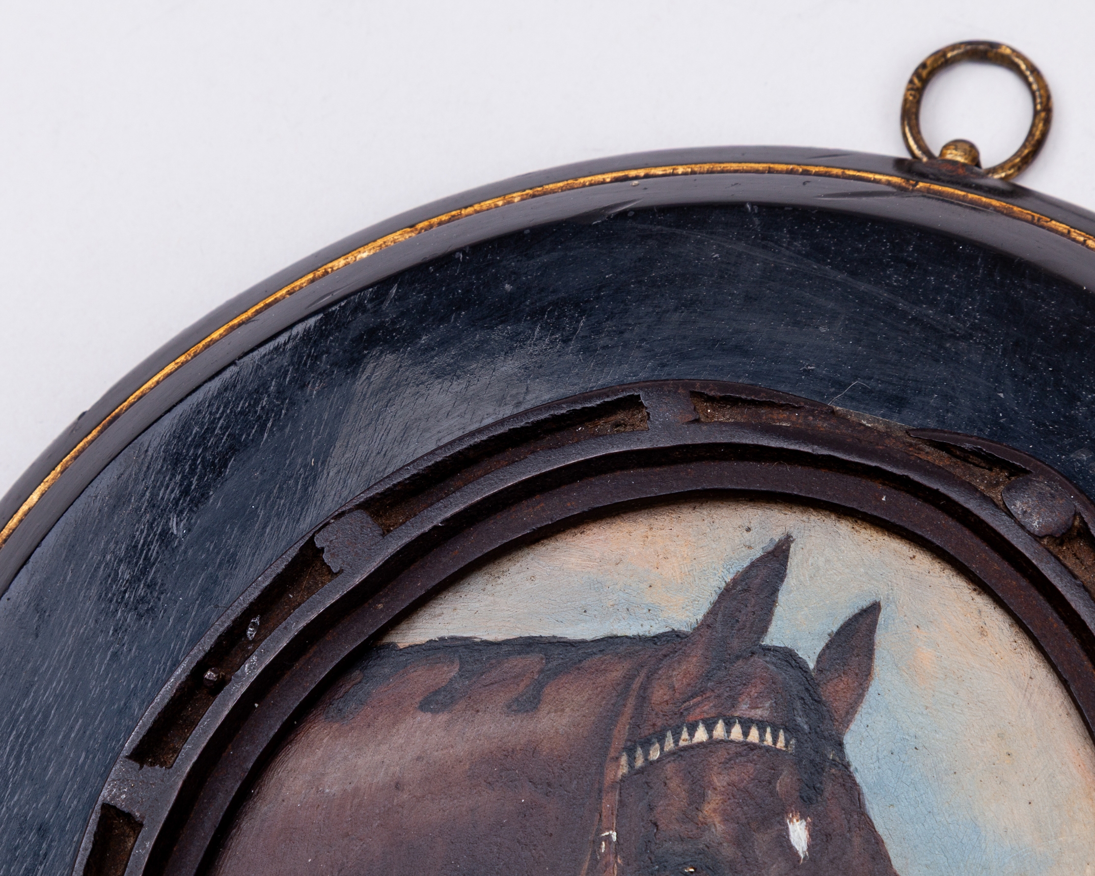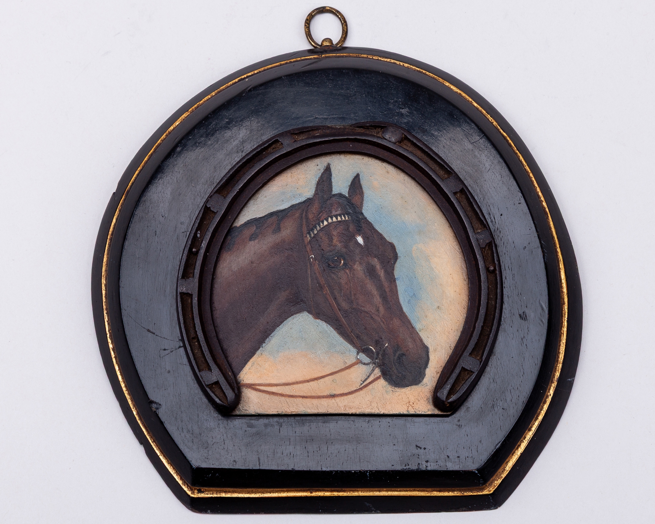 Horse shoe of the great 19th century racehorse and stallion St Simon mounted around an oil on metal portrait by the artist Rosa Corder (British, 1853-1893),
