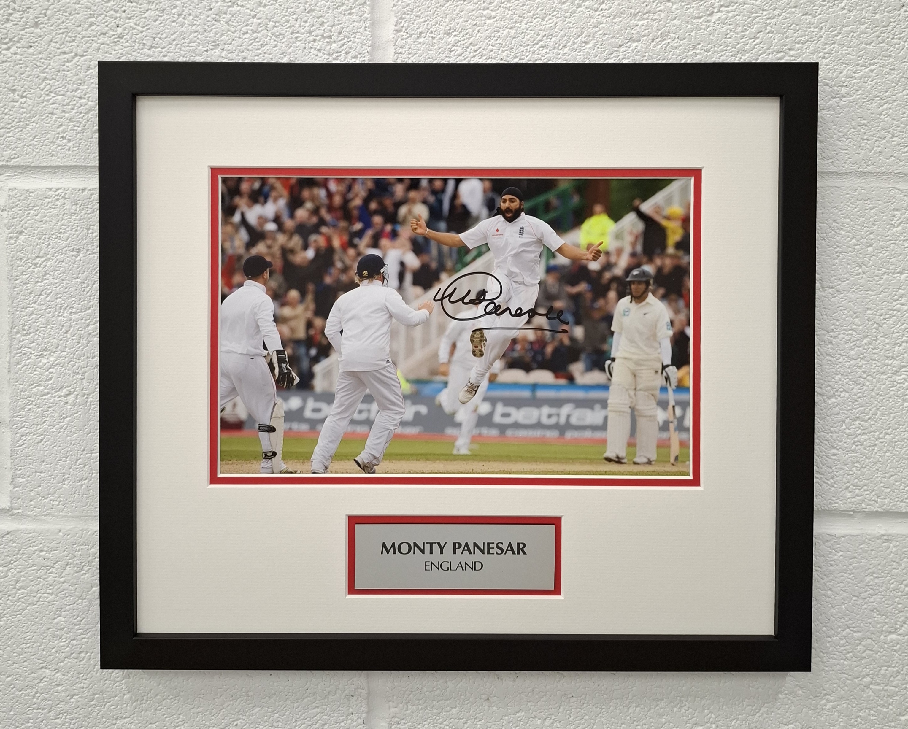 Own a striking piece of cricket memorabilia with this officially signed 15 x 17in. framed and glazed photograph of Monty Panesar, England’s charismatic left-arm spinner.