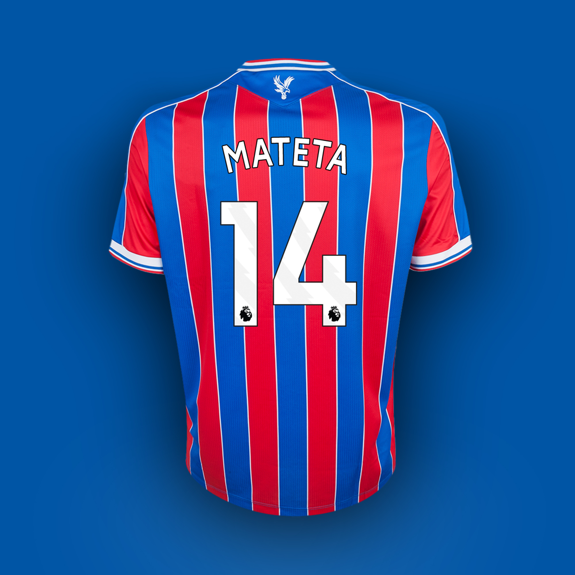 Jean-Philippe Mateta red and blue No.14 Crystal Palace v. Manchester United match issued shirt, Premier League 2025, Macron, with crew-neck collar and printed badge, the reverse lettered MATETA, the right sleeve with Premier League logo
