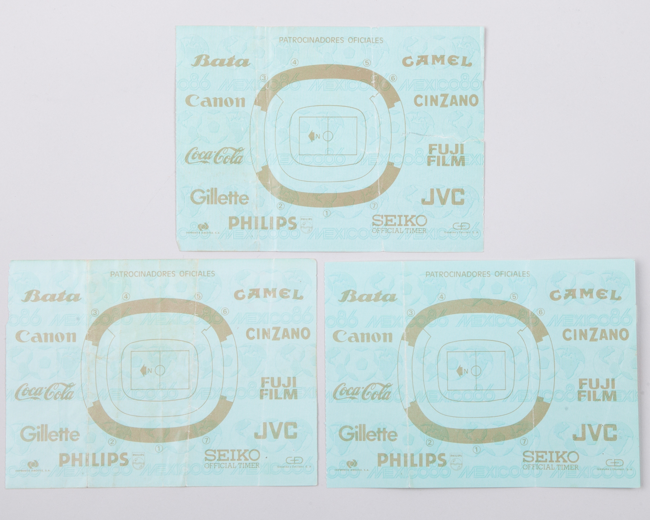 Hand of God England v Argentina World Cup Quarter Final match, June 22nd 1986, in Mexico City, 1986 World Cup Final, Argentina v. Germany ticket, 29th June, and England v. Paraguay ticket 18th June, all with folds (3)