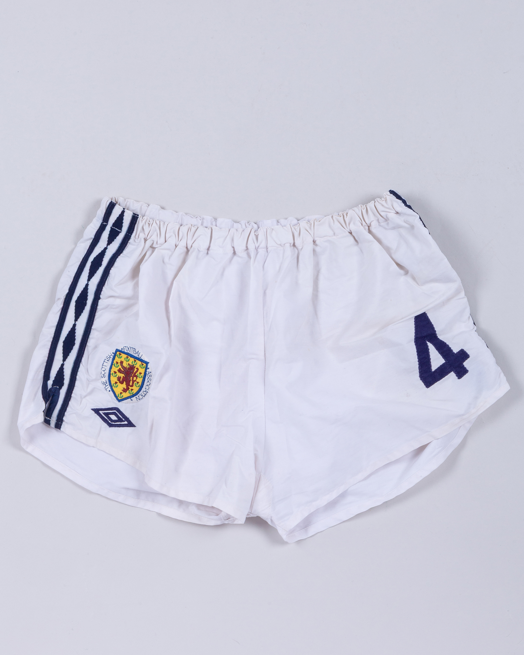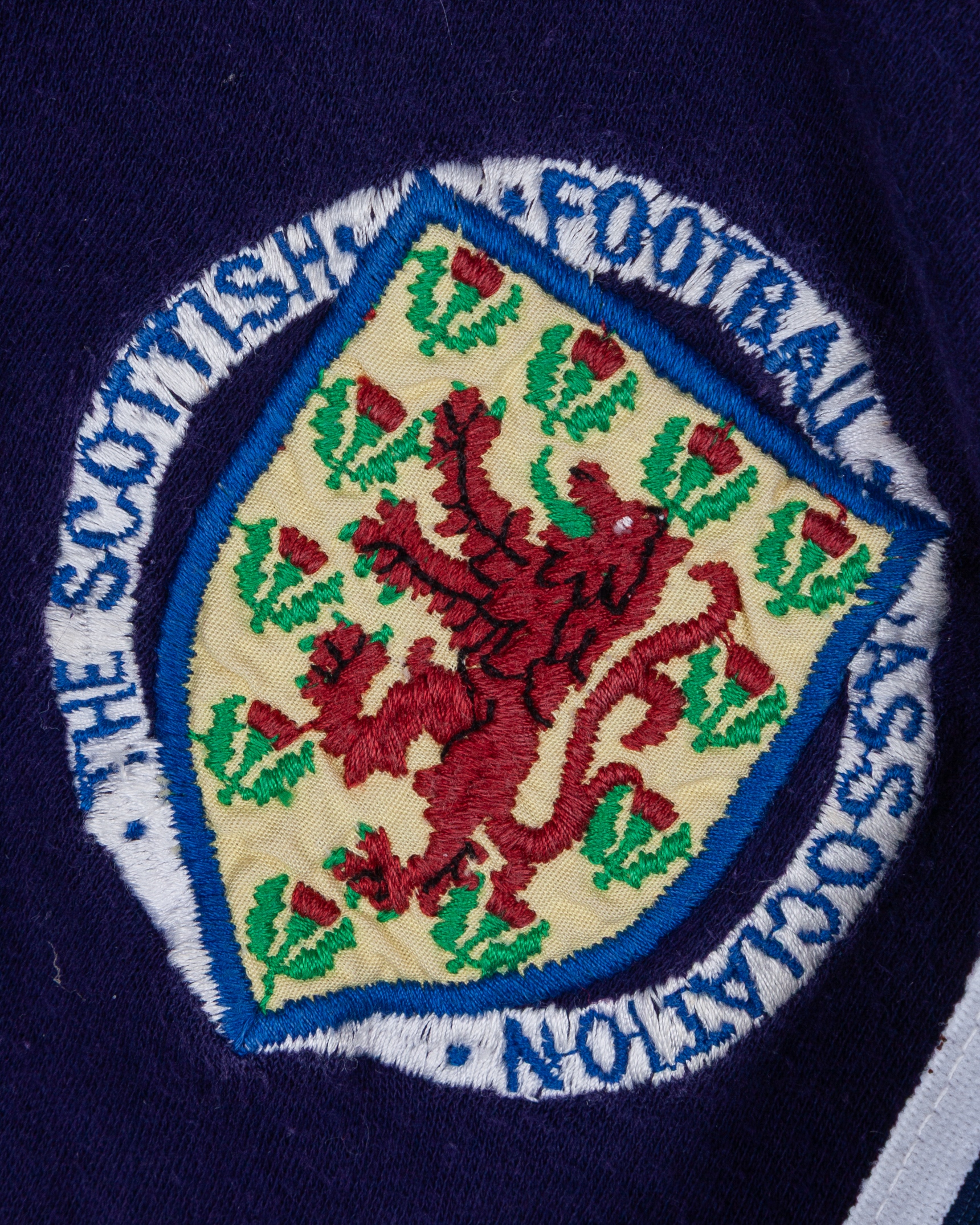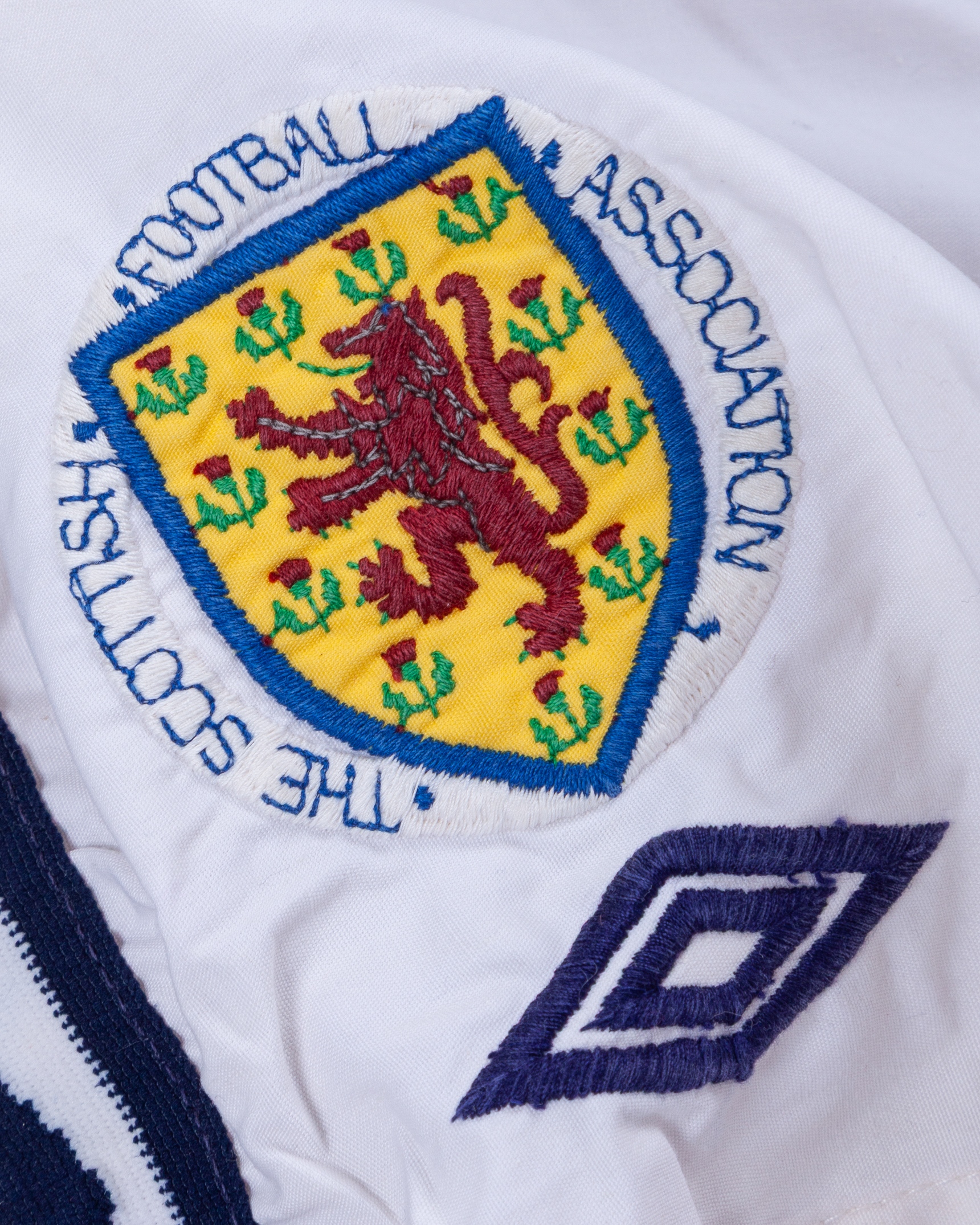 blue and white No.4 Scotland match worn long-sleeved shirt, late 1970s, Umbro, Mens, with v-neck style collar and embroidered badge inscribed THE SCOTTISH FOOTBALL ASSOCIATION, with a pair of match shorts (2)