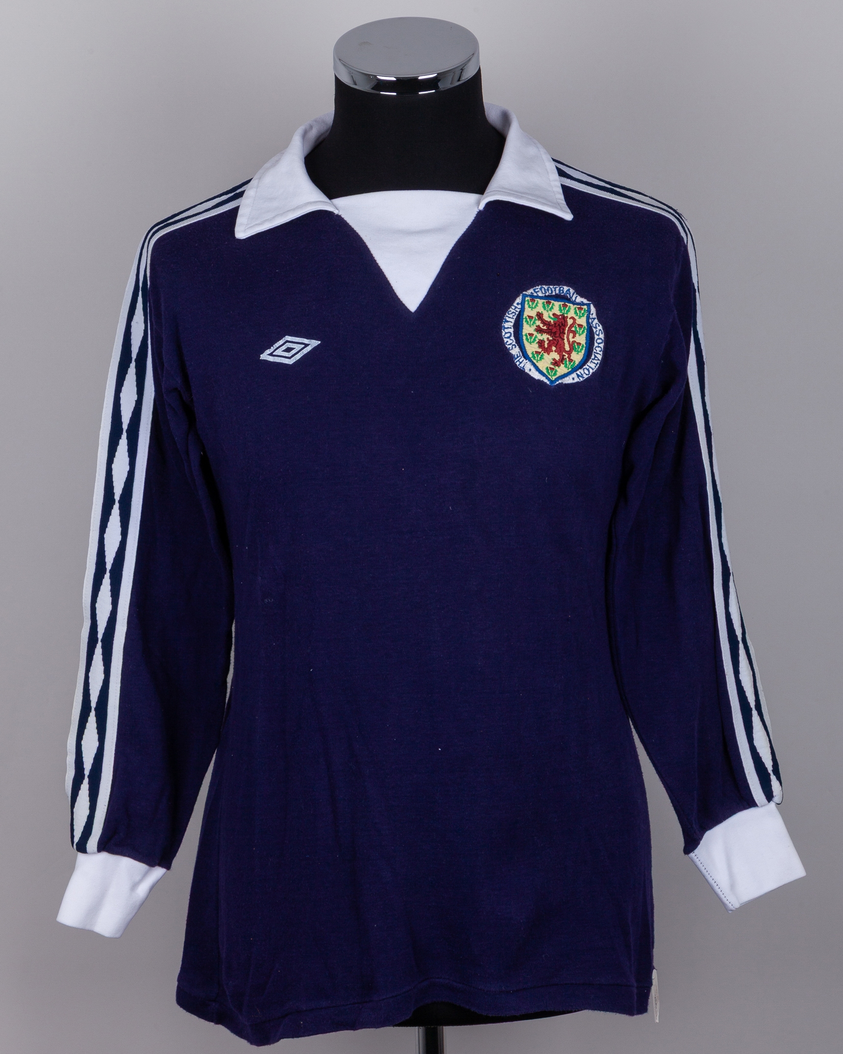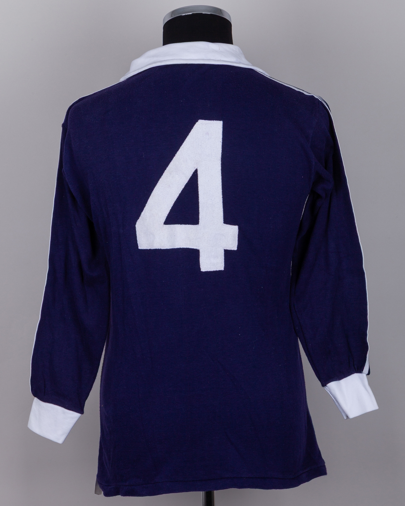Gordon McQueen blue and white No.4 Scotland match worn long-sleeved shirt, late 1970s