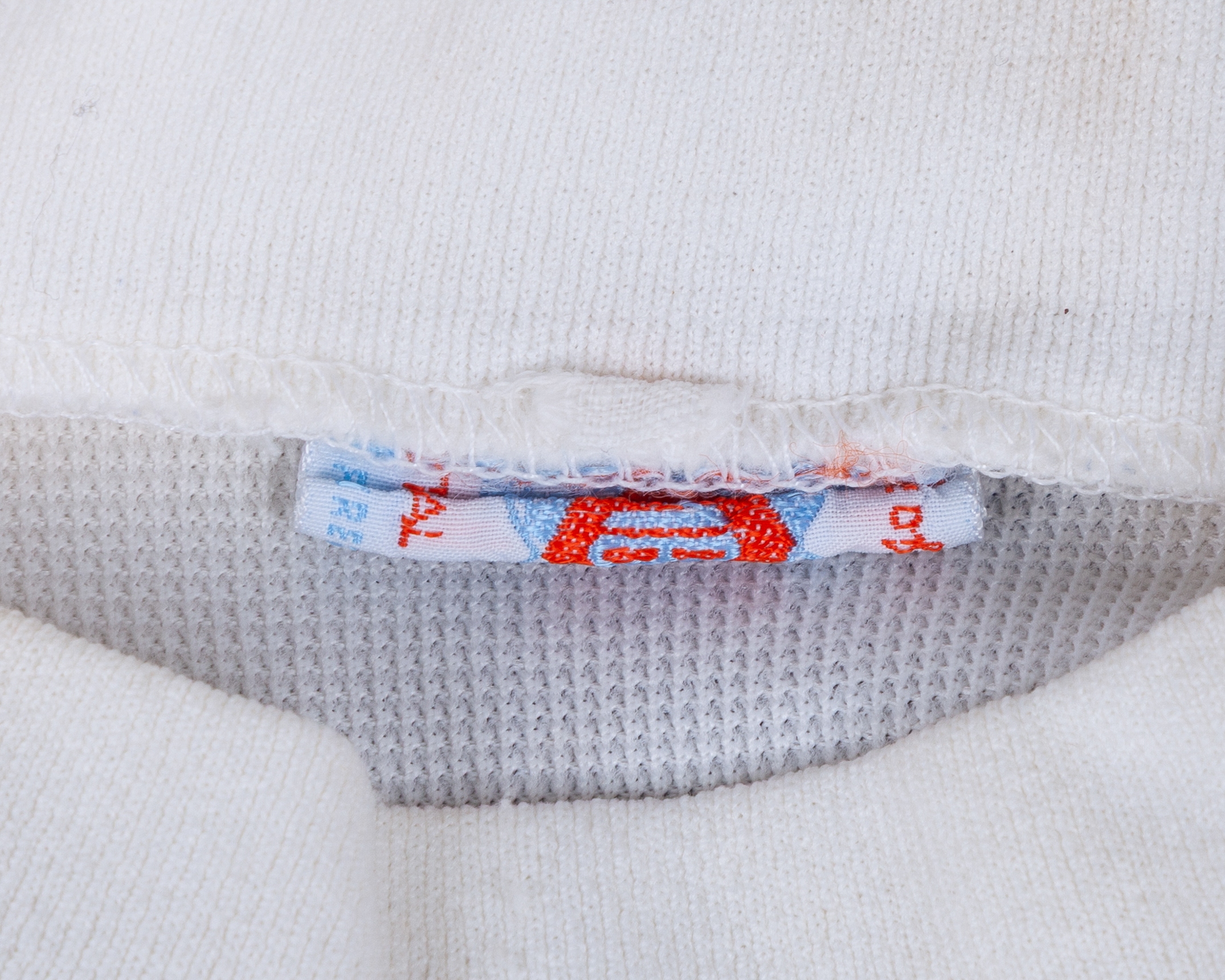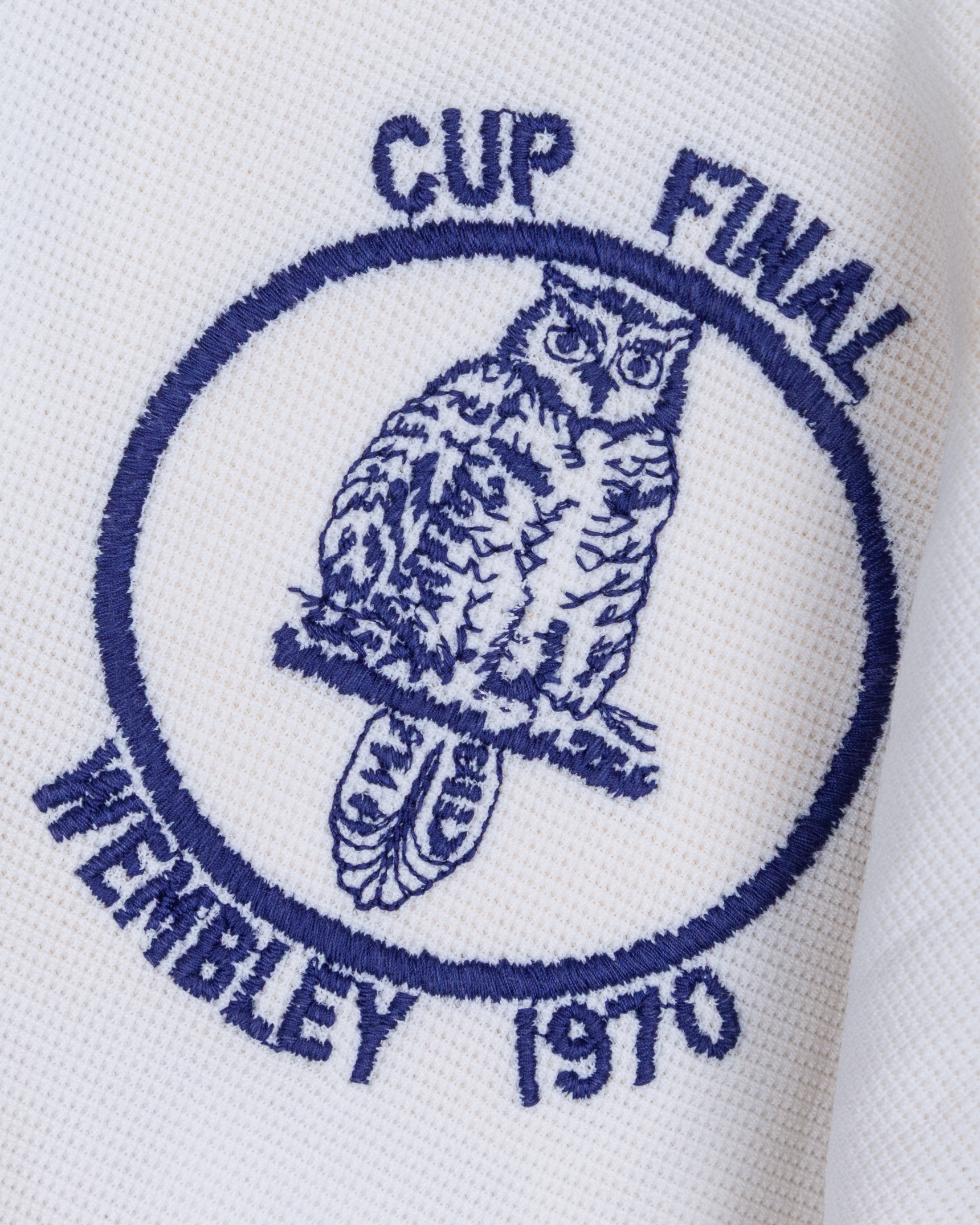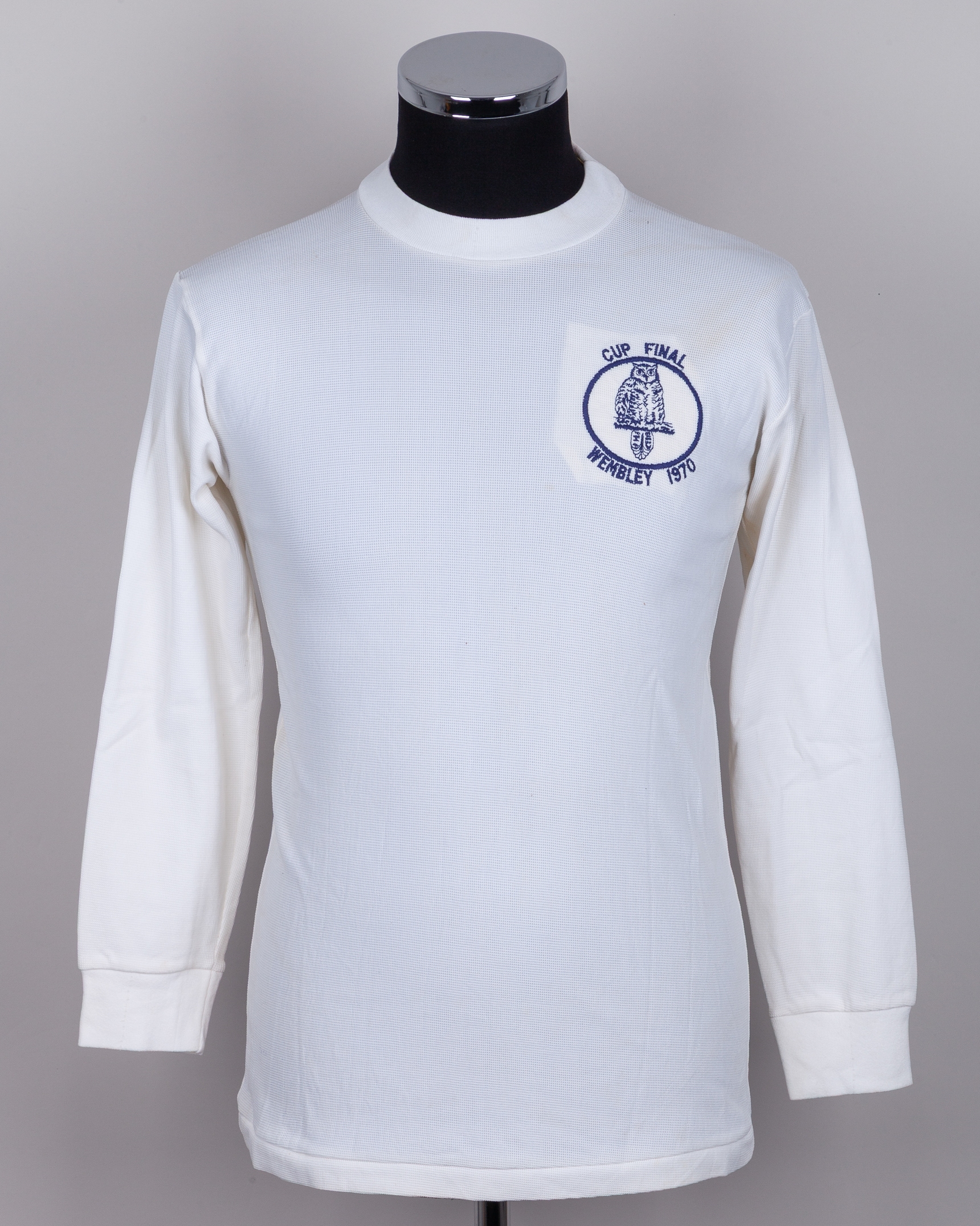 Johnny Giles white No.10 Leeds United v. Chelsea F.A.Cup final match worn long-sleeved shirt, 1970, Umbro, with crew-neck collar and embroidered badge inscribed CUP FINAL WEMBLEY 1970, some discolouration