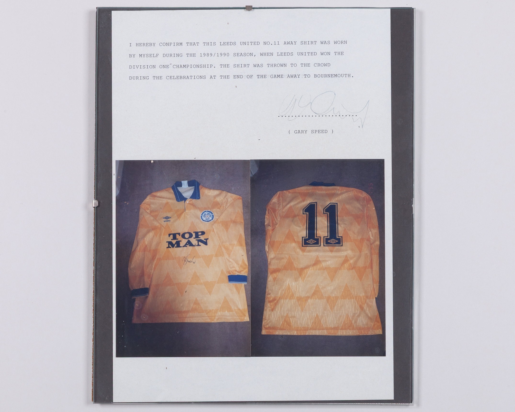 Gary Speed yellow and blue No.11 Leeds United v. Bournemouth match worn long-sleeved shirt, 1990, Umbro, Large, with button-up collar and embroidered cloth badge inscribed LEEDS UNITED AFC, with signed letter of authenticity from Gary Speed stating he wore in the match against Bournemouth on 5th May 1990 when Leeds United won the league