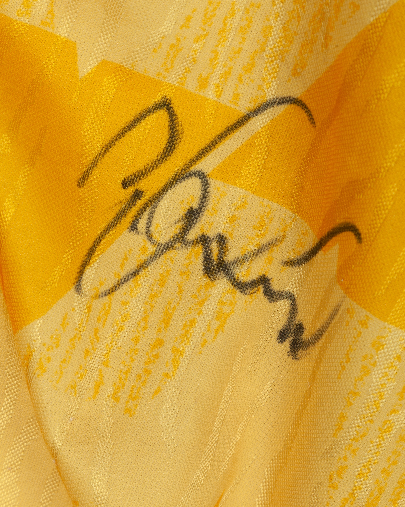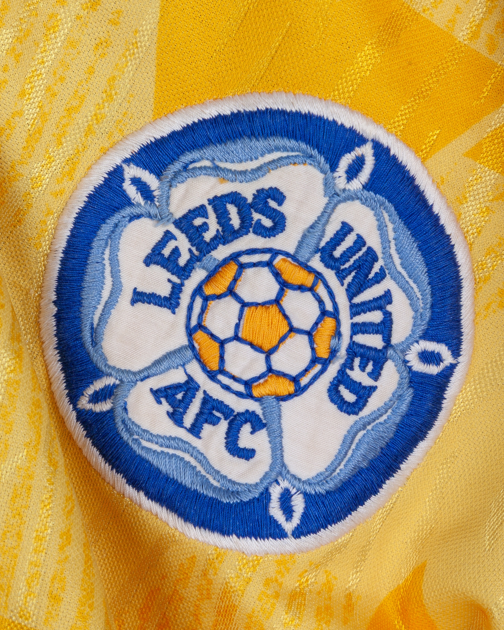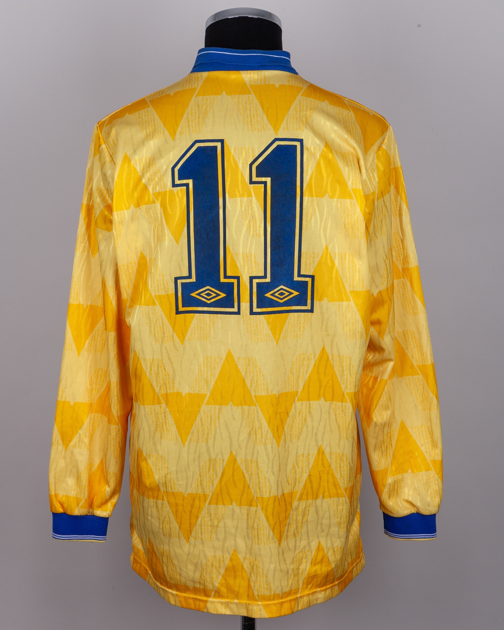 Gary Speed yellow and blue No.11 Leeds United match worn long-sleeved shirt, 1990