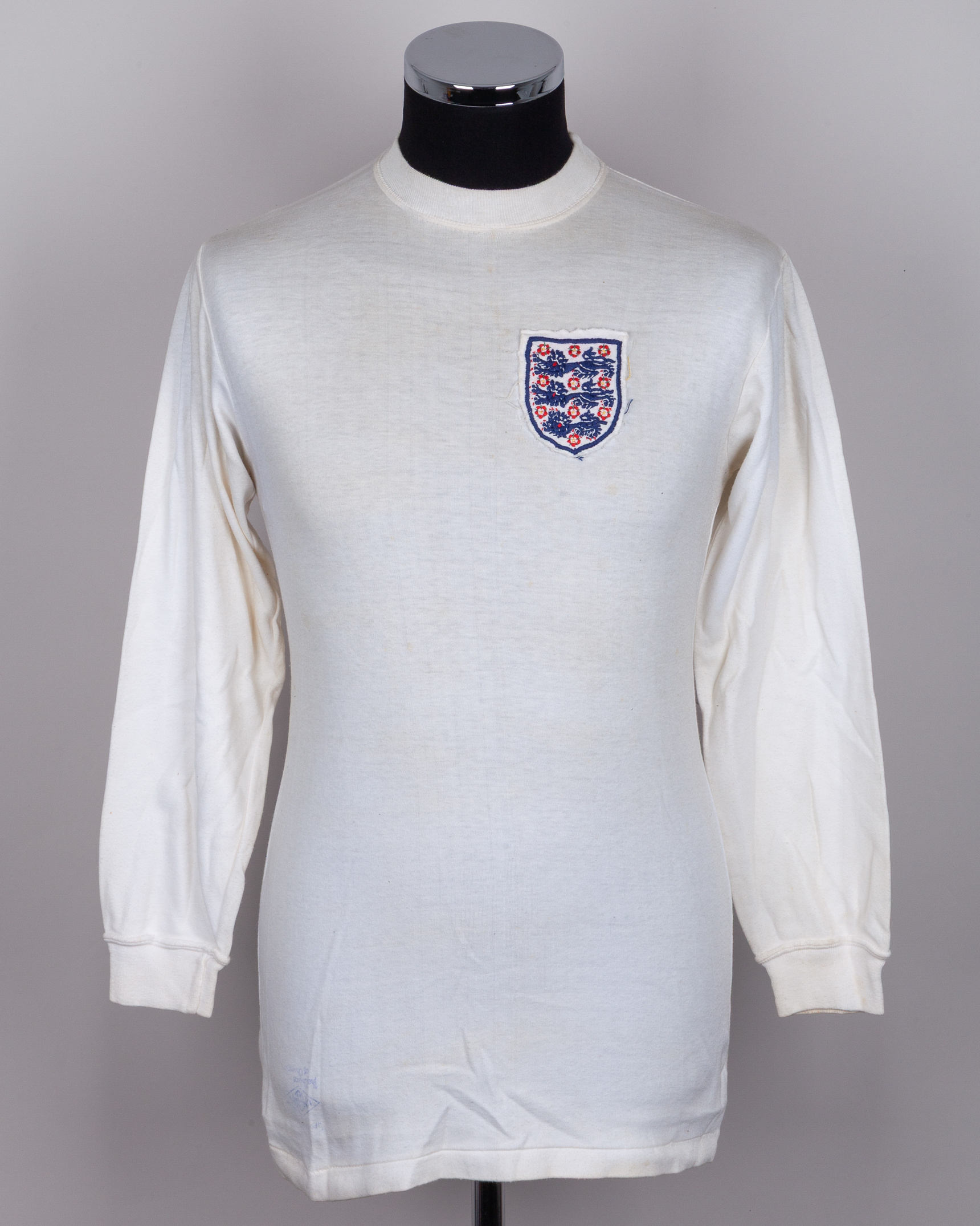 Norman Hunter white No.11 England long-sleeved shirt, circa 1967-68, Umbro, M, with crew-neck collar and embroidered cloth badge
