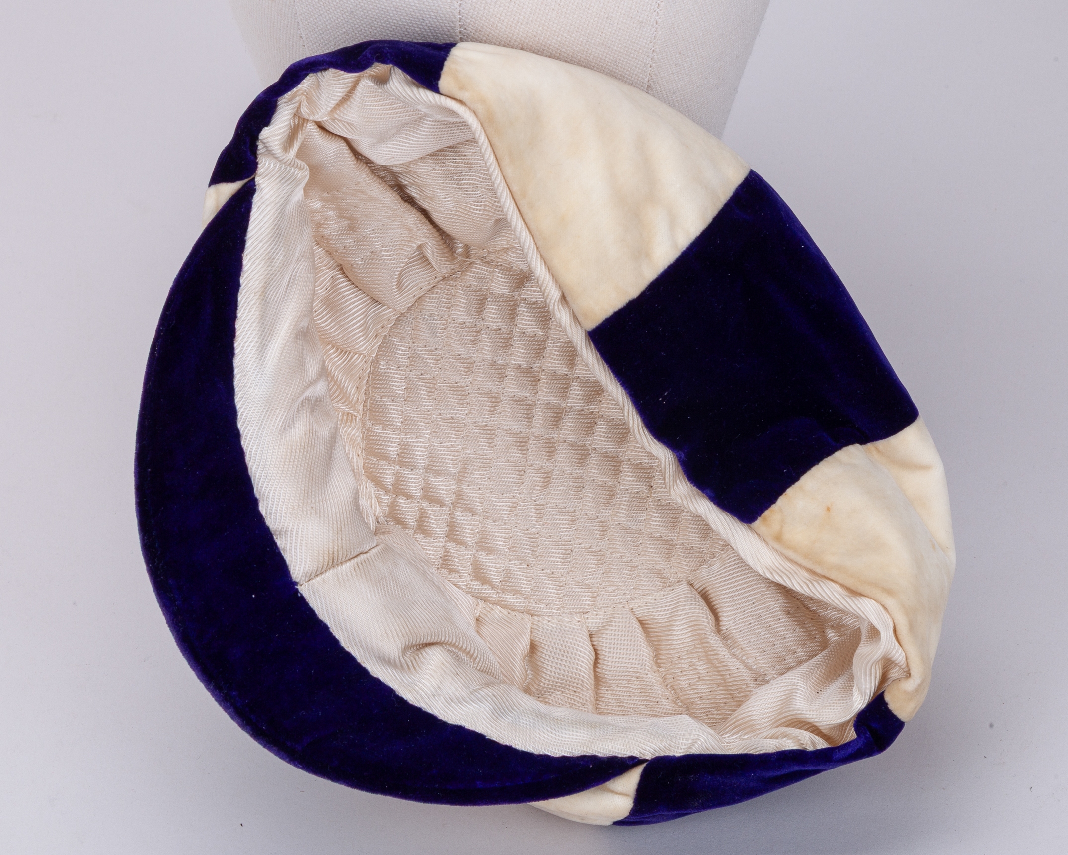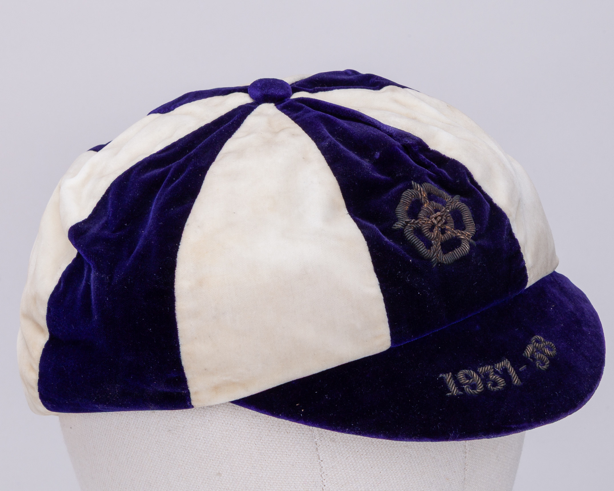 Bert Sproston blue and white England v. Czechoslovakia International cap, 1937-38, the peak embroidered 1937-38 and a itinerary card (2)