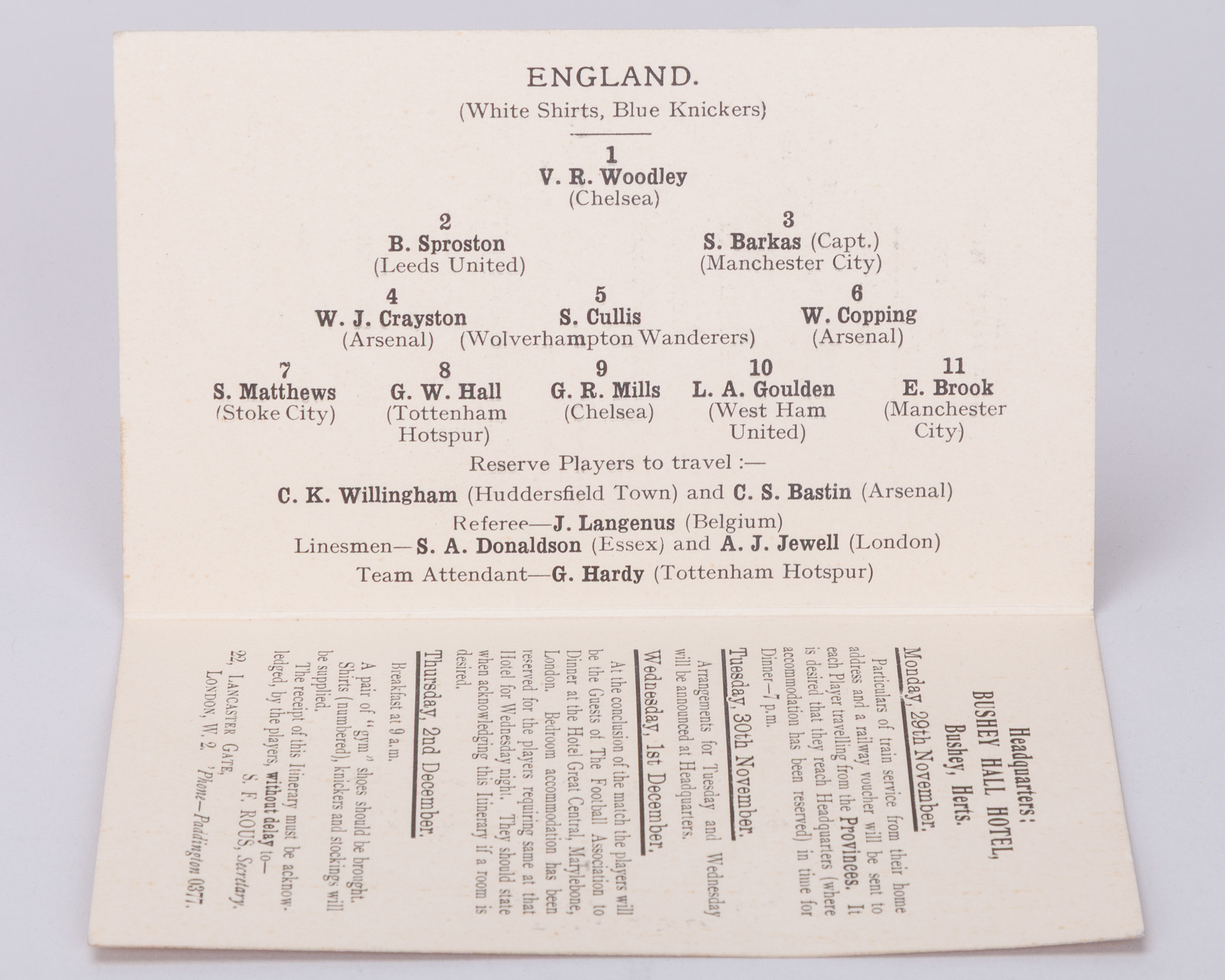 The above cap represents Bert's fourth appearance for England in the match played on 1st December 1937 at White Hart Lane, England defeated the Czechs 5-4