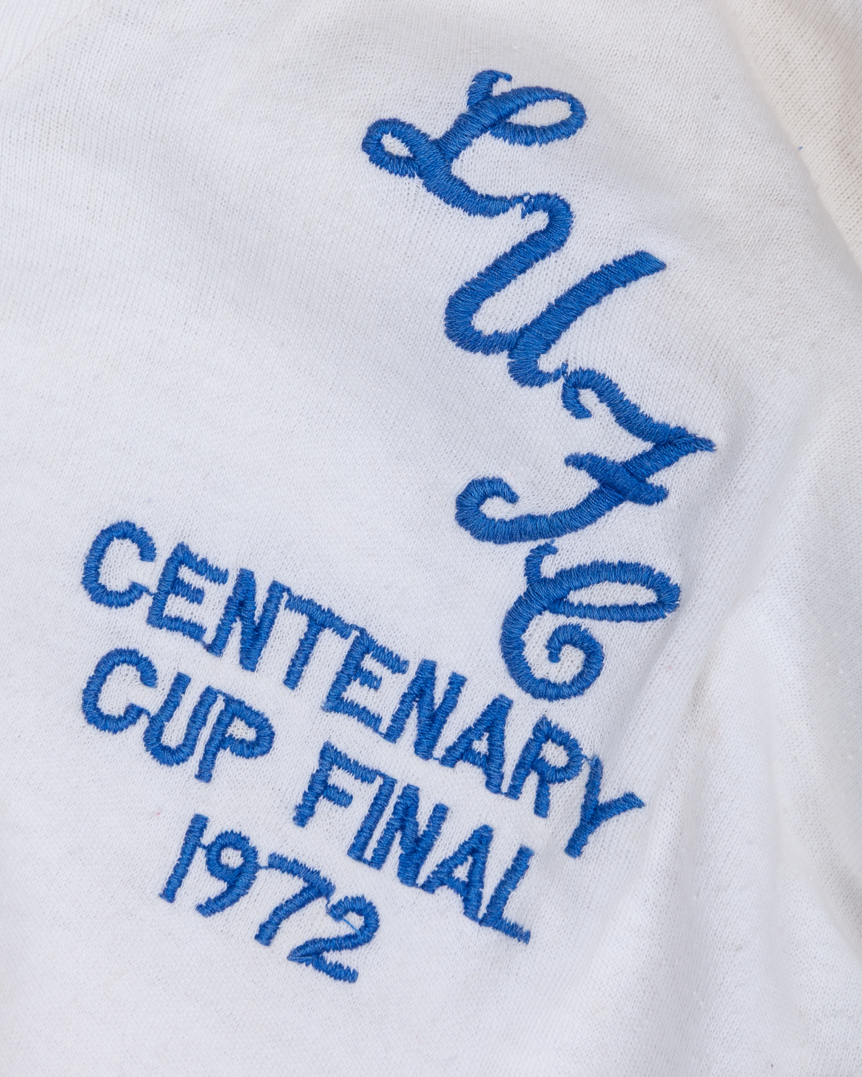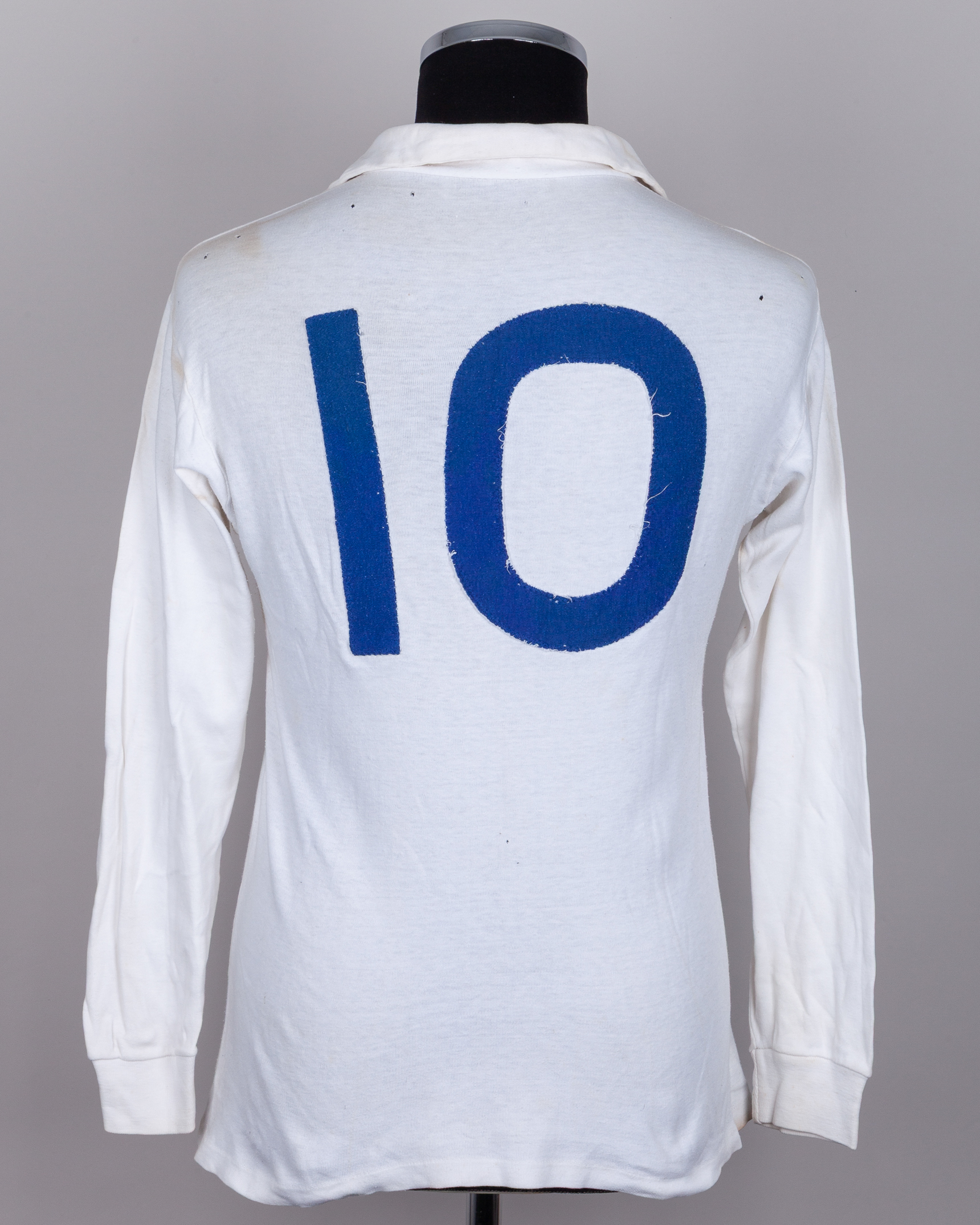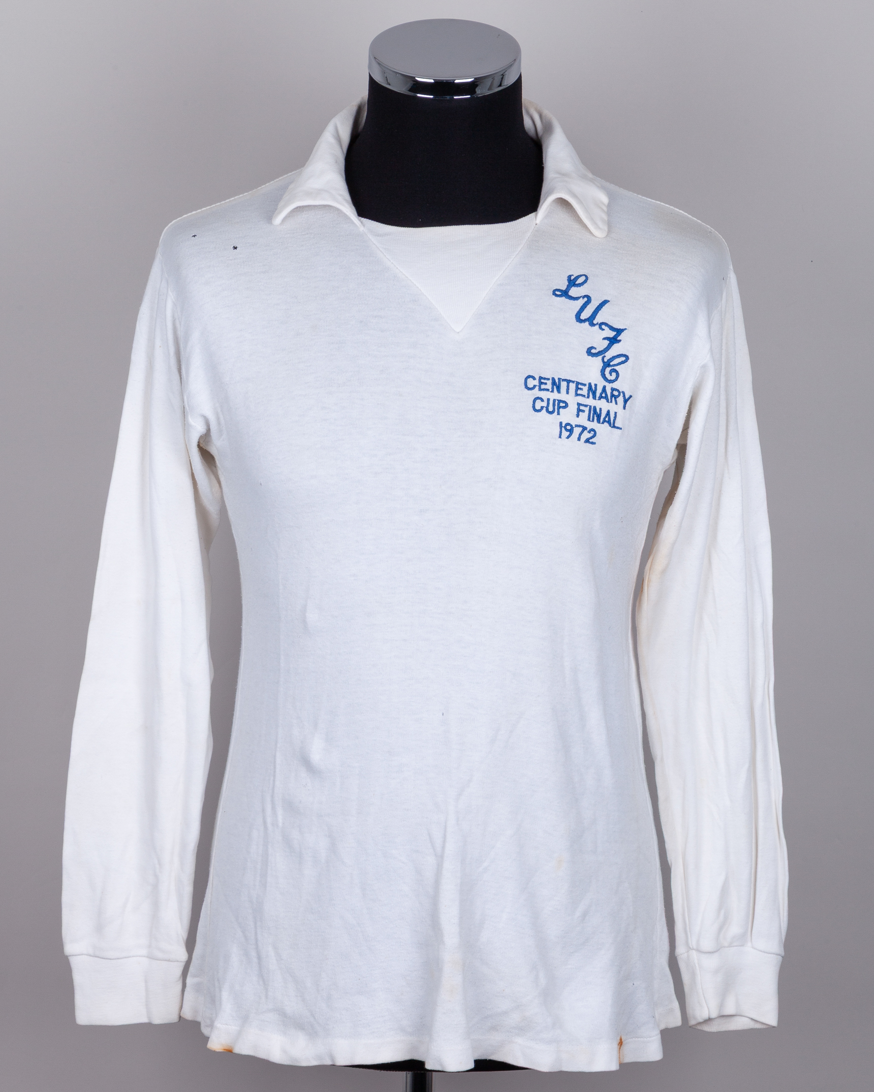 White No.10 Leeds United 1972 F.A.Cup Centenary Cup Final long-sleeved shirt, Umbro, with v-neck collar and embroidered badge inscribed LUFC CENTENARY CUP FINAL 1972, staining and wear