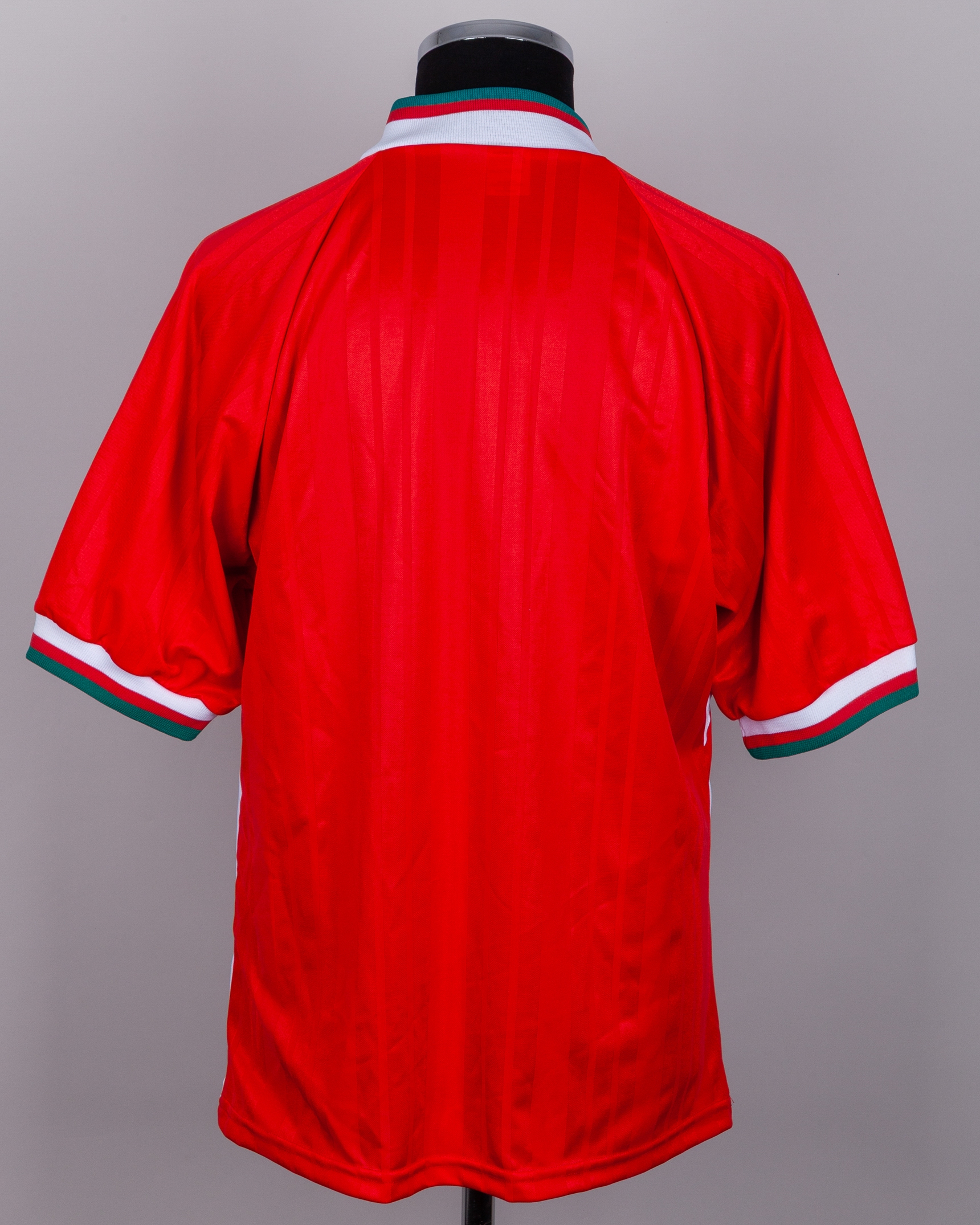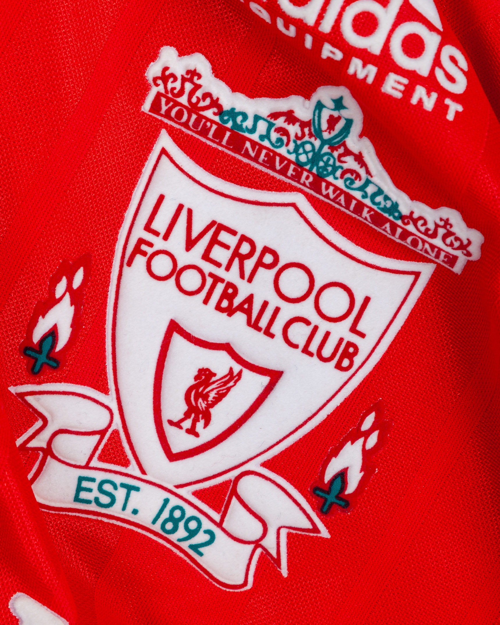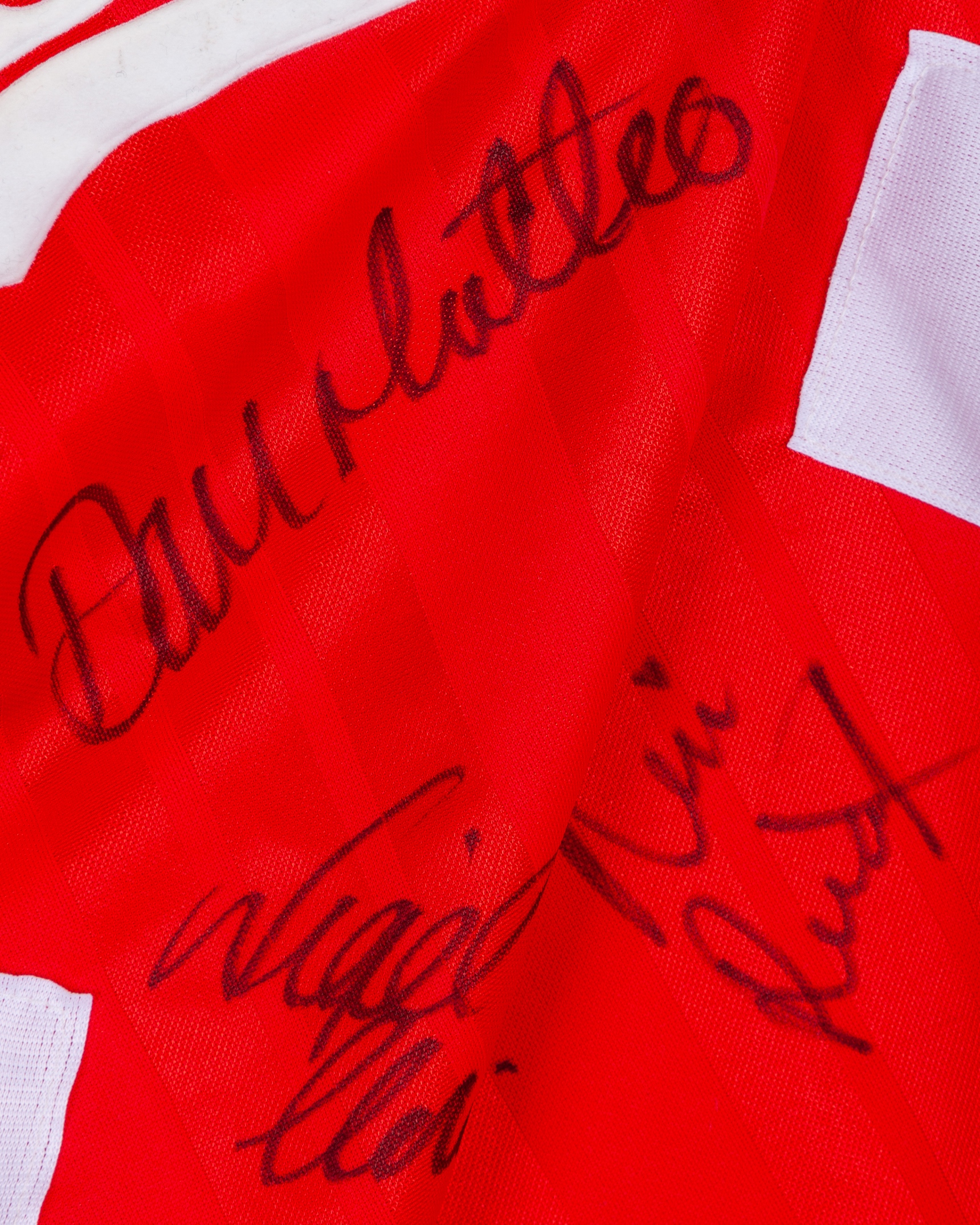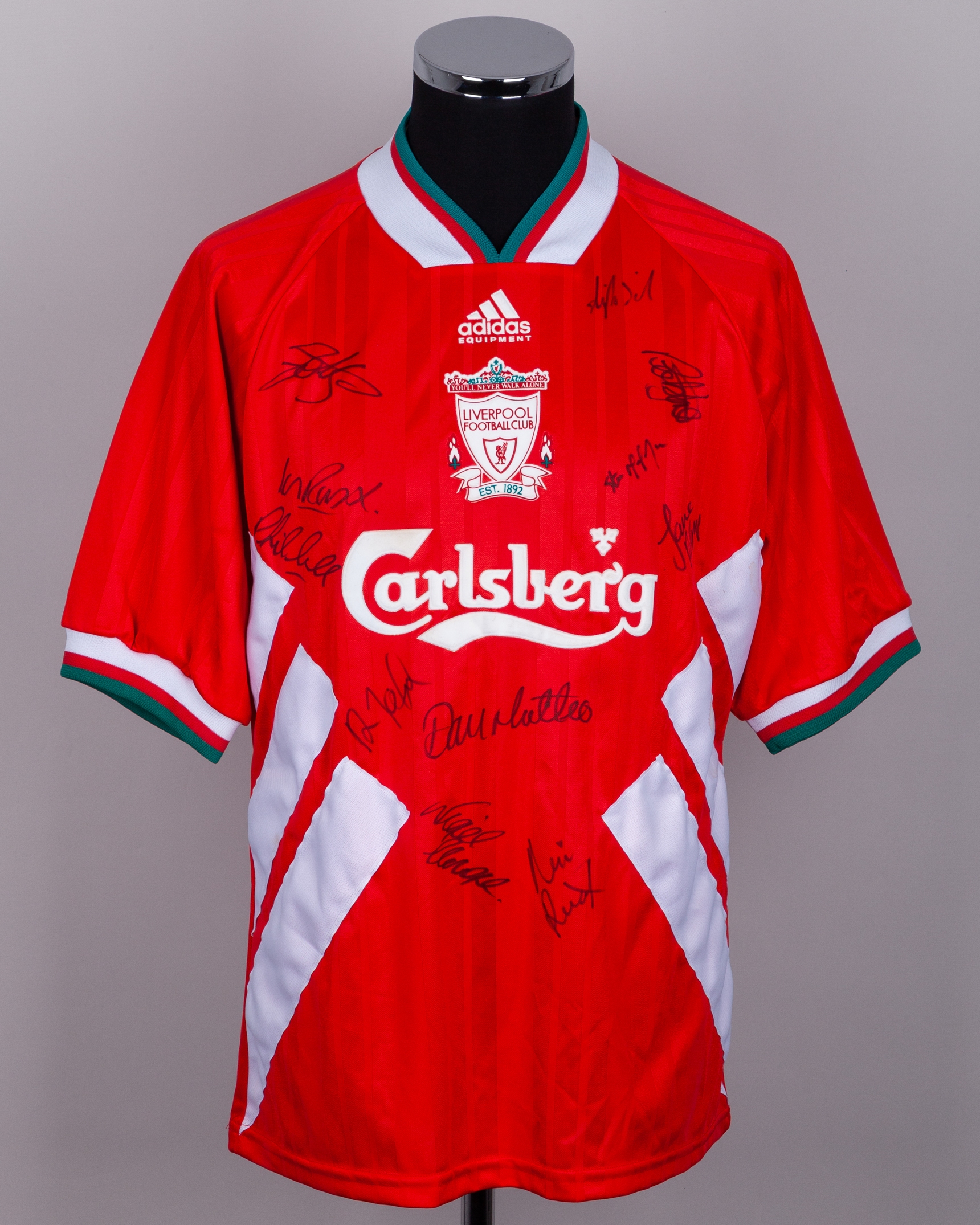 A red replica Liverpool autographed shirt, 1993-95, the front bearing eleven autographs