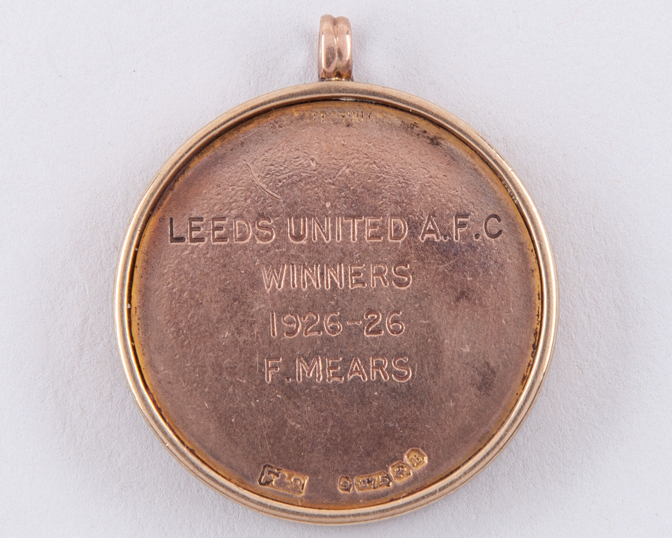 Frank Mears 9ct gold and enamel West Riding County Winners medal, 1926, the obverse inscribed WEST RIDING COUNTY F.A.SUPPLEMENTRY CUP 1926-27, the reverse inscribed LEEDS UNITED A.F.C., WINNERS 1926-26 (SIC), F. MEARS, 16grms