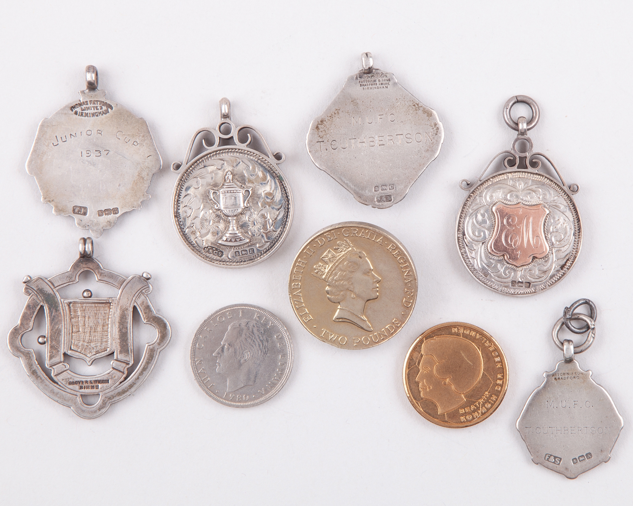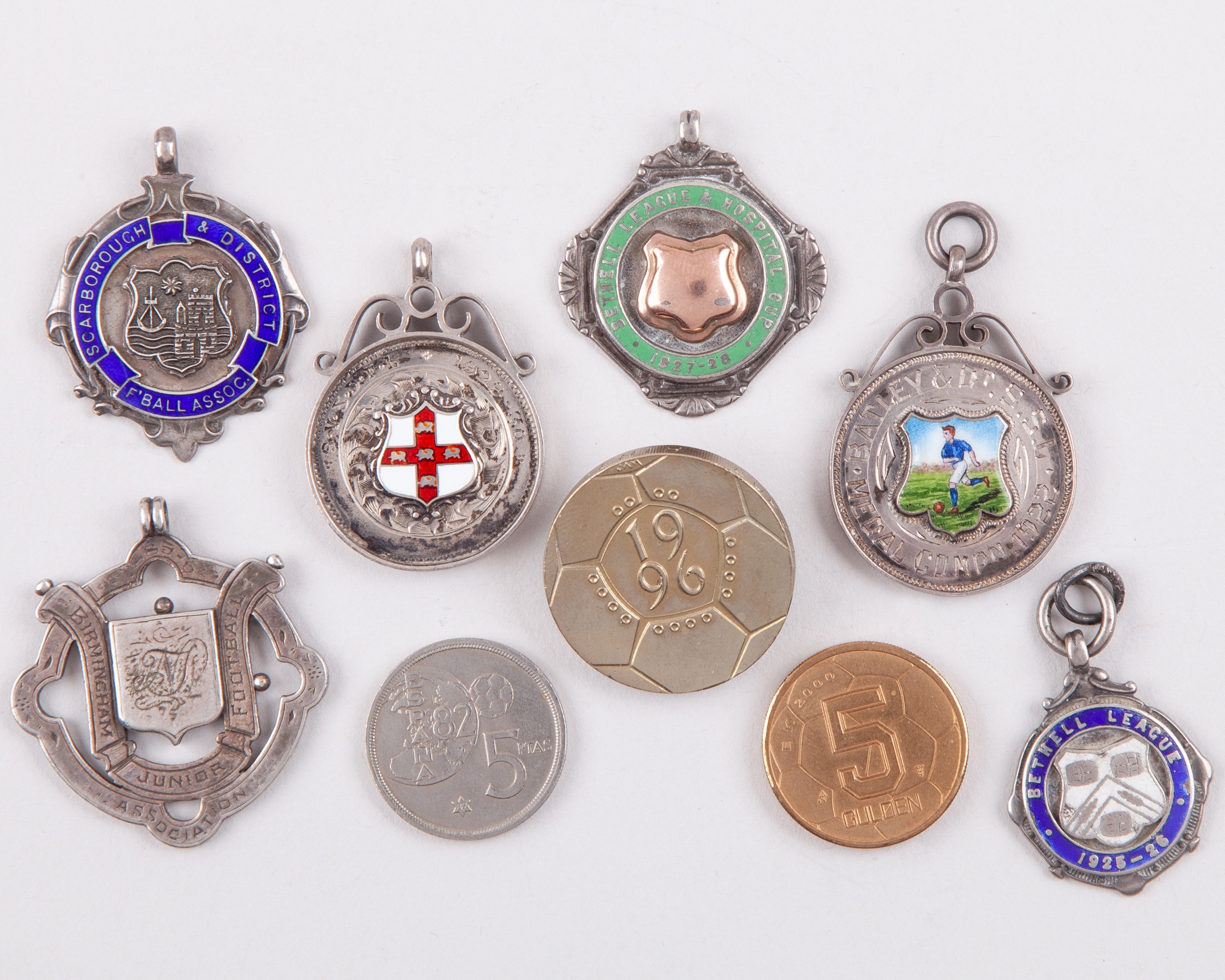 Five silver and enamel medals sporting medals, including Batley & Dt. S.S.L. Medal Competition, 1922, Scarborough & District Football Association etc and three sporting coins (9)