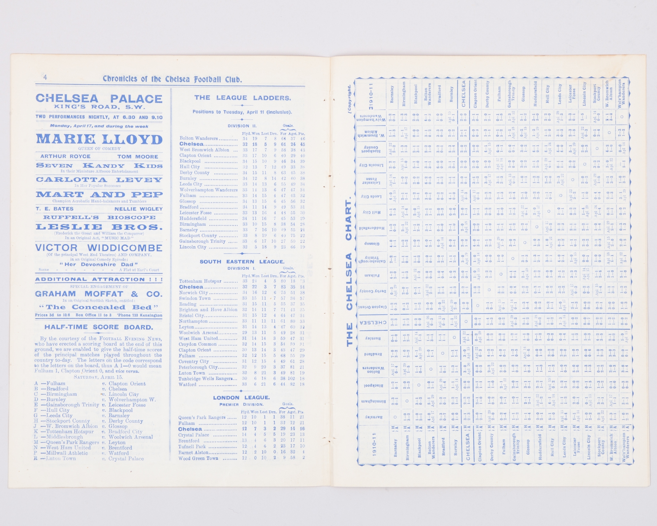 Chelsea v. Leeds City home match programme, 14th April 1911 and Chelsea v. Brighton & Hove Albion combined match programme, 15th April 1911, ex bound volume