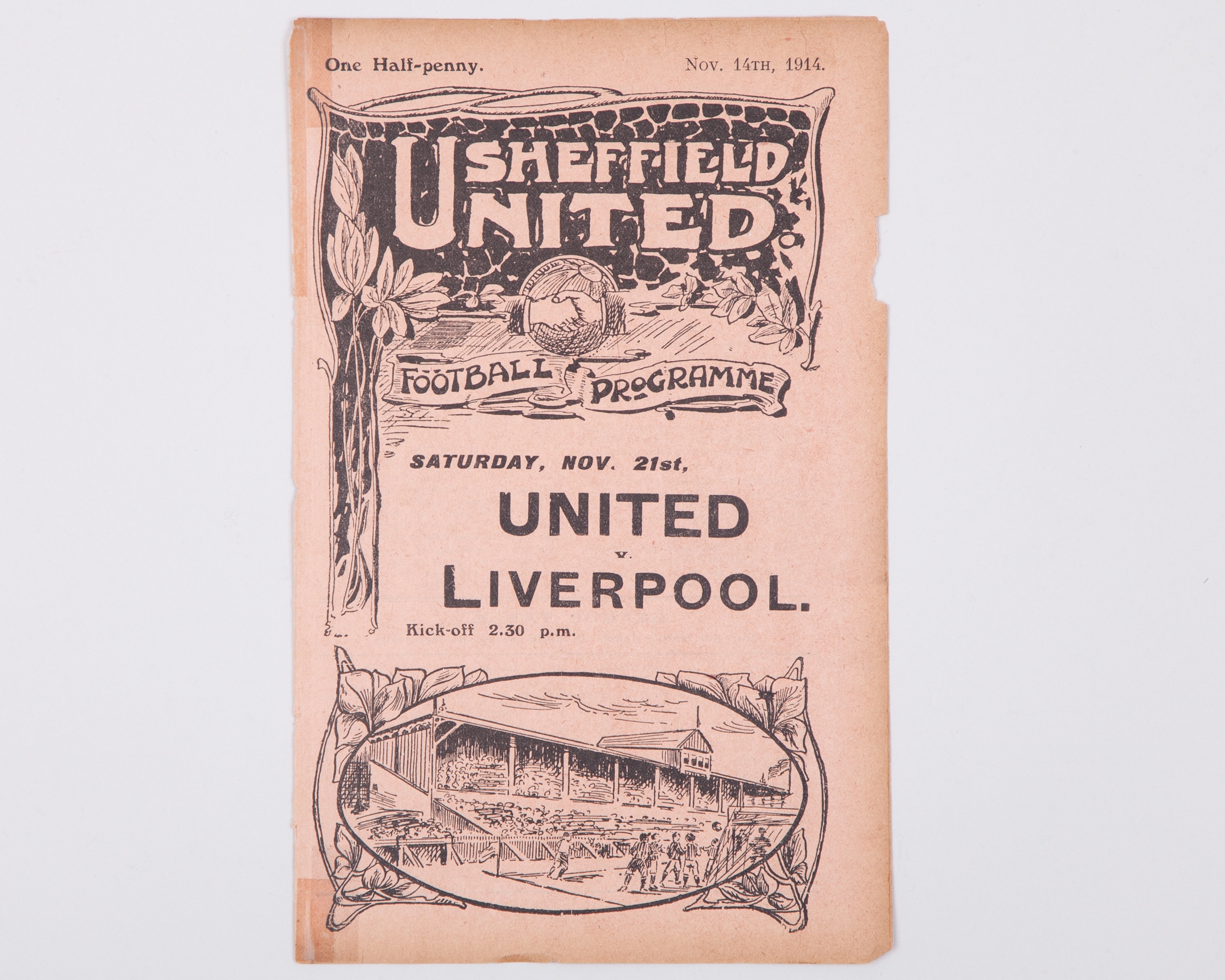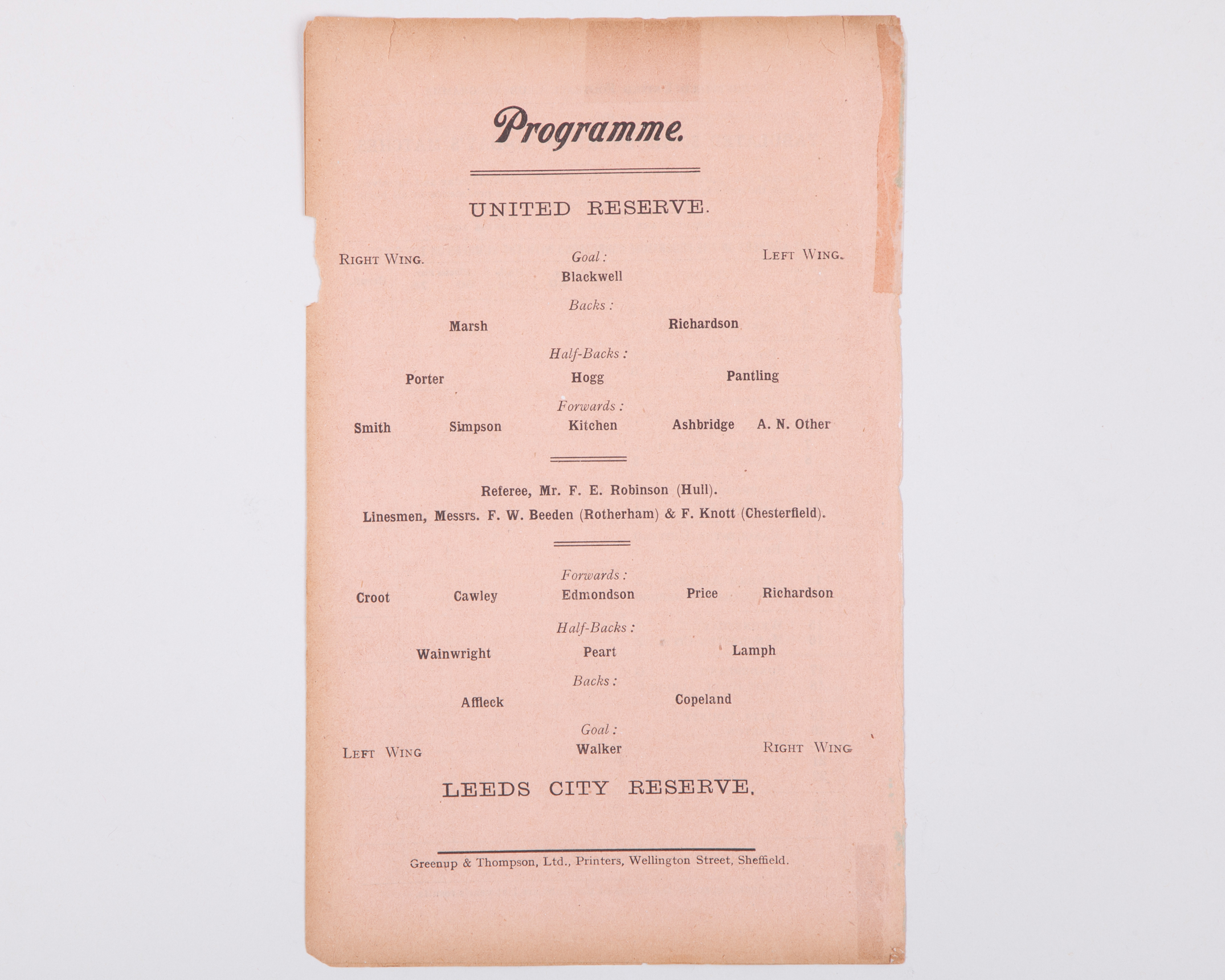 Sheffield United Reserves v. Leeds City Reserves match programme, 14th November 1914, tape repairs, wear to edges