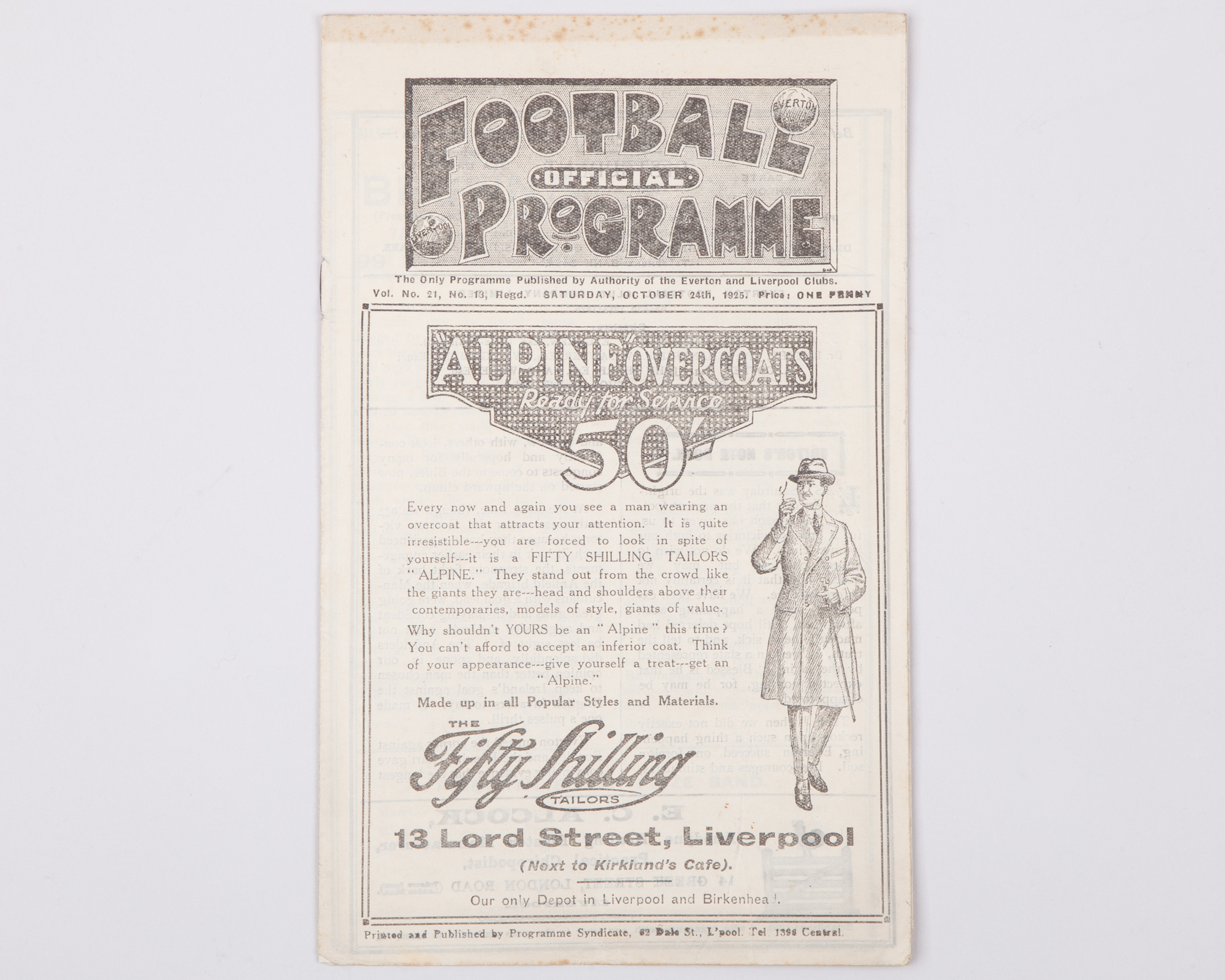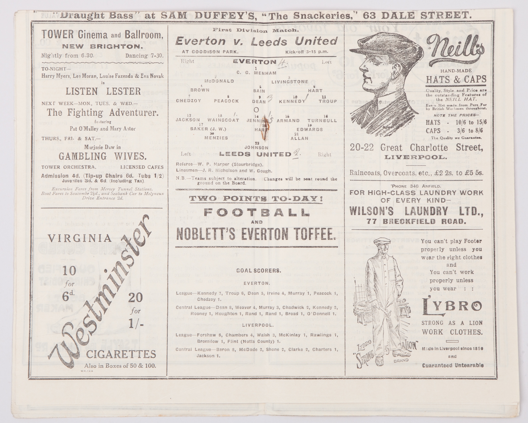 Everton v. Leeds United match programme, 24th October 1925, folds, rust staples, some slight staining to cover