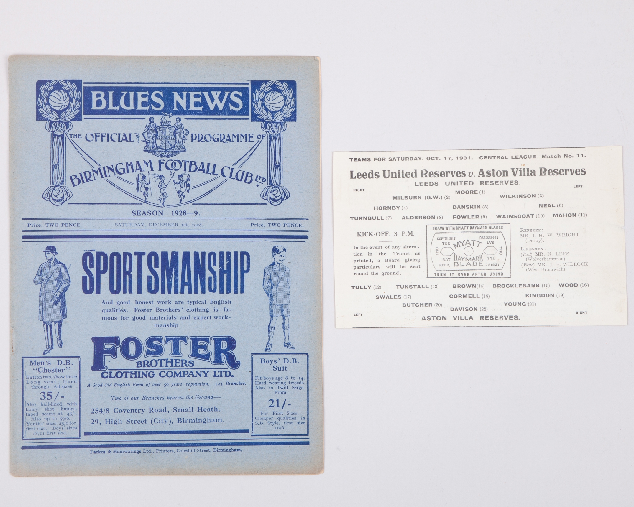 Birmingham Reserves v. Leeds United reserves, match programme, 1st December 1928, lacking staples, score on team page and a Leeds United Reserves v. Aston Villa Reserves, 17th October 1931, only trimmed page (2)