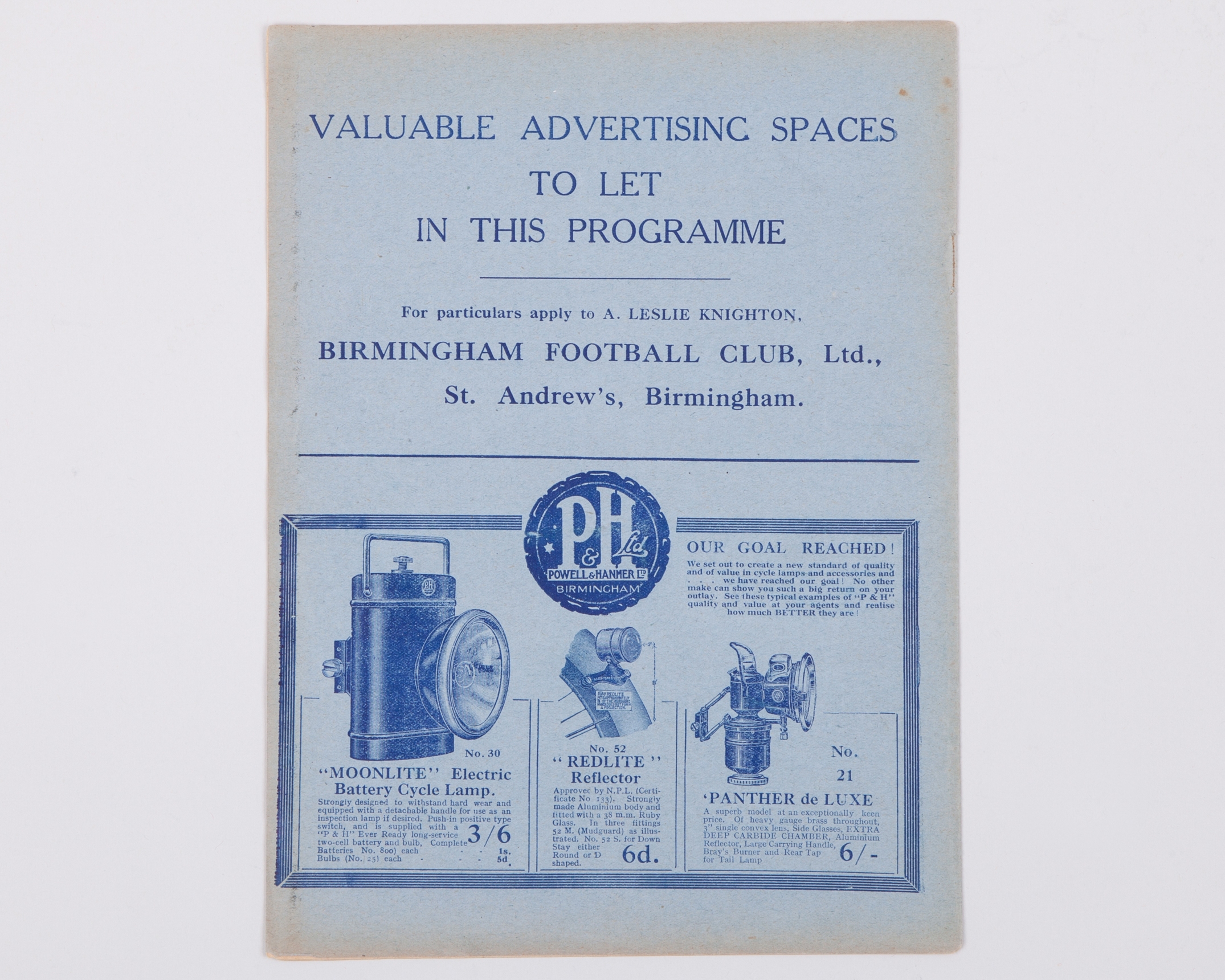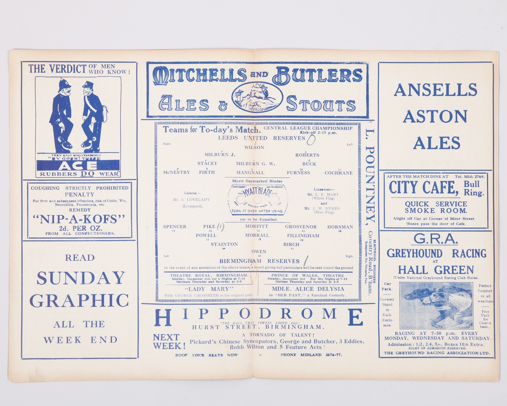 Birmingham Reserves v. Leeds United reserves, match programme, 1928