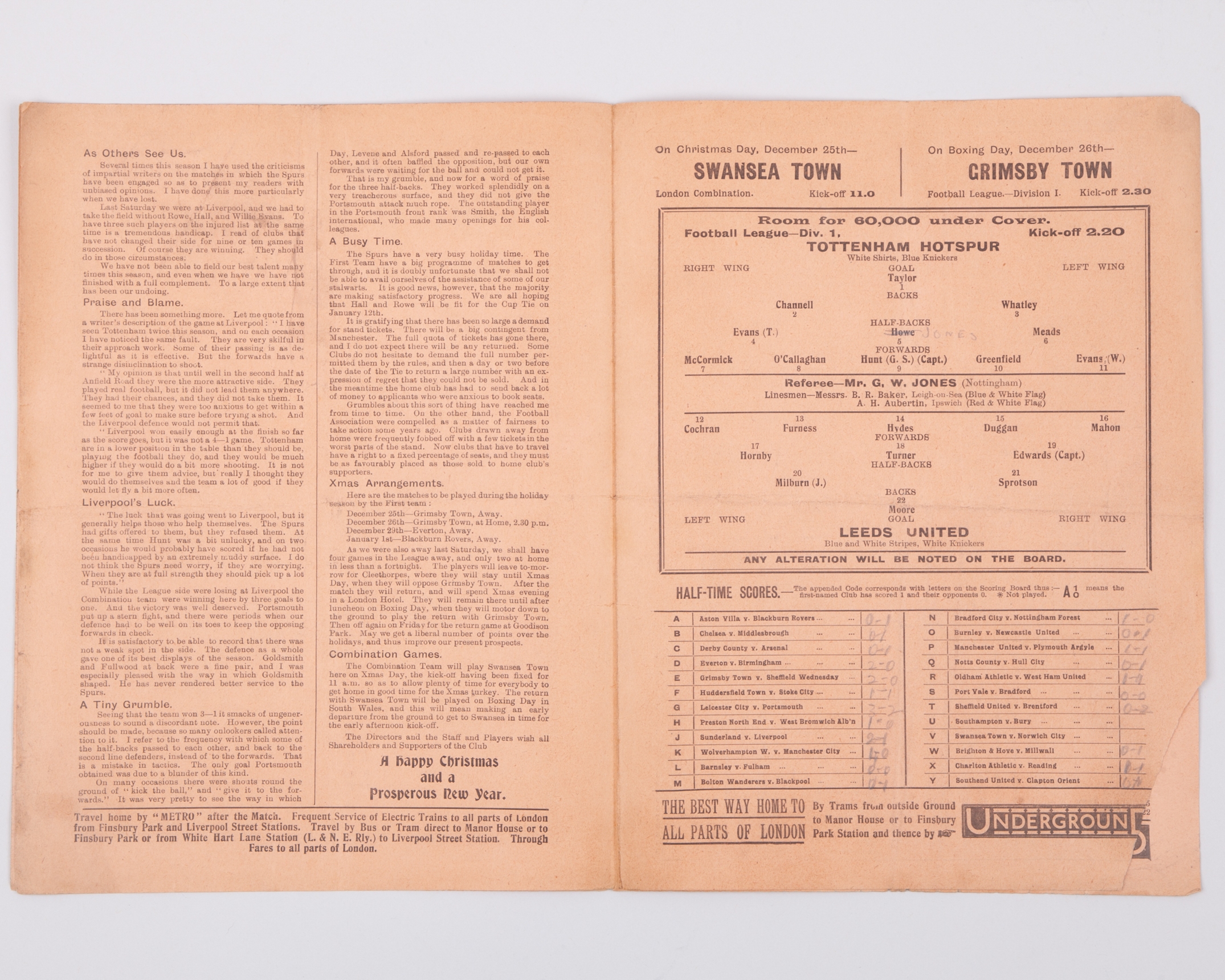 Two Tottenham Hotspur v. Leeds United match programmes, 1934, comprising 31st march 1934 and 22nd December 1934, folds, text on team page (2)