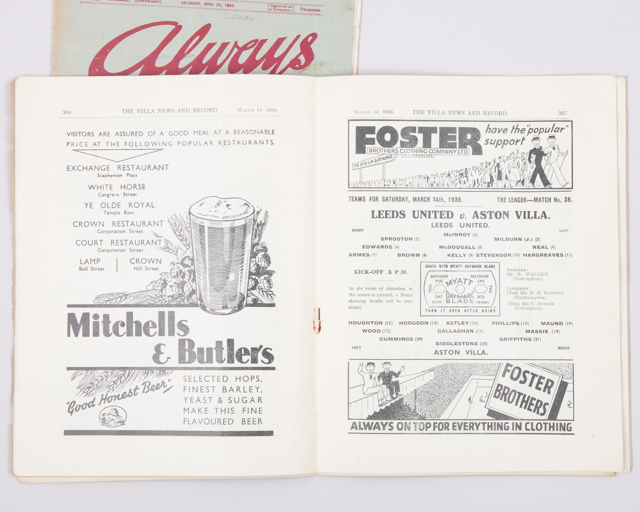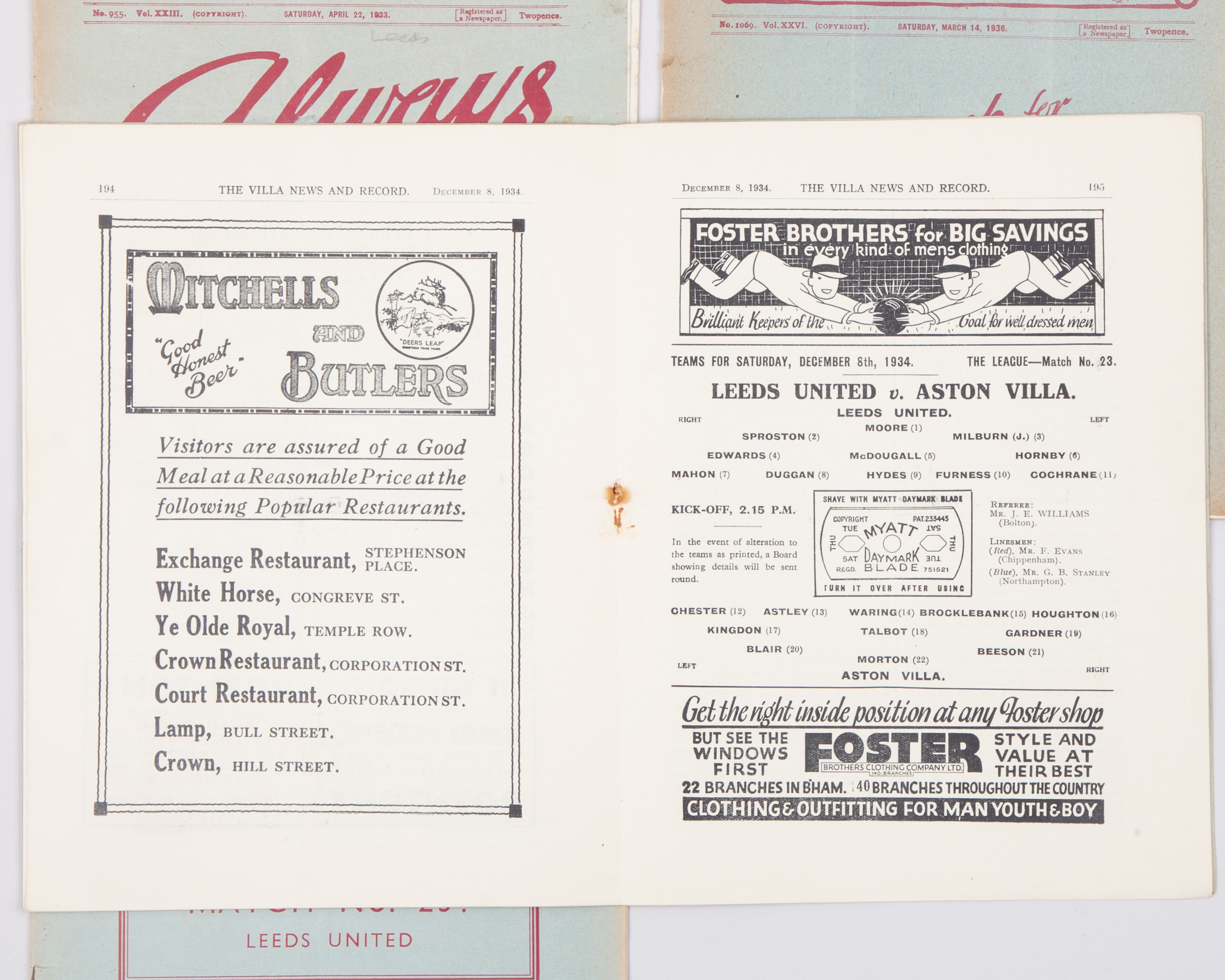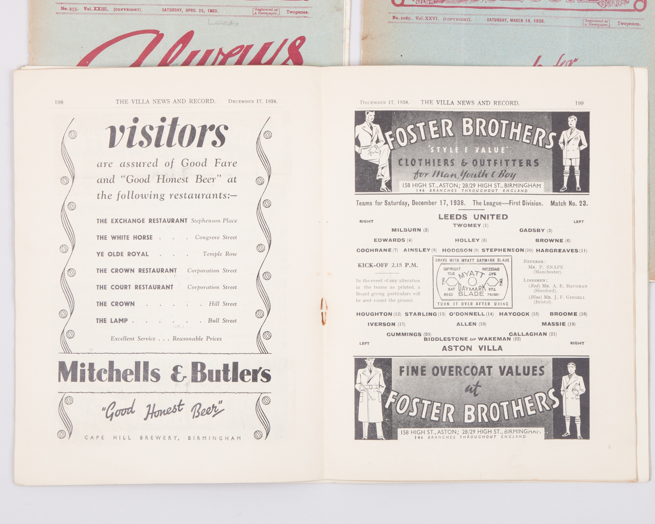 Four Aston Villa v. Leeds United match programmes, 1933-1938
