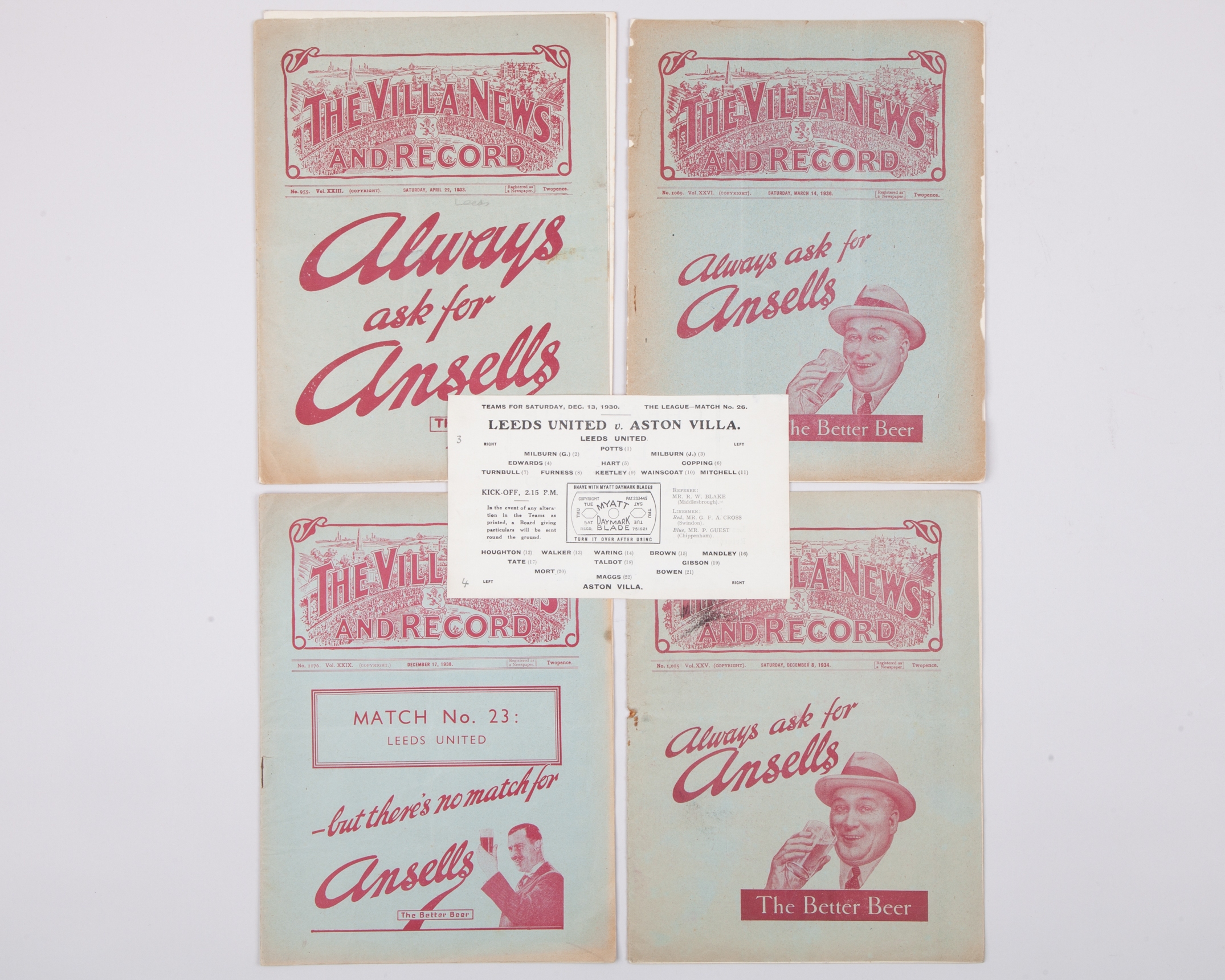 Four Aston Villa v. Leeds United match programmes, 1933-1938, comprising 22nd April 1933, text on team page and half-time scores, 8th December 1934, 14th March 1936, 17th December 1938, all with folds and trimmed team page only 13th December 1930 (5)