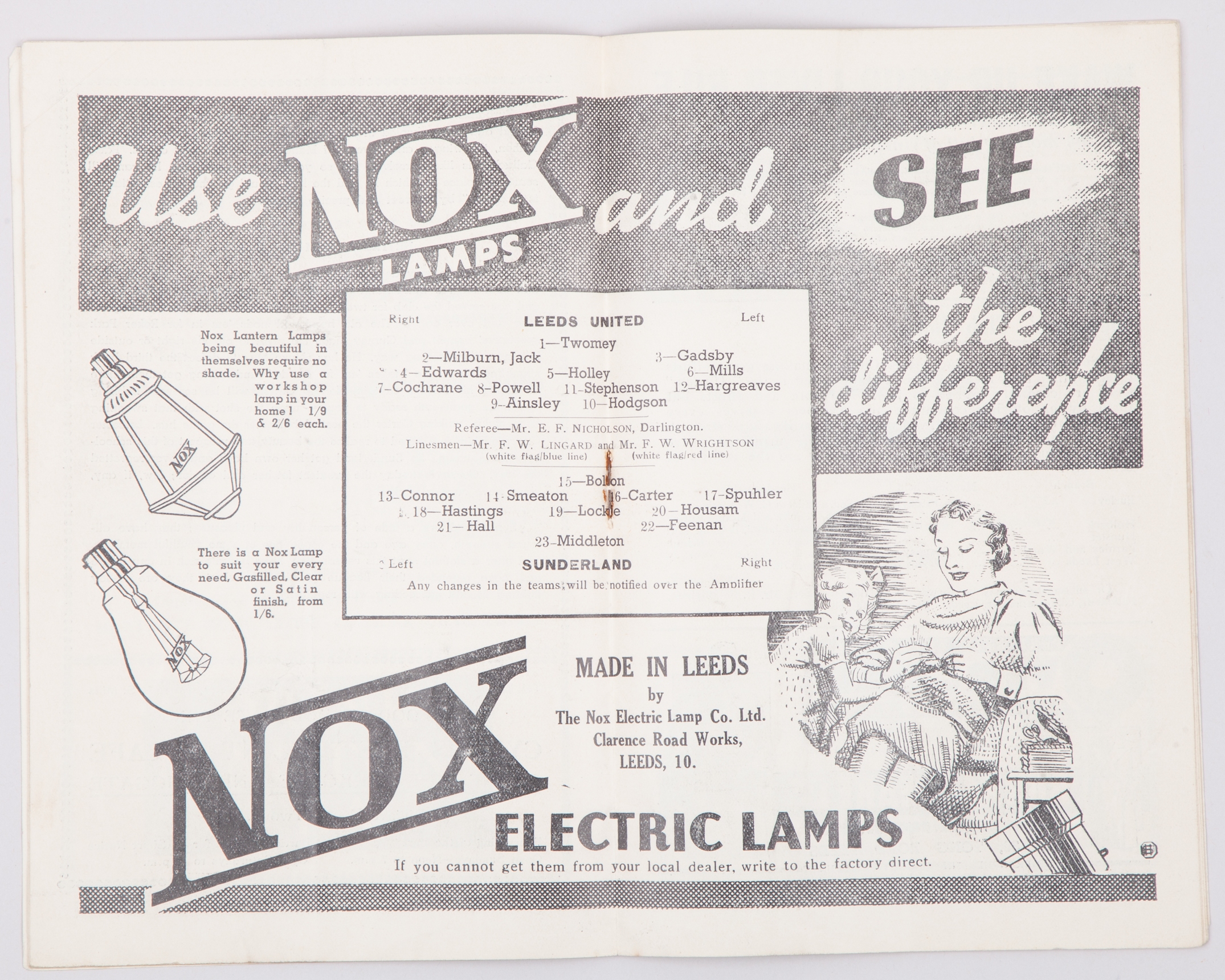 Leeds United v. Sunderland match programme 10th December 1938, fold