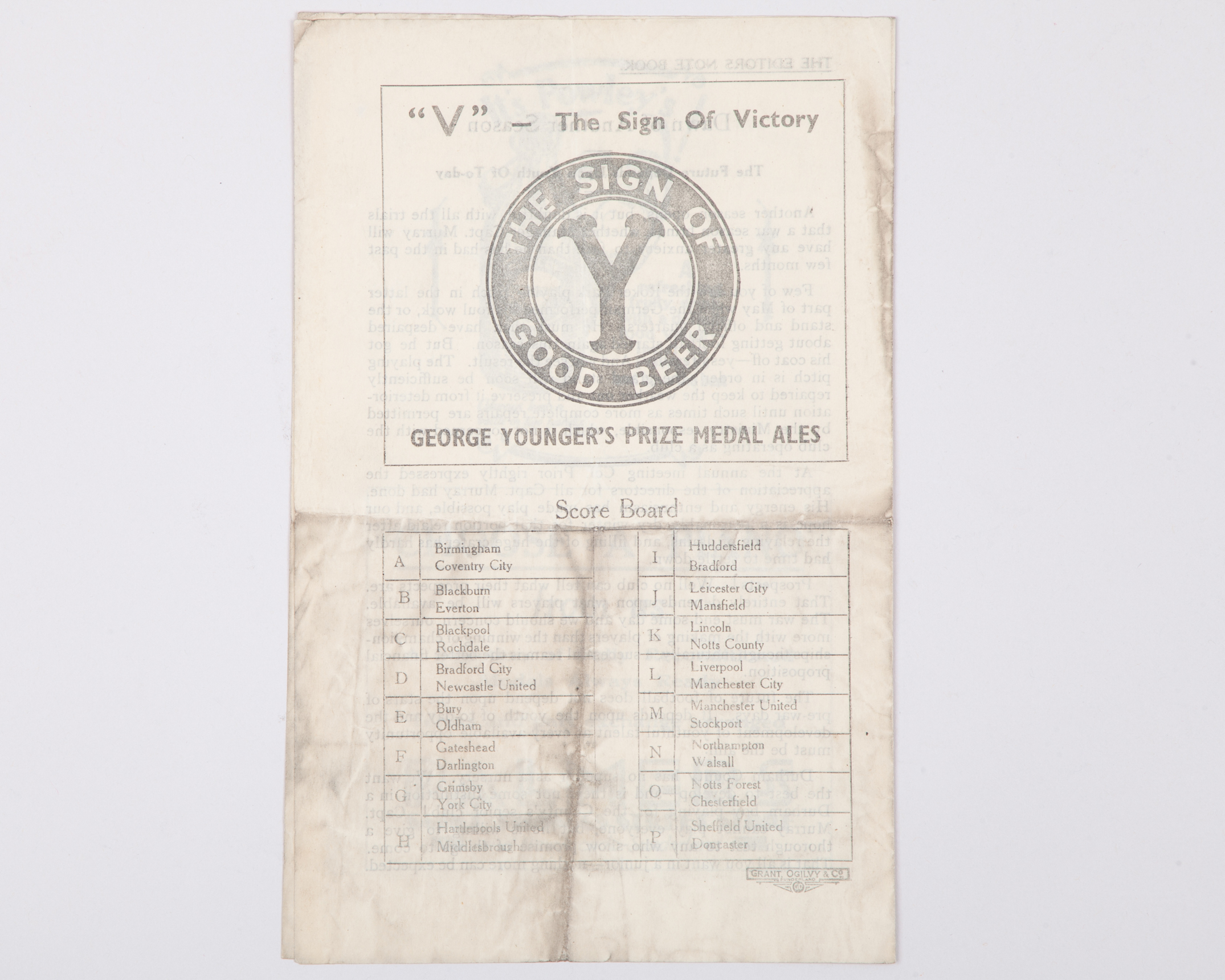 Sunderland v. Leeds United match programme, 28th August 1943, folds, staining