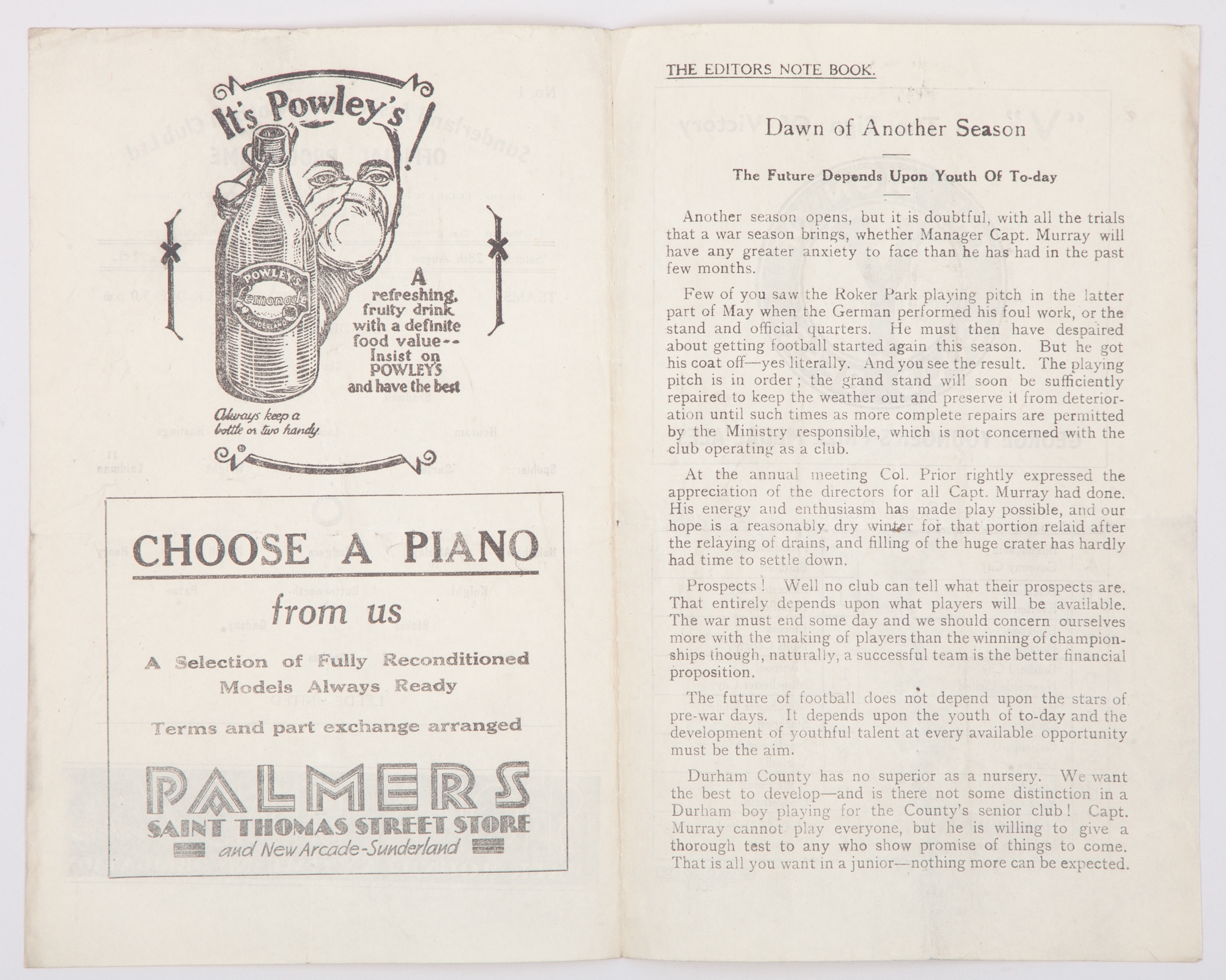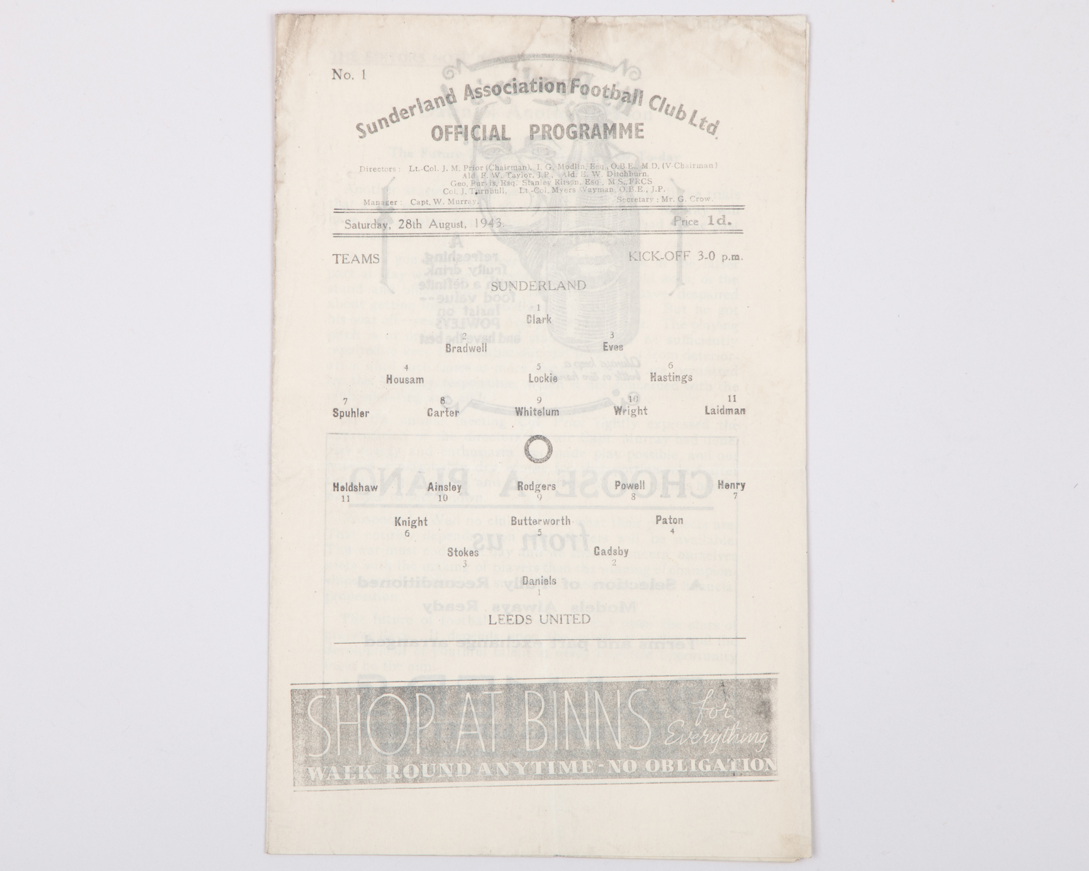 Sunderland v. Leeds United match programme, 28th August 1943