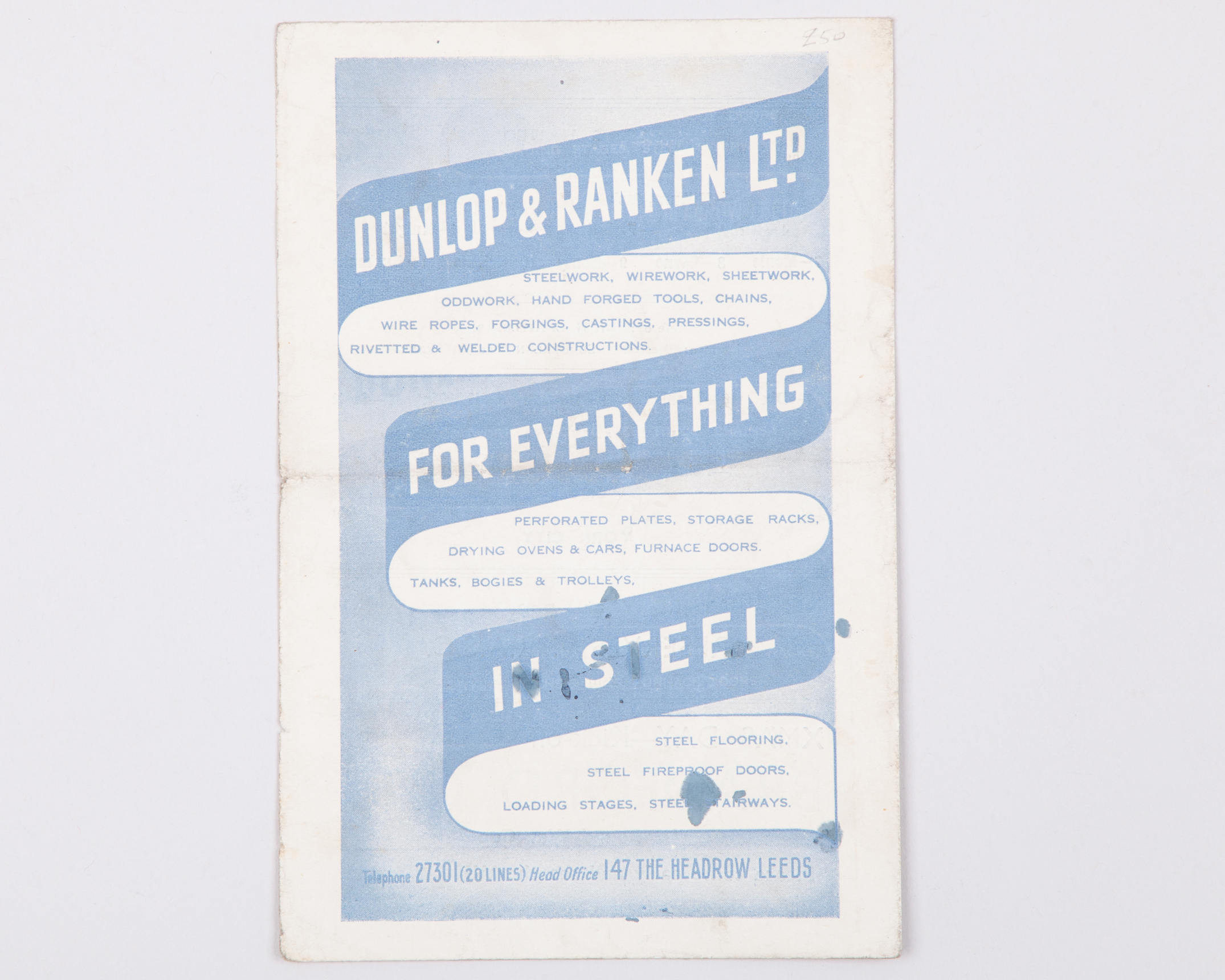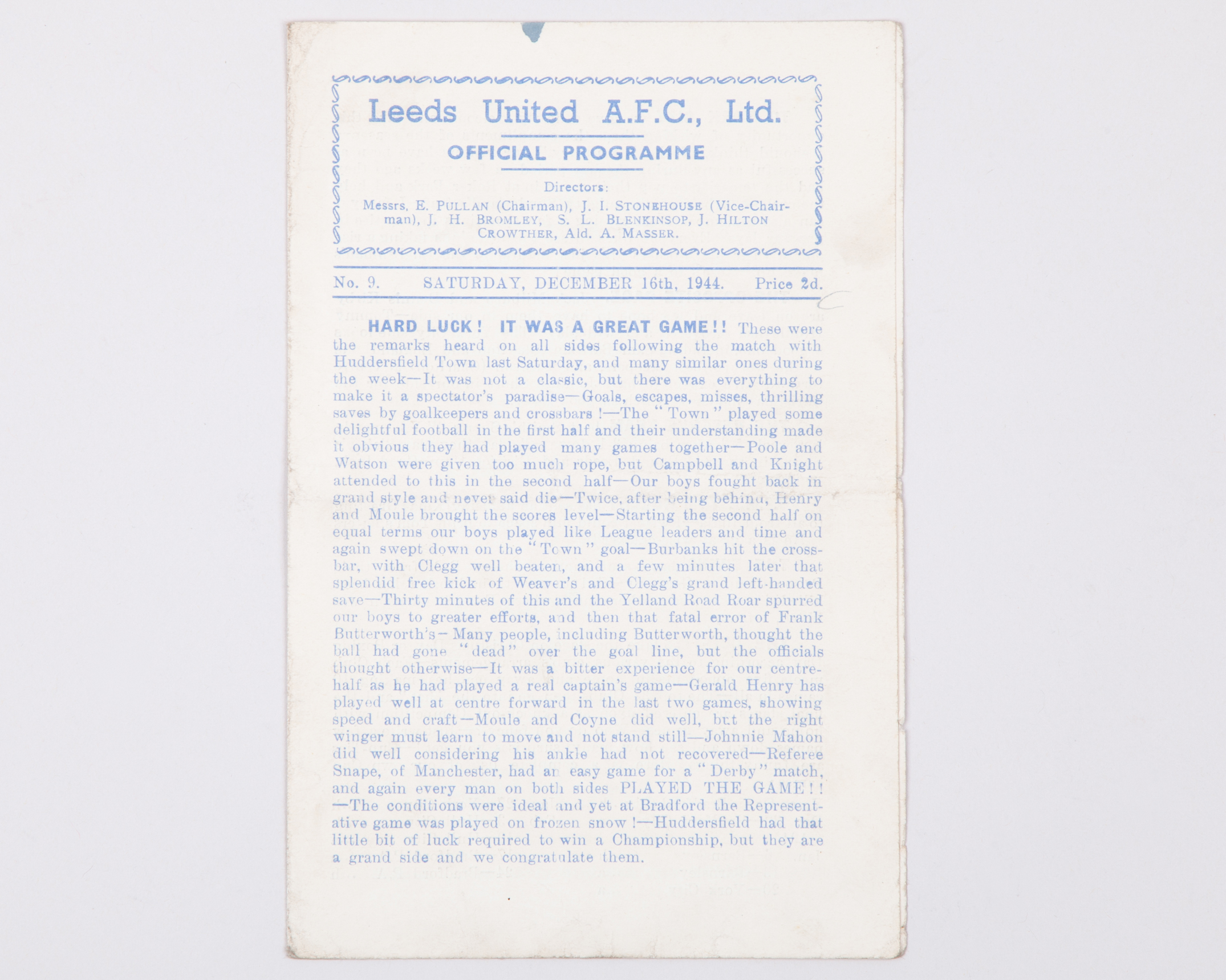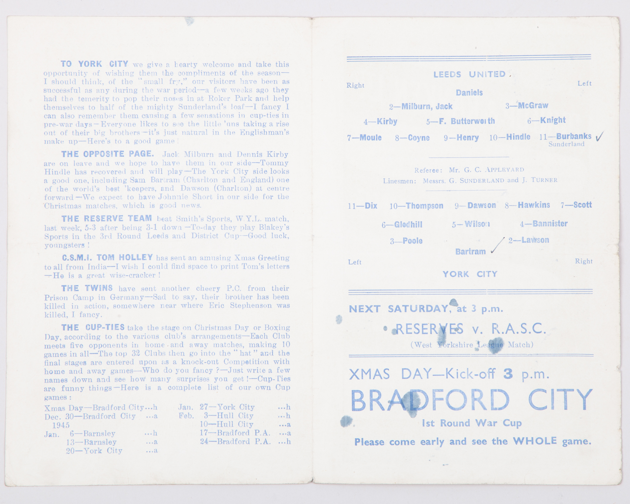 Leeds United v. York City match programme, 16th December 1944, folds, slight text on team page