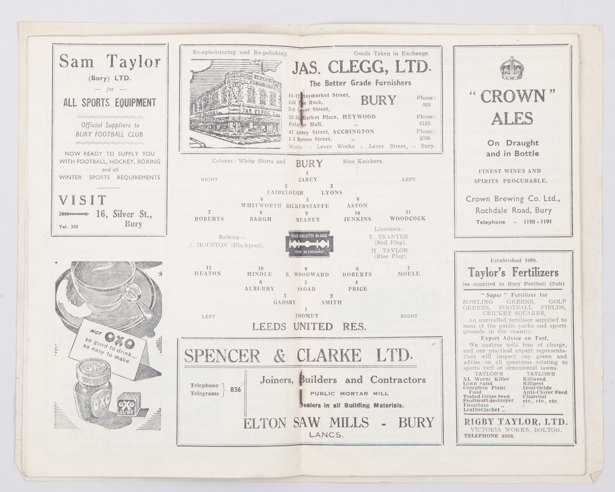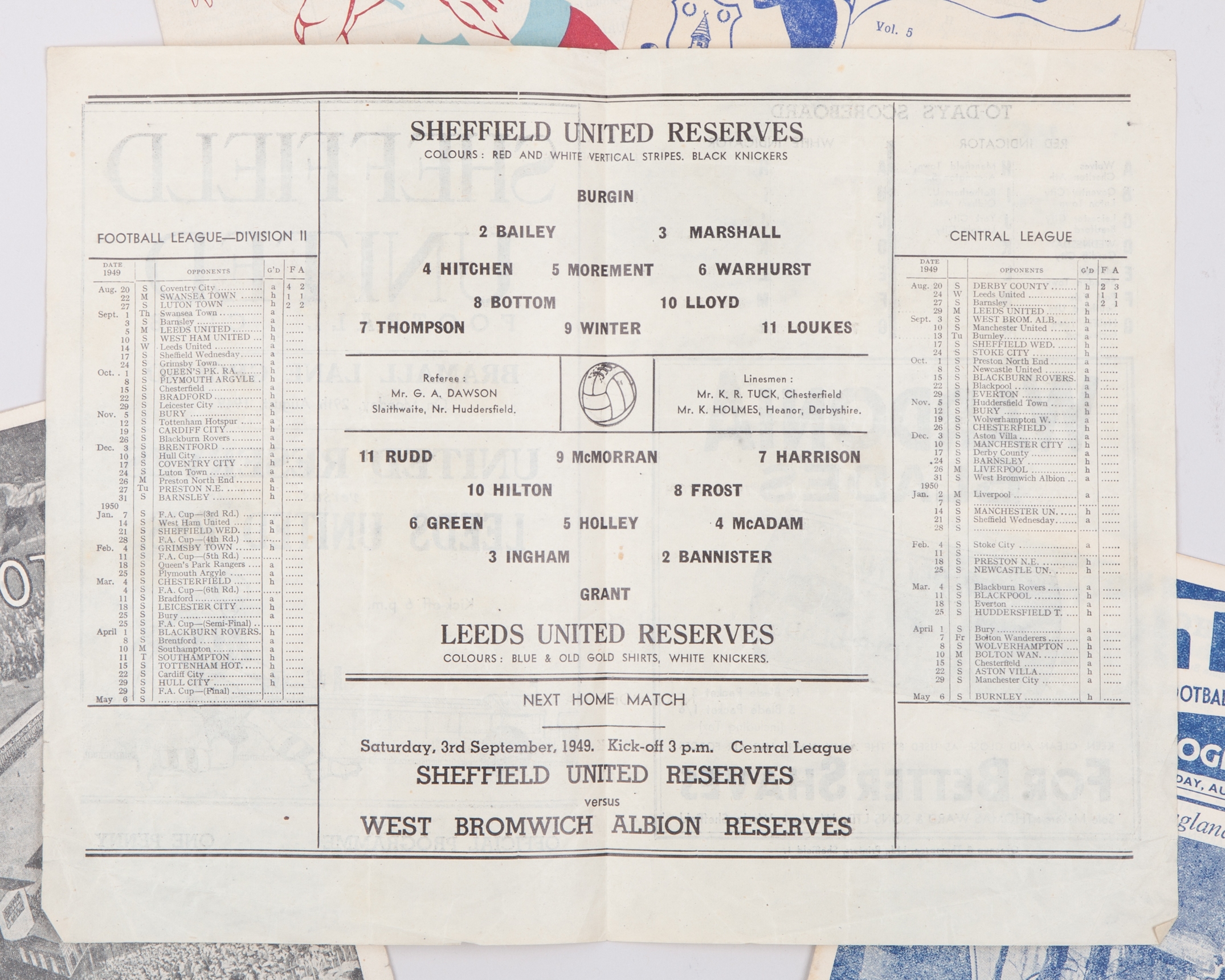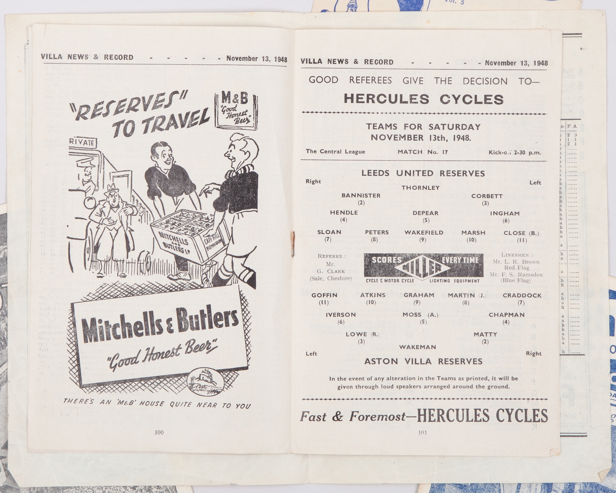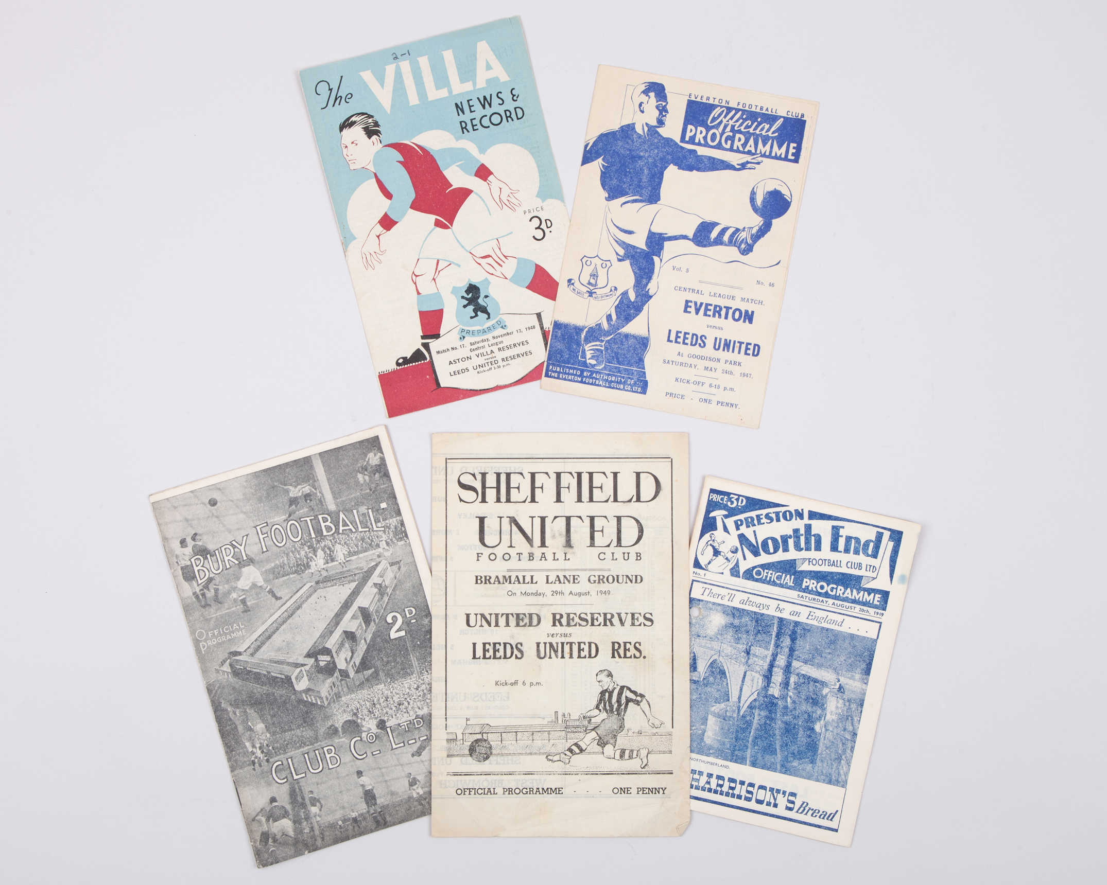 Five Leeds United Reserve away match programmes, 1940s, comprising Bury, 26th October 1946, Everton, 24th May 1947, Aston Villa, 13th November 1948, Preston North End, 20th August 1949, punch holes and Sheffield United, 29th August 1949, folds (5)