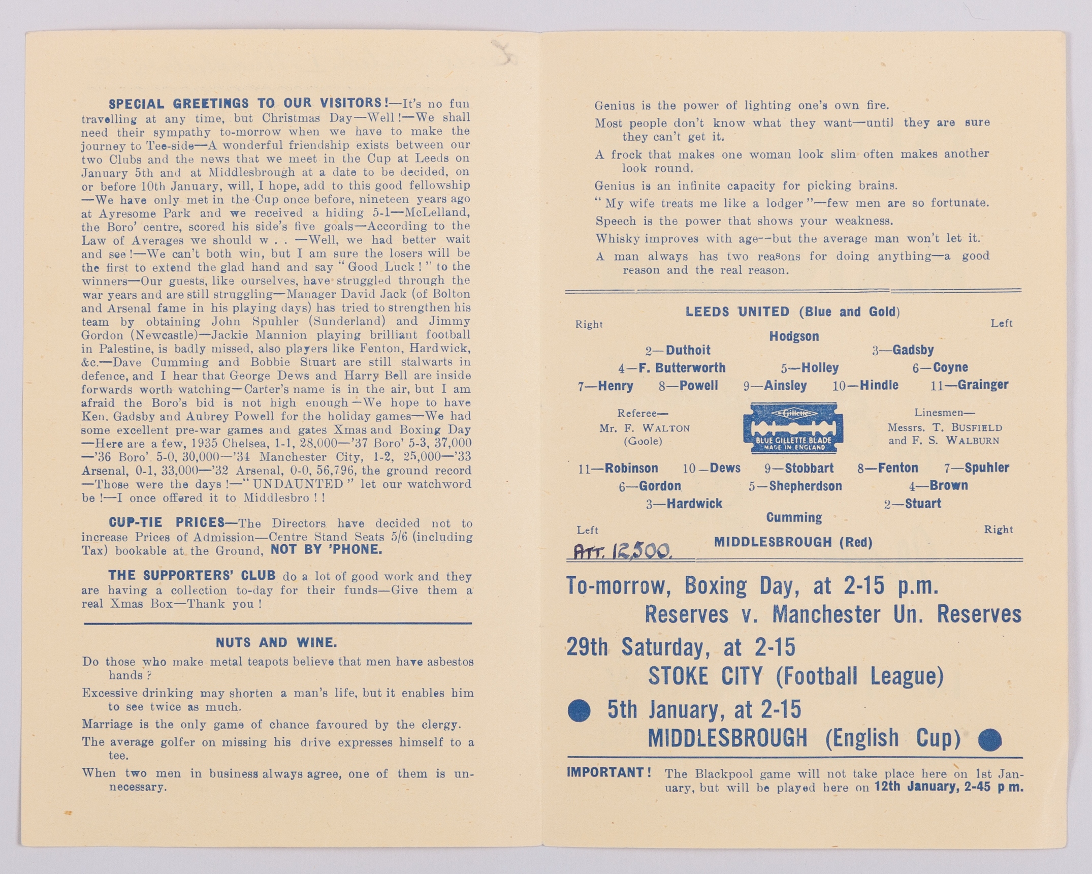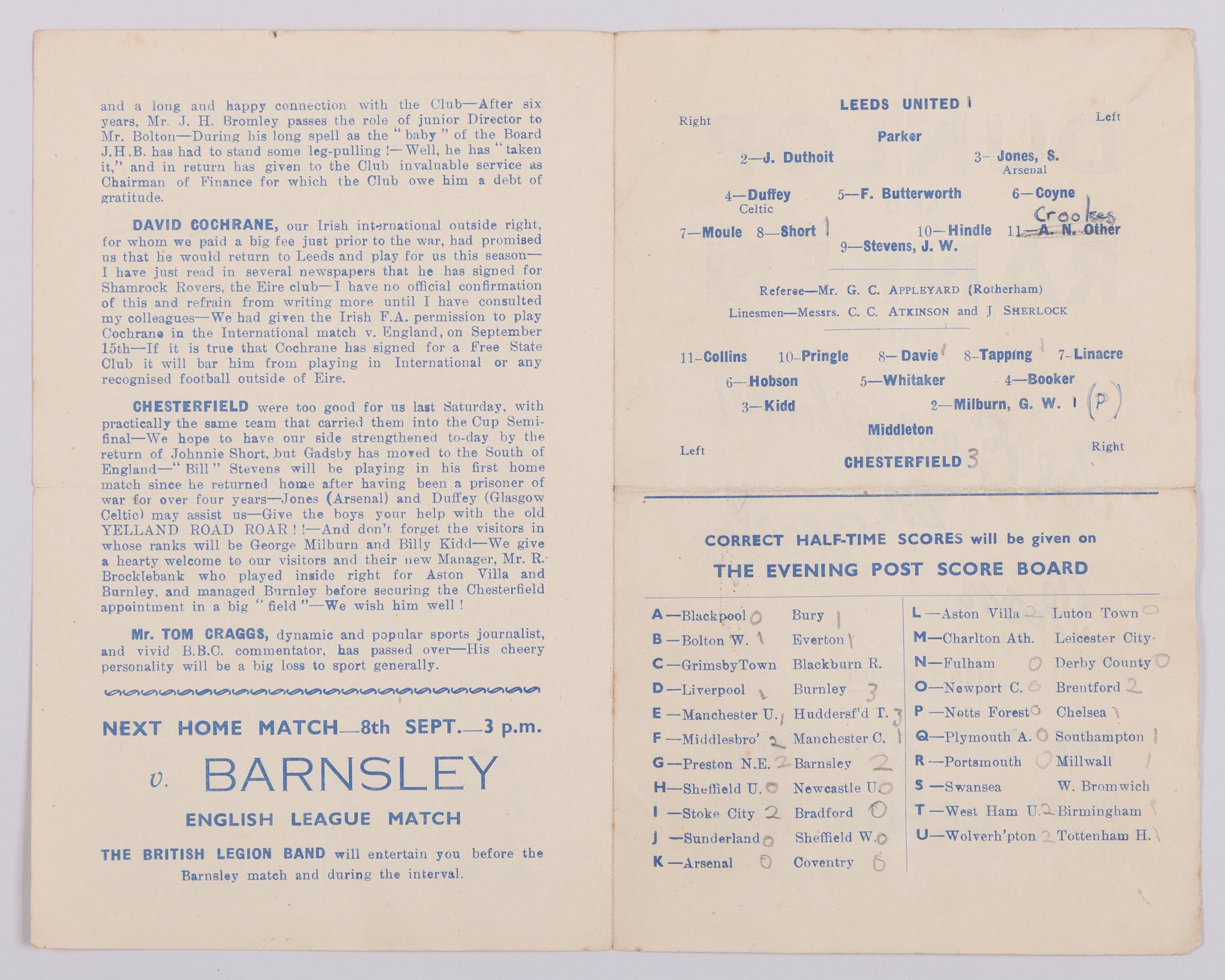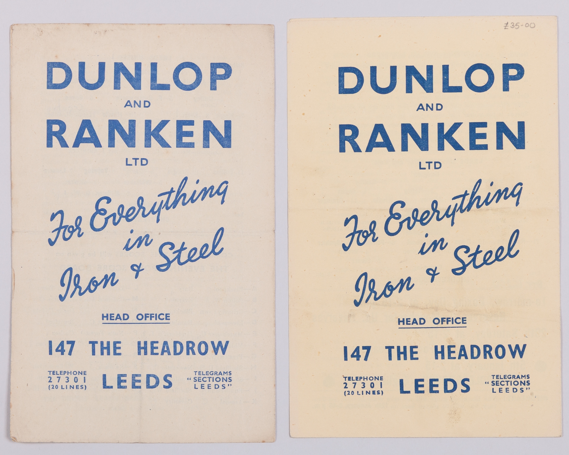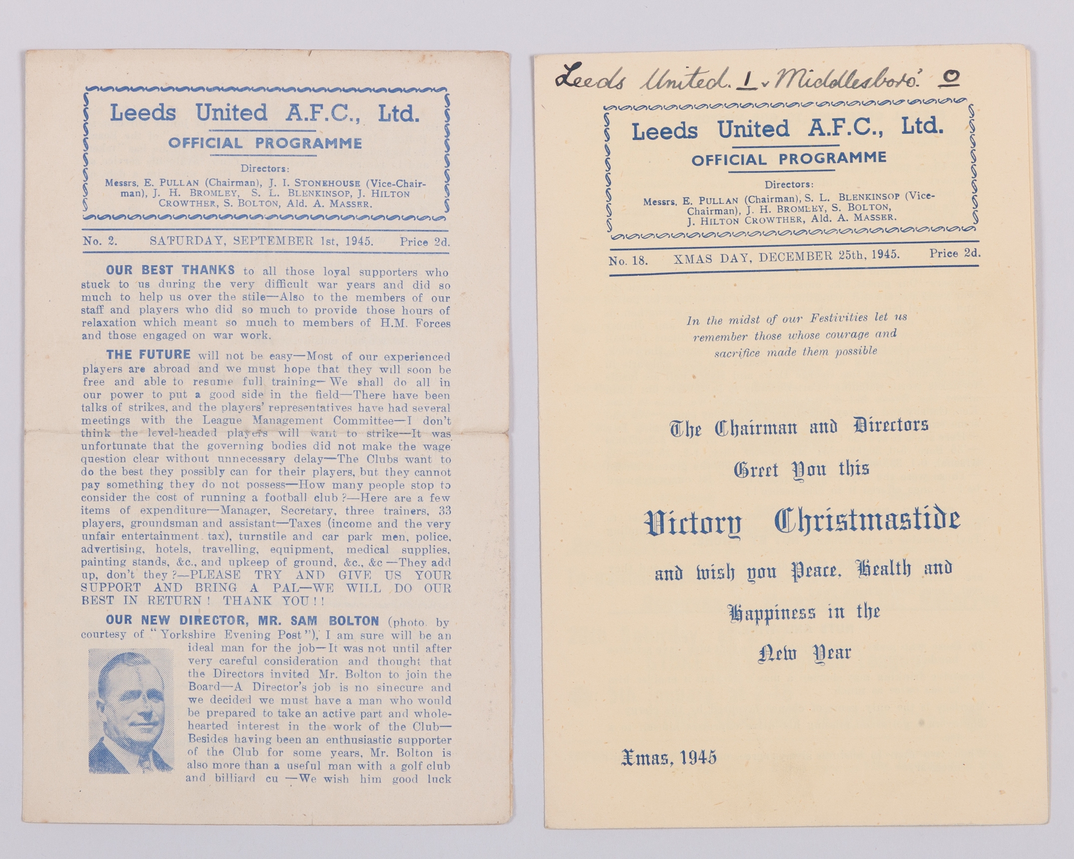 Two Leeds United home match programmes, 1945, comprising Chesterfield, 1st September 1945, text on team pages, folds and Middlesbrough, 25th December 1945, text on cover, folds (2)