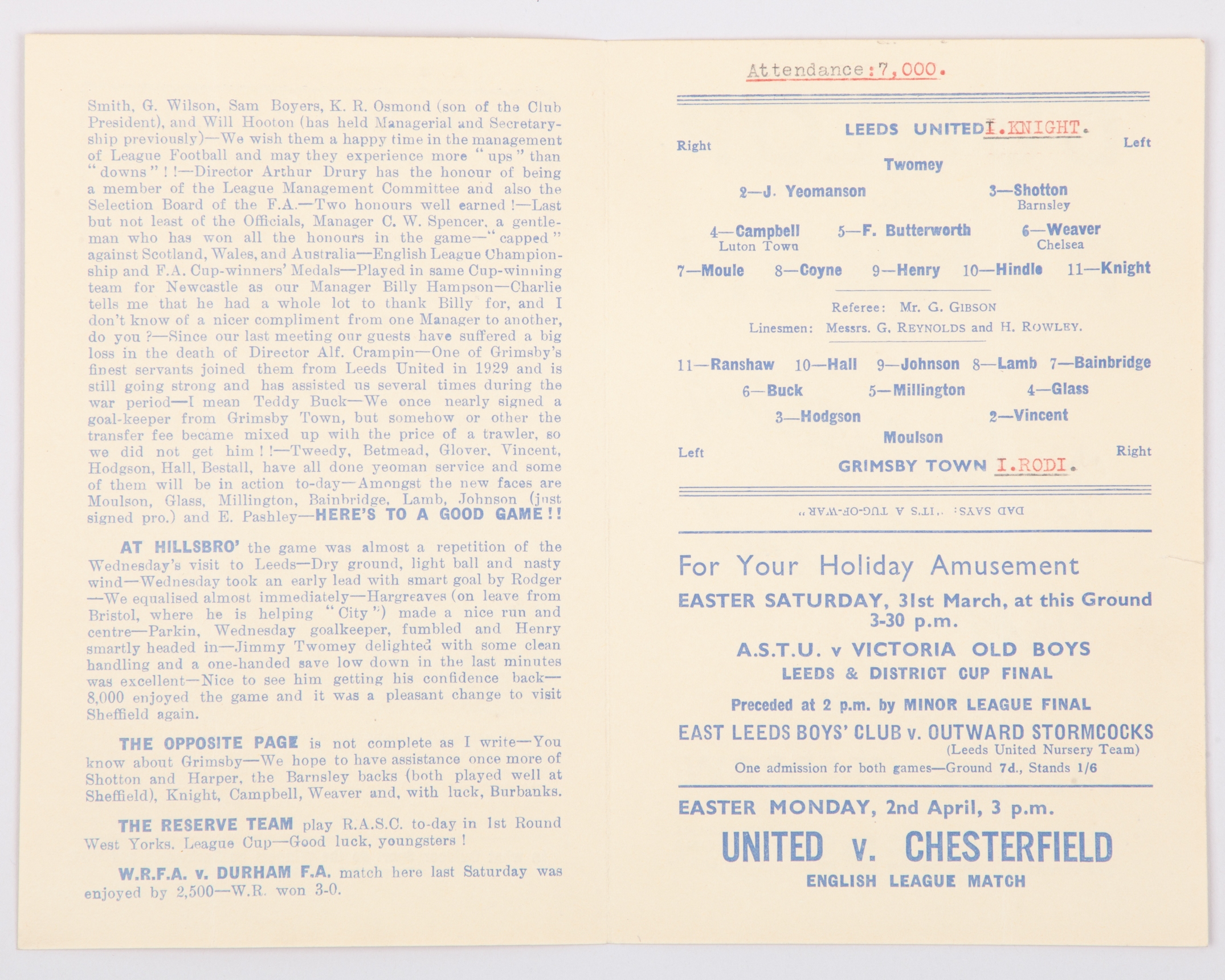 Leeds United v. Grimsby Town match programme, 24th March 1945