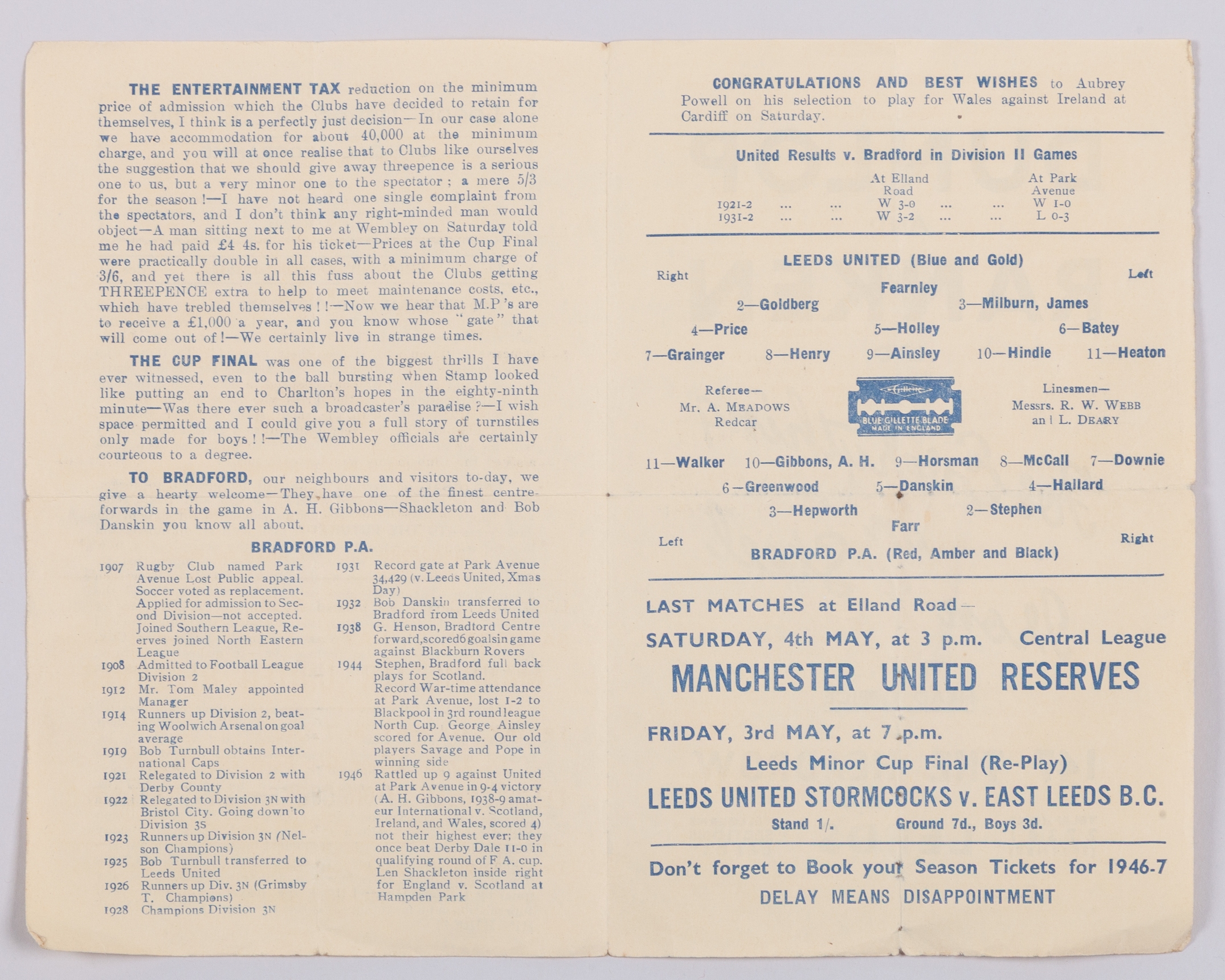 Leeds United v. Bradford Park Avenue match programme, 1st May 1946