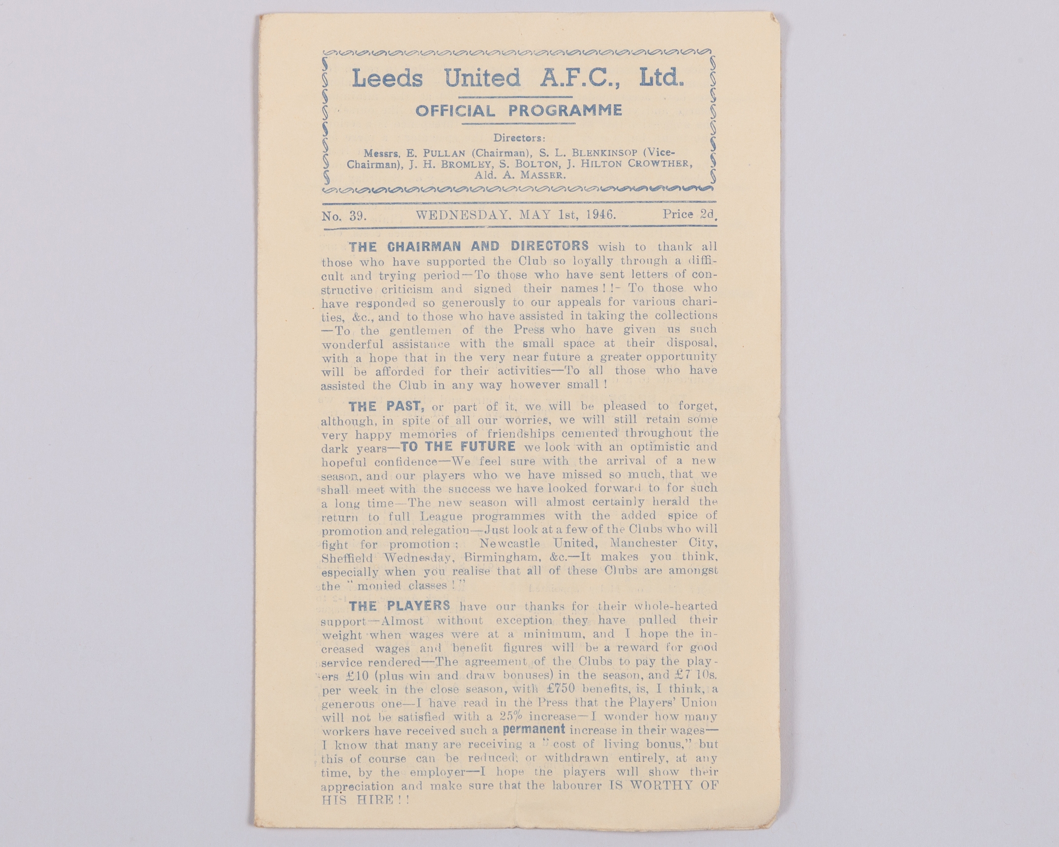 Leeds United v. Bradford Park Avenue match programme, 1st May 1946, folds