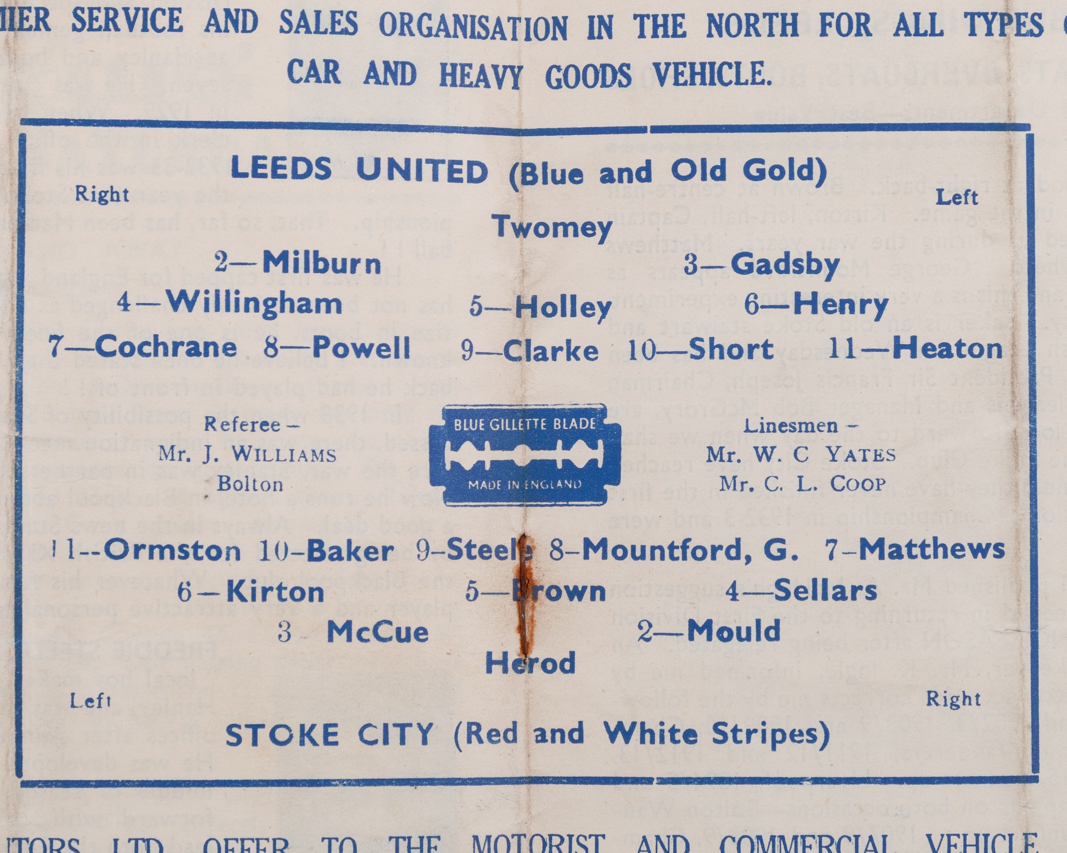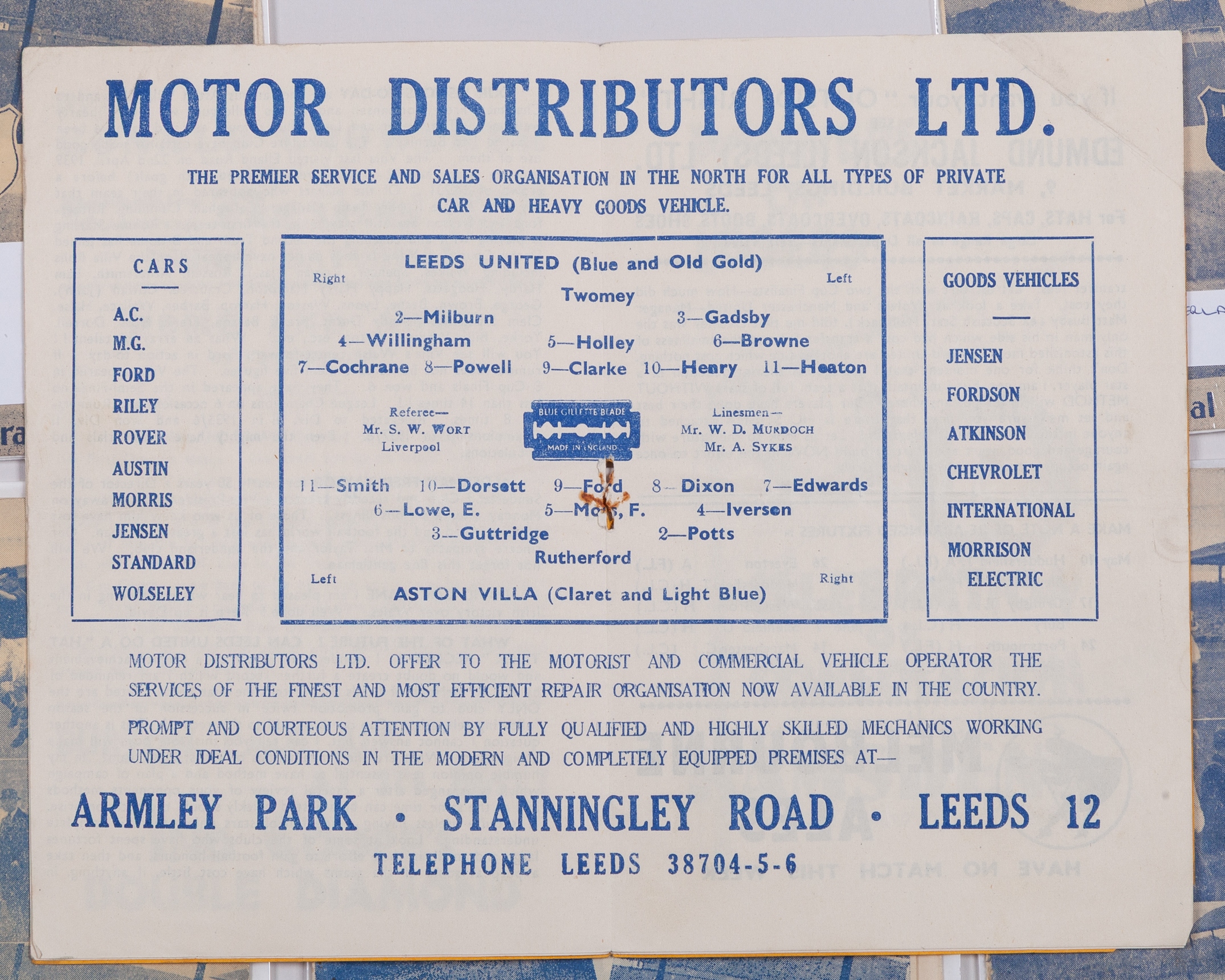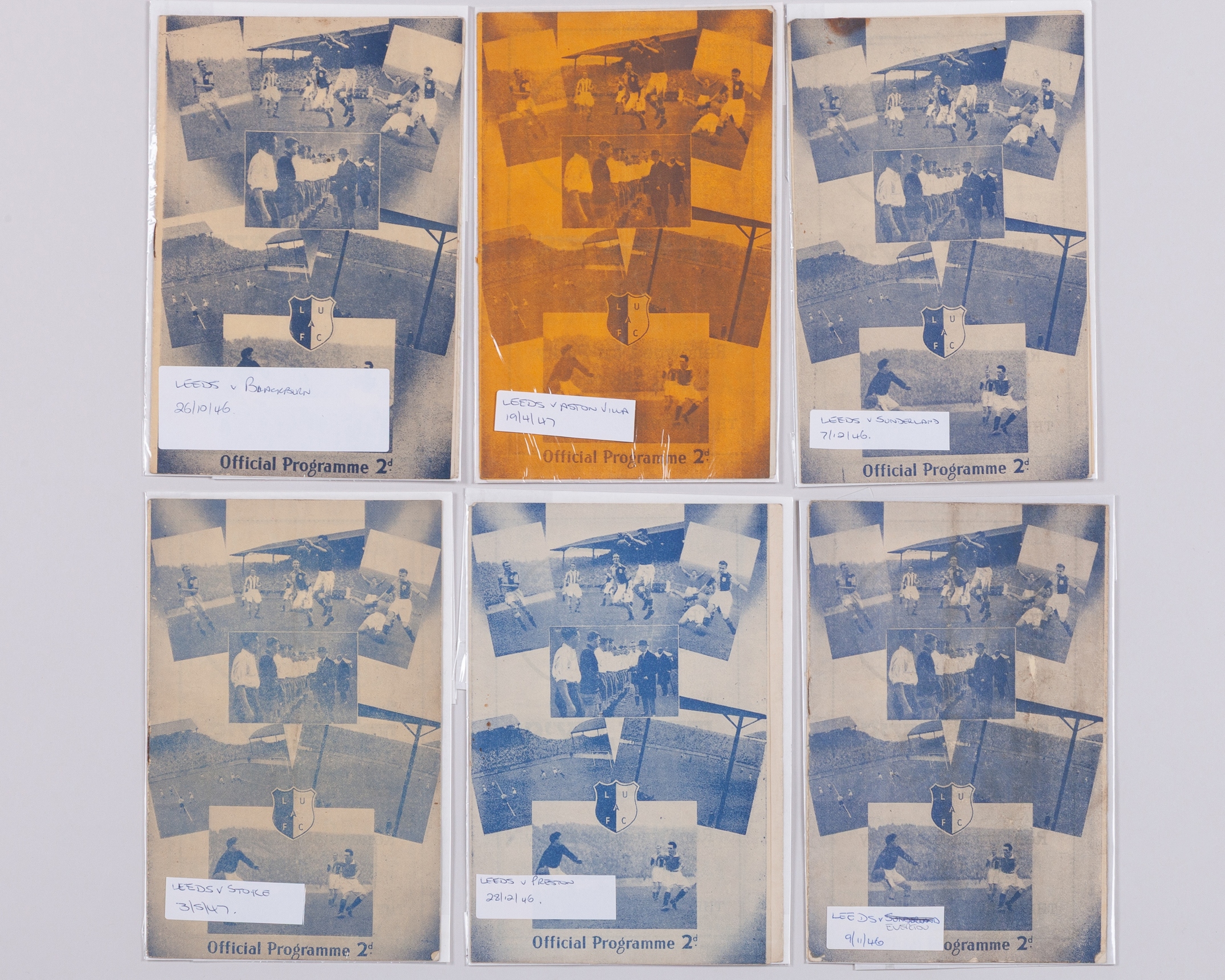 Six Leeds United home match programmes 1946-47, comprising Blackburn, 26th October 1946, Everton, 9th November, 1946, Sunderland, 7th December 1946, Preston, 28th December 1946, Aston Villa, 19th April 1947 and Stoke, 3rd May 1947. folds (6)