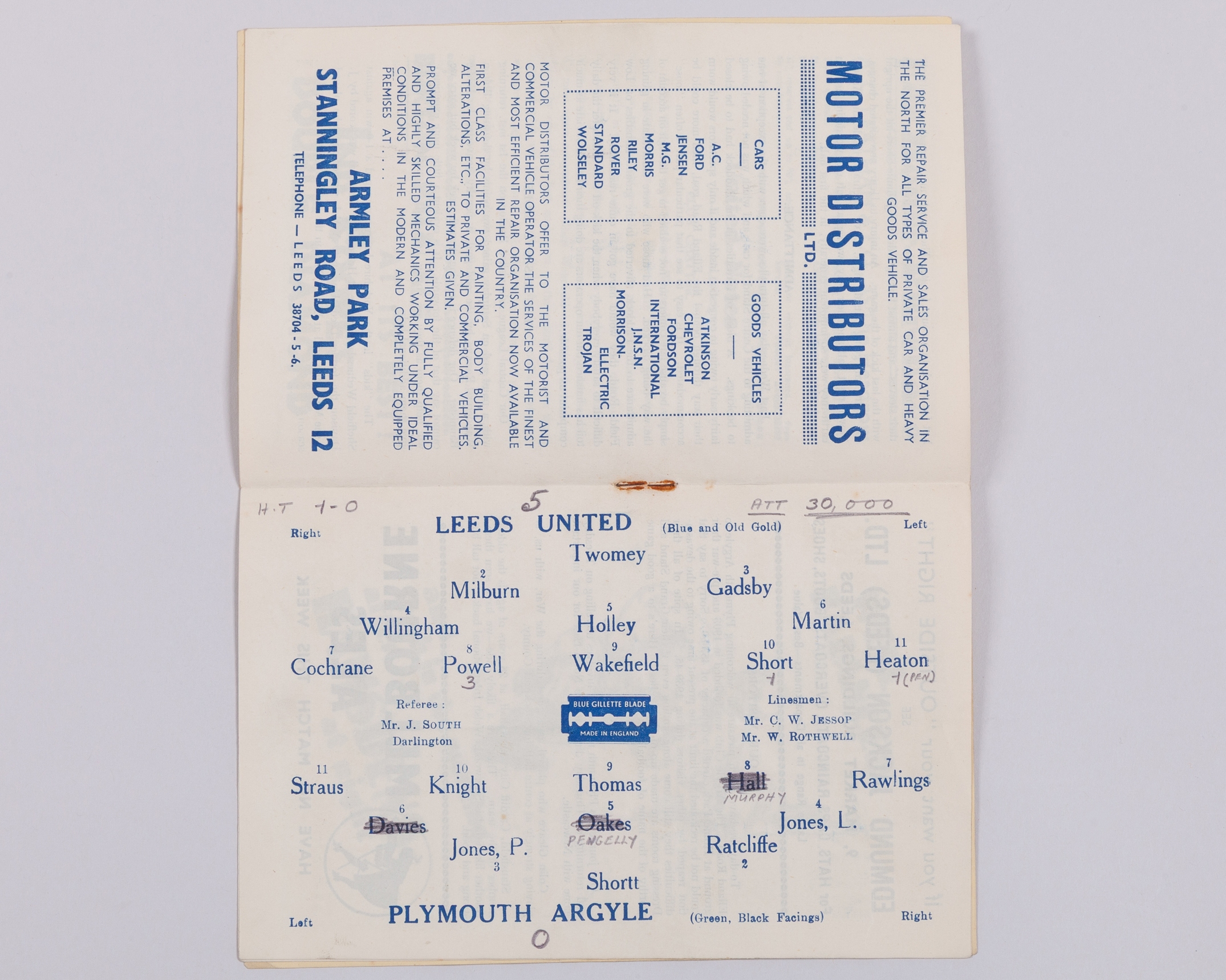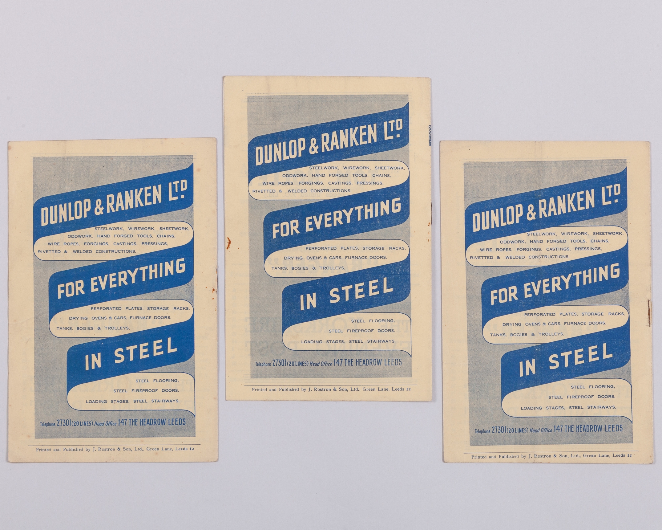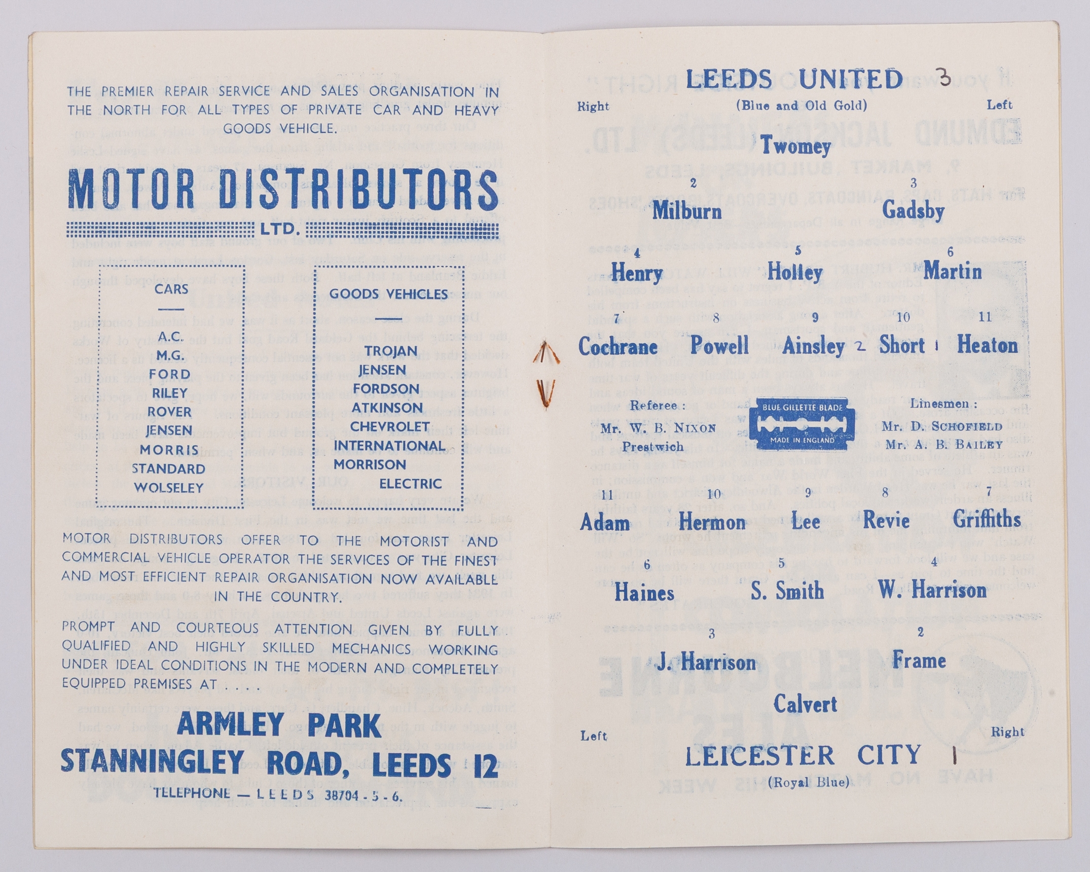 Three Leeds United home match programmes, 1947, comprising Leicester, 23rd August 1947, Barnsley, 3rd September 1947 and Plymouth Argyle, 10th September 1947, folds (3)