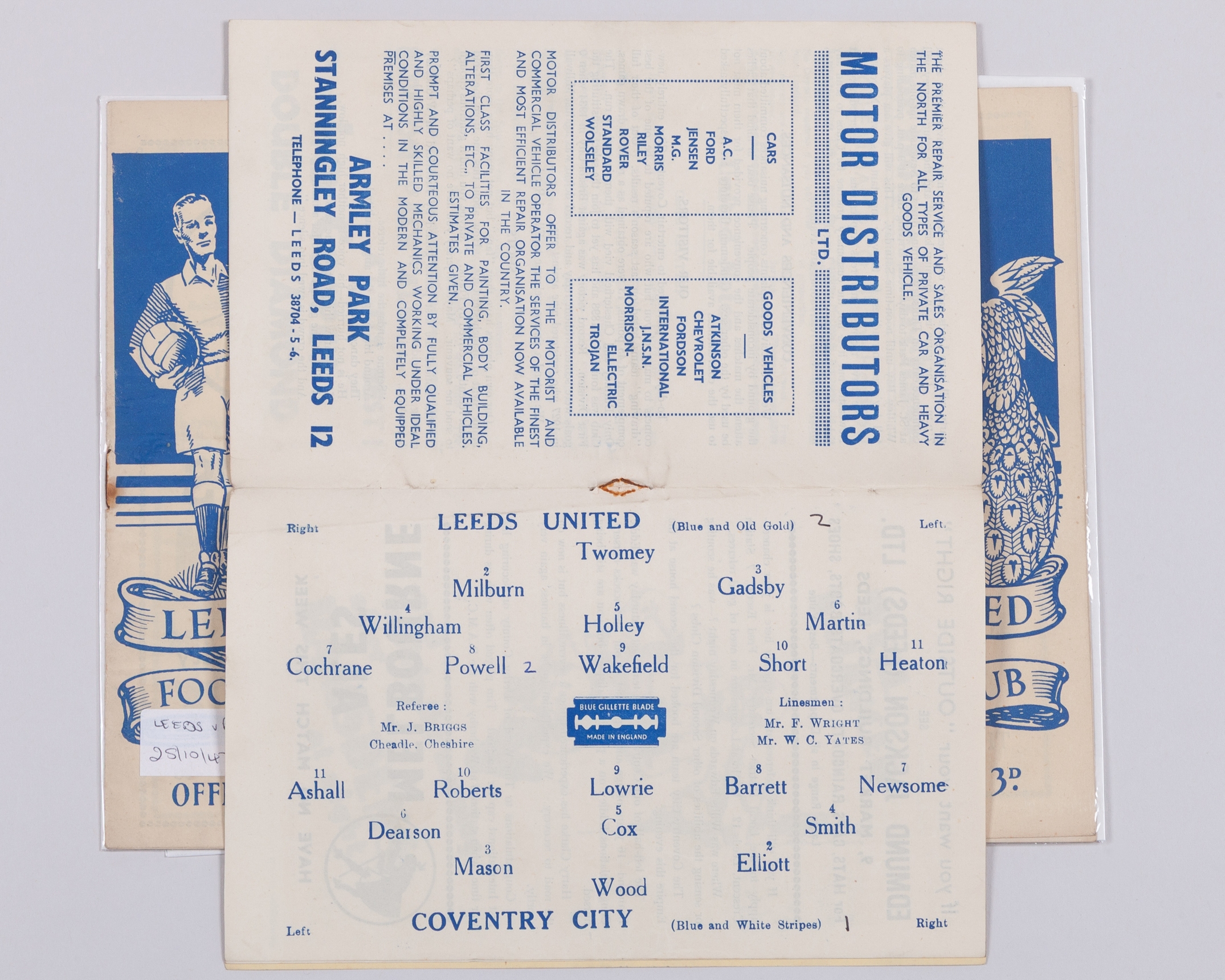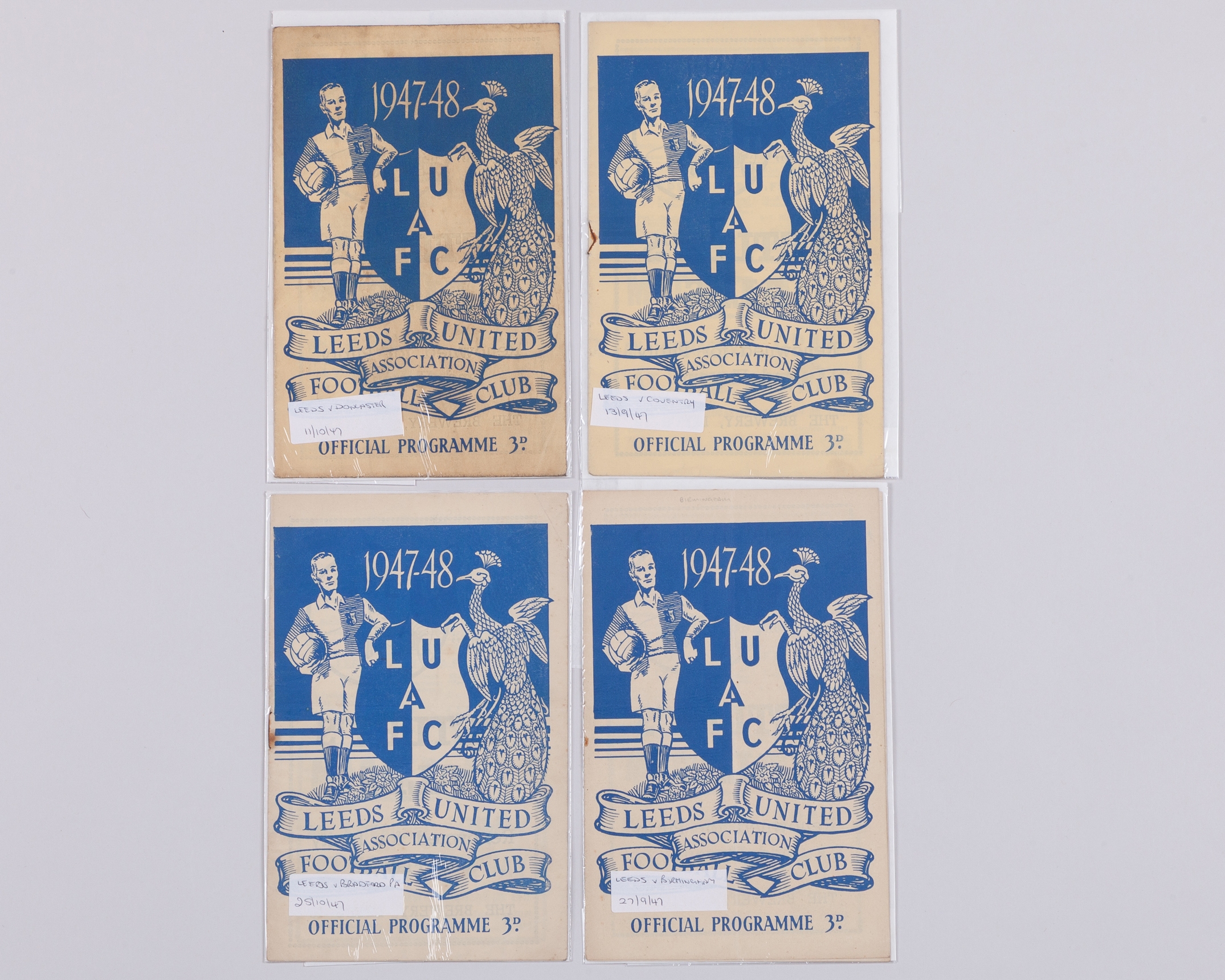 Four Leeds United home match programmes, 1947, comprising Coventry, 13th September 1947, Birmingham, 27th September 1947, Doncaster, 11th October 1947 and Bradford Park Avenue, 25th October 1947, folds (4)