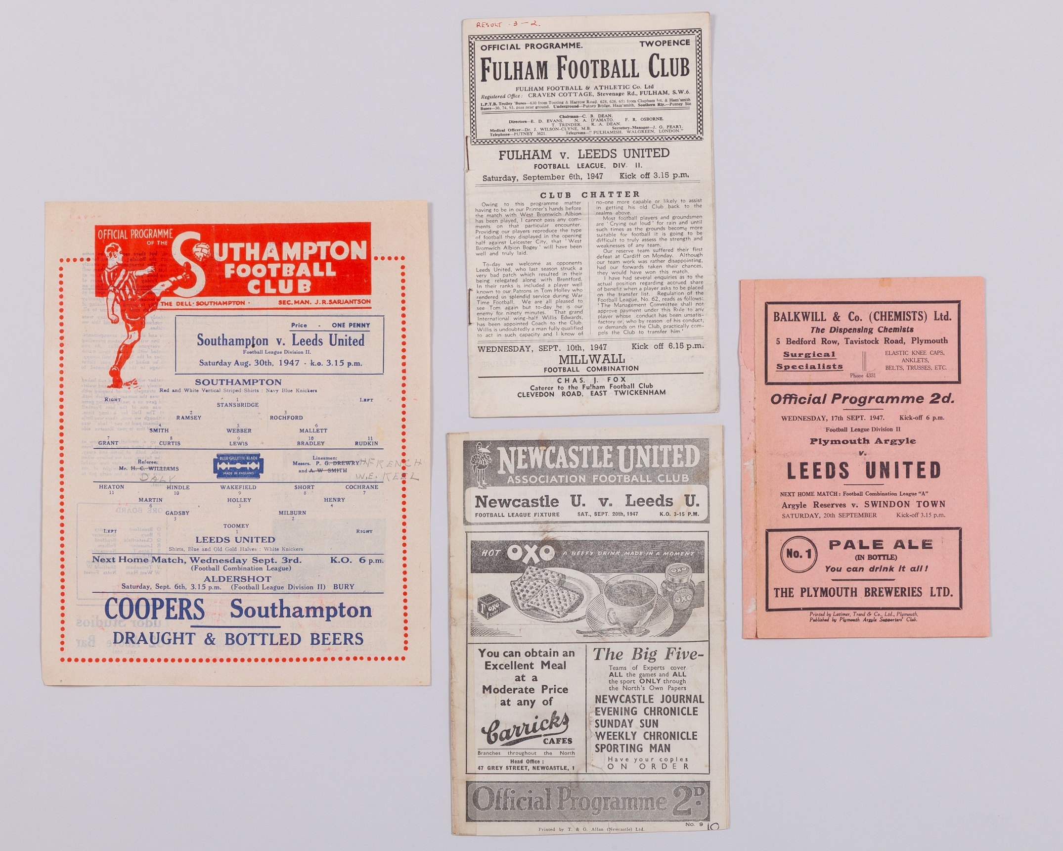 Four Leeds United away match programmes, 1947, comprising Southampton, 30th August 1947, text, Fulham, 6th September 1947, Plymouth argyle, 17th September 1947, Newcastle United, 20th September 1947, folds (4)