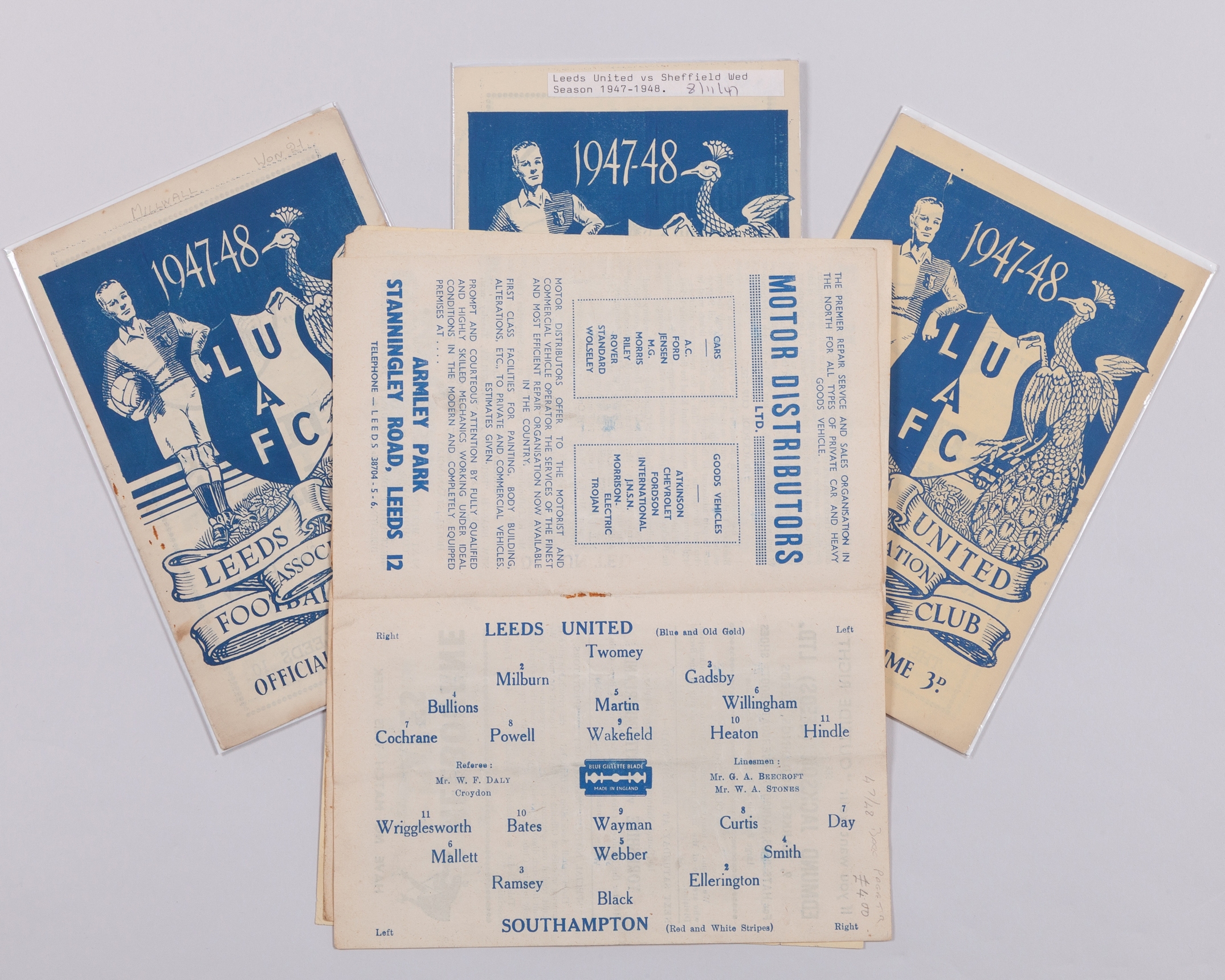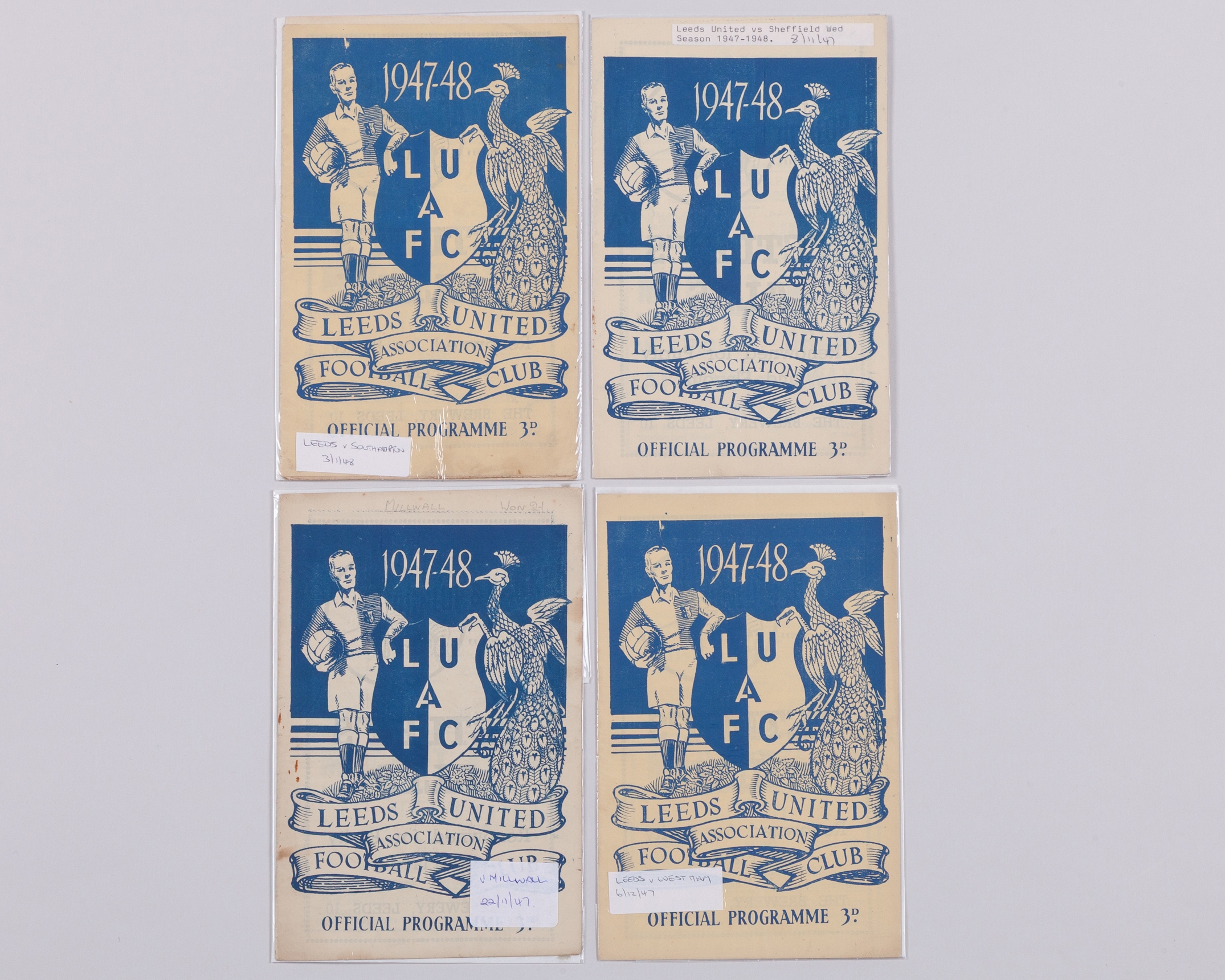 Four Leeds United home match programmes, 1947-48, comprising Sheffield Wednesday, 8th November 1947, Millwall, 22nd November 1947, West Ham United, 6th December 1947 and Southampton, 3rd January 1947, folds (4)