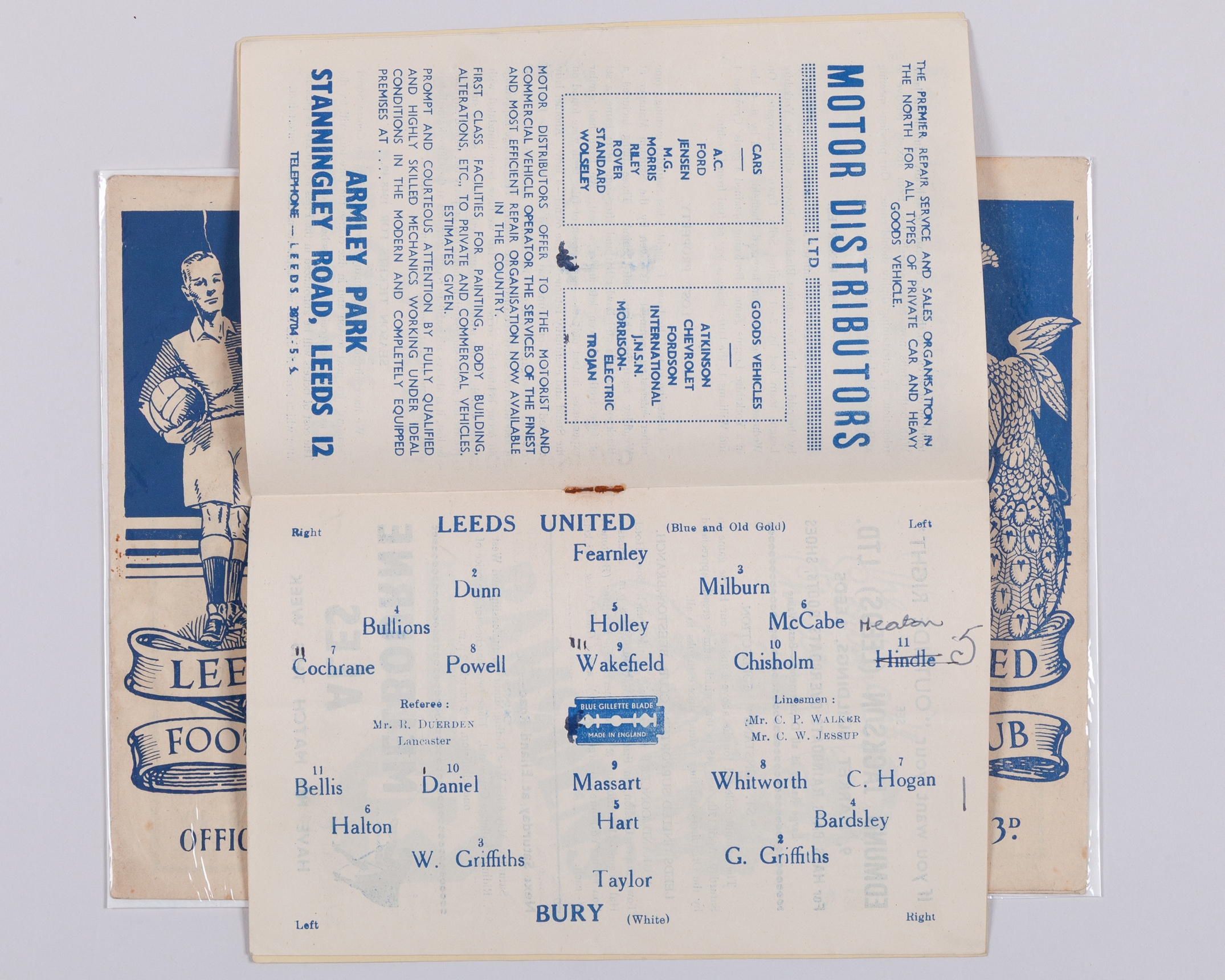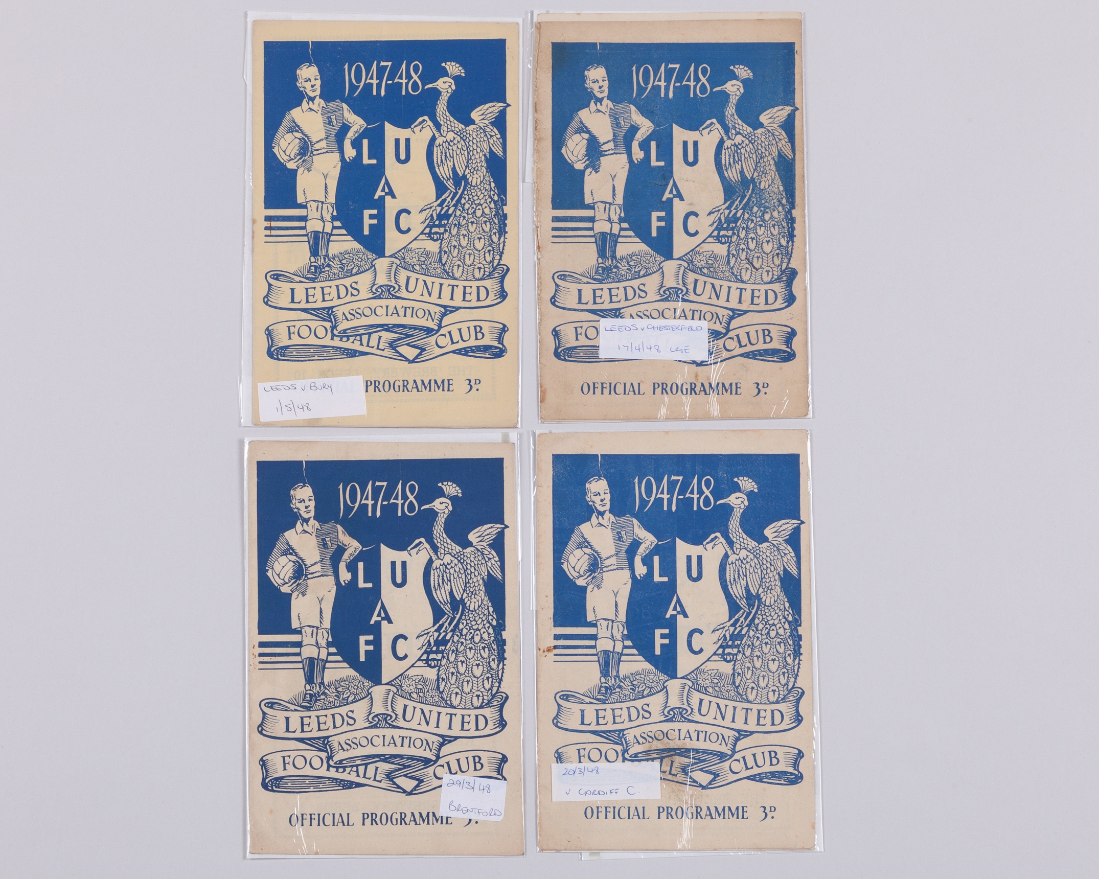 Four Leeds United home match programmes, 1948, comprising Cardiff City, 20th March 1948, Brentford, 29th March 1948, Chesterfield, 17th April and Bury, 1st May 1948, folds, (4)