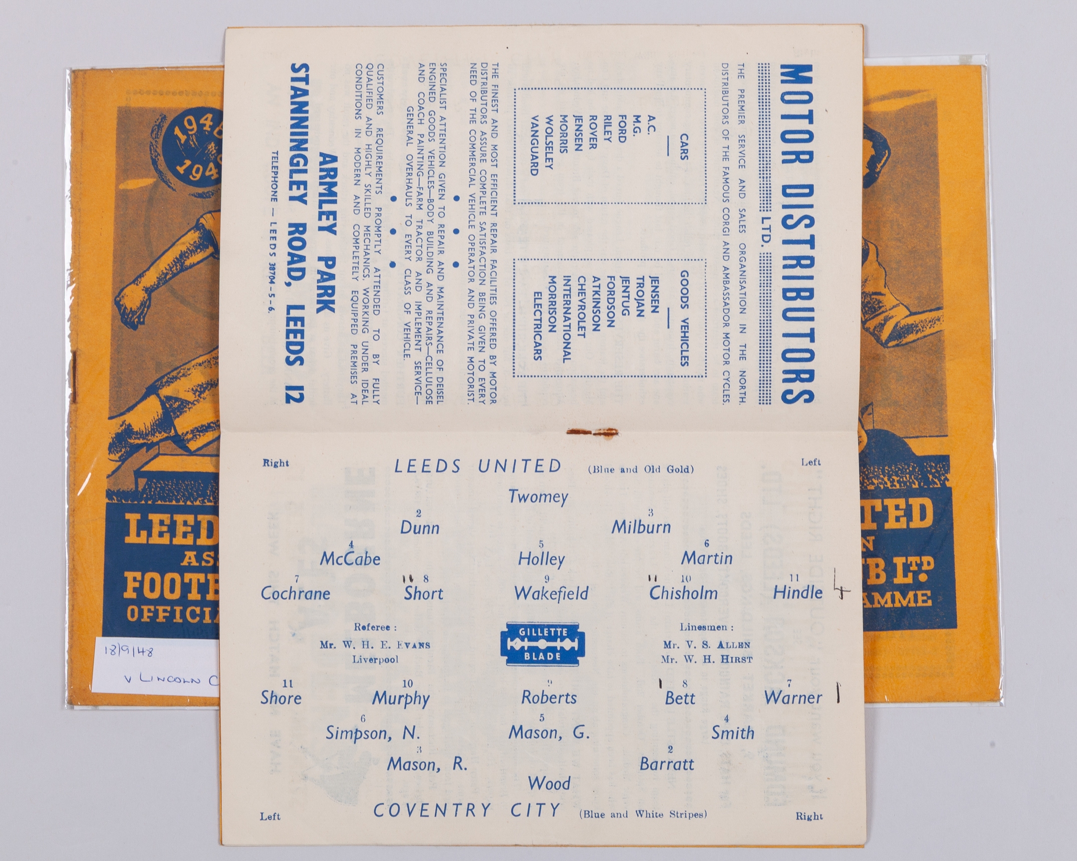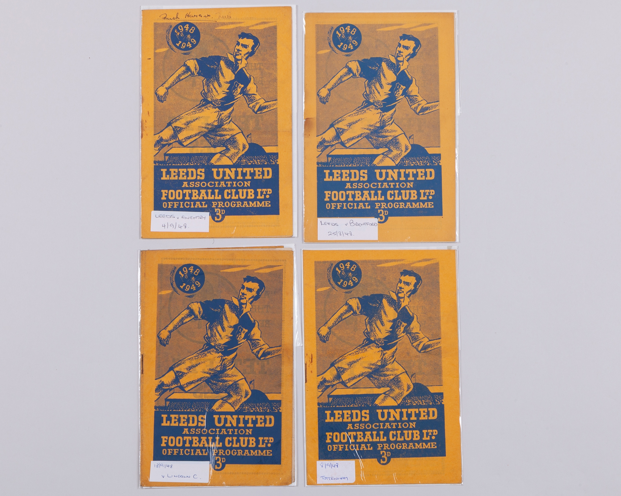 Four Leeds United home match programme, 1948, comprising Brentford, 25th August 1948, Coventry, 4th September 1948, Tottenham Hotspur, 8th September 1949 and Lincoln City, 18th September 1948, folds (4)
