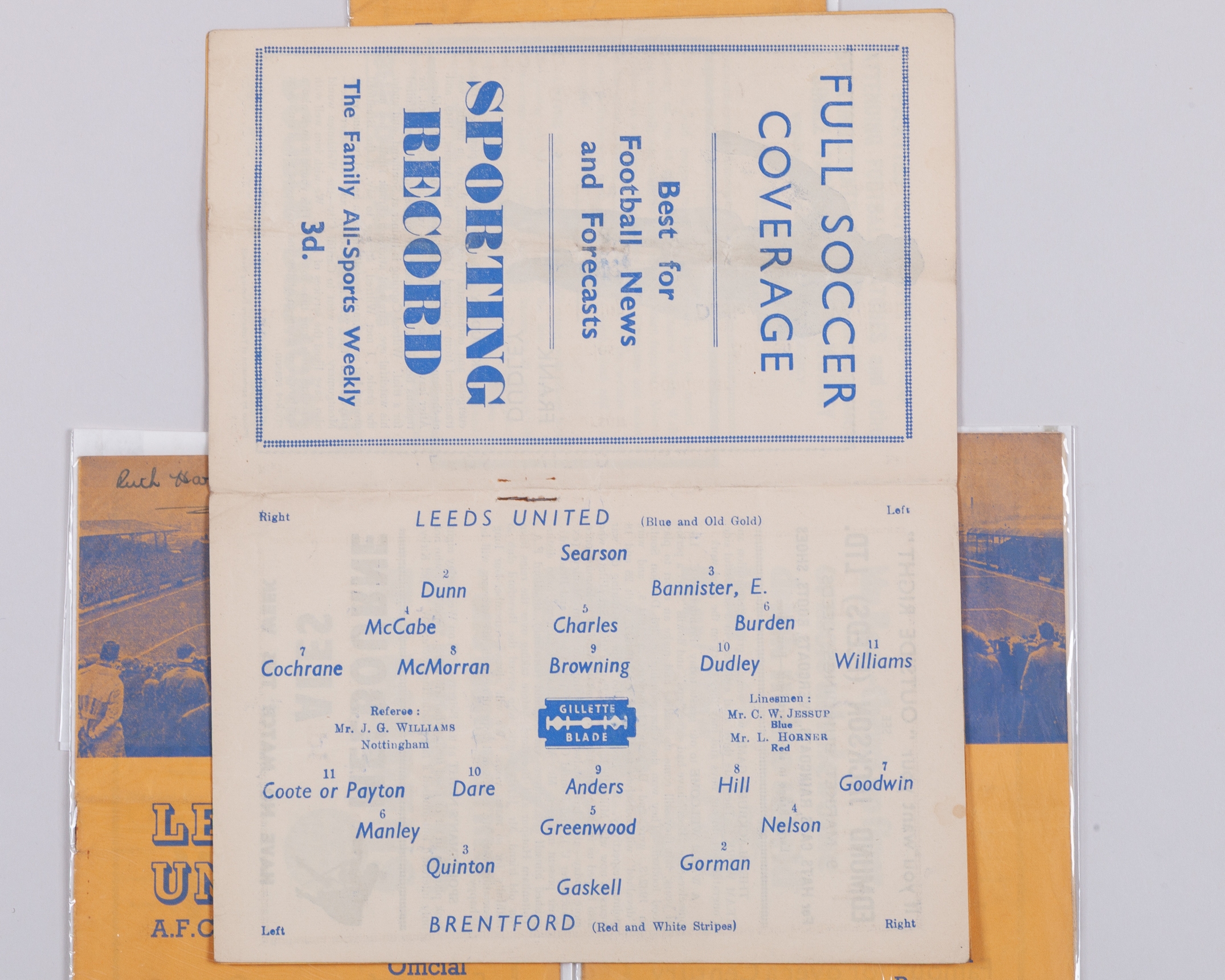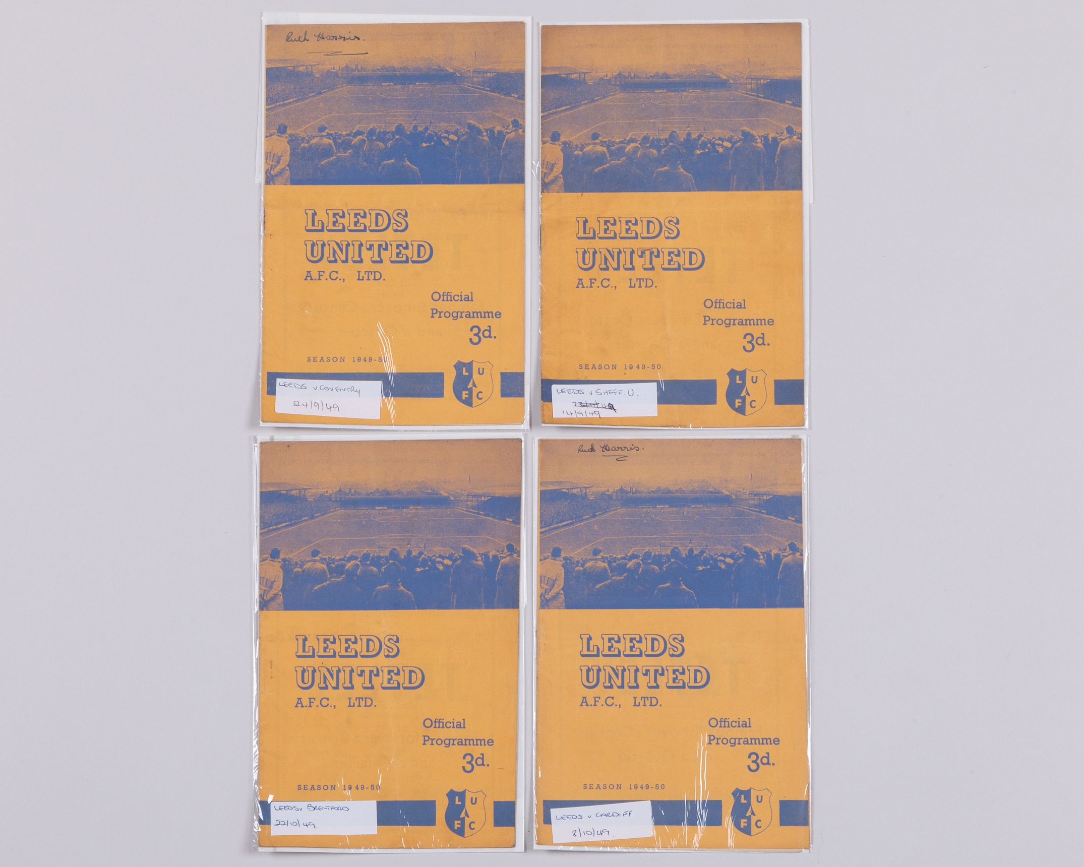Four Leeds United home match programmes, 1949, comprising Sheffield United, 14th September 1949, Coventry, 24th September 1949, Cardiff City, 8th October 1949 and Brentford, 22nd October 1949, folds, some text (4)