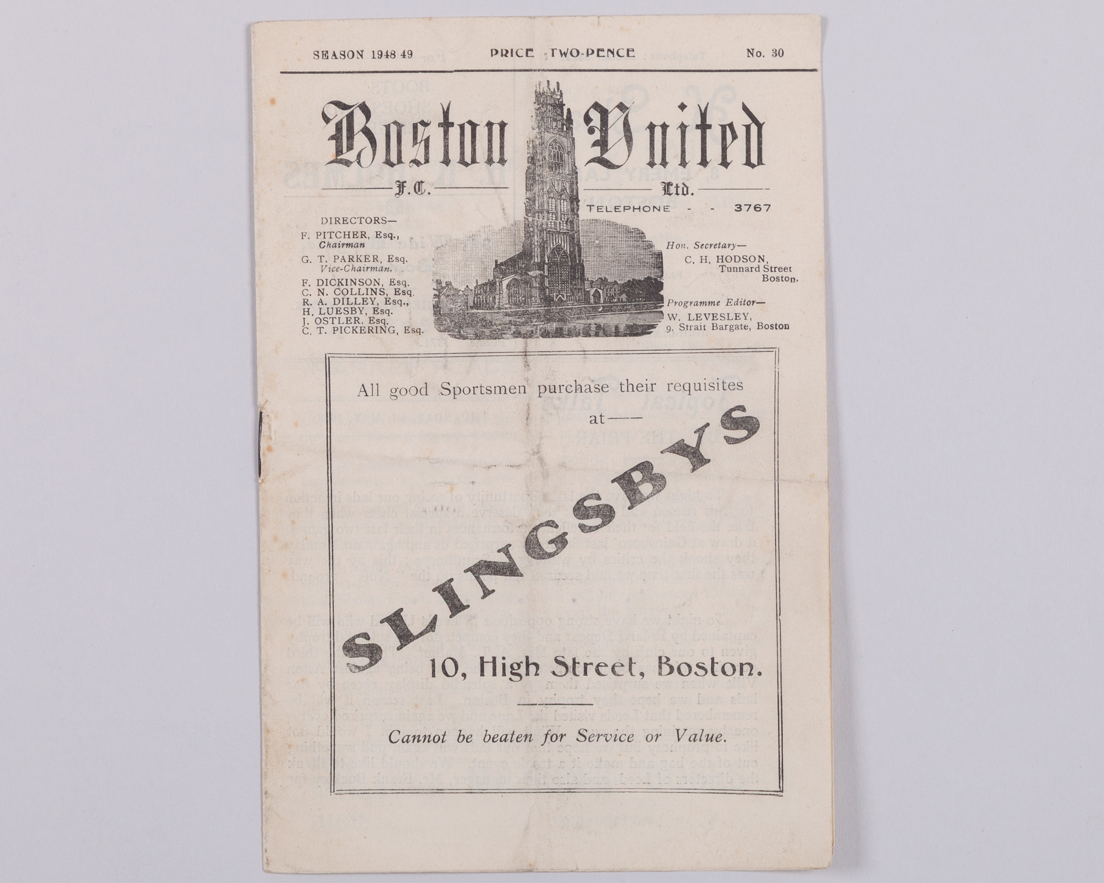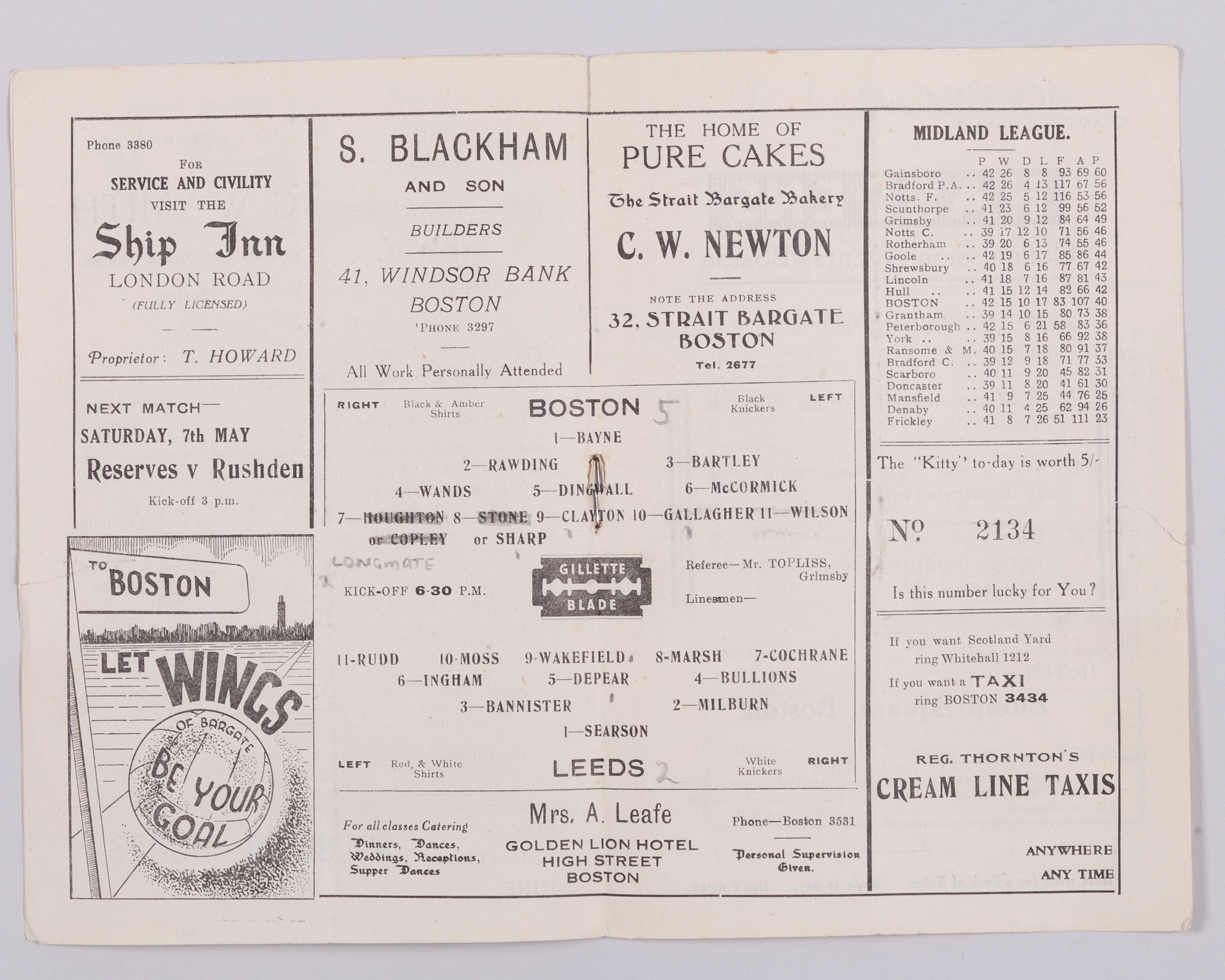 Boston United v. Leeds United Friendly match programme, 5th May 1949, folds, text on team page, some slight tearing
