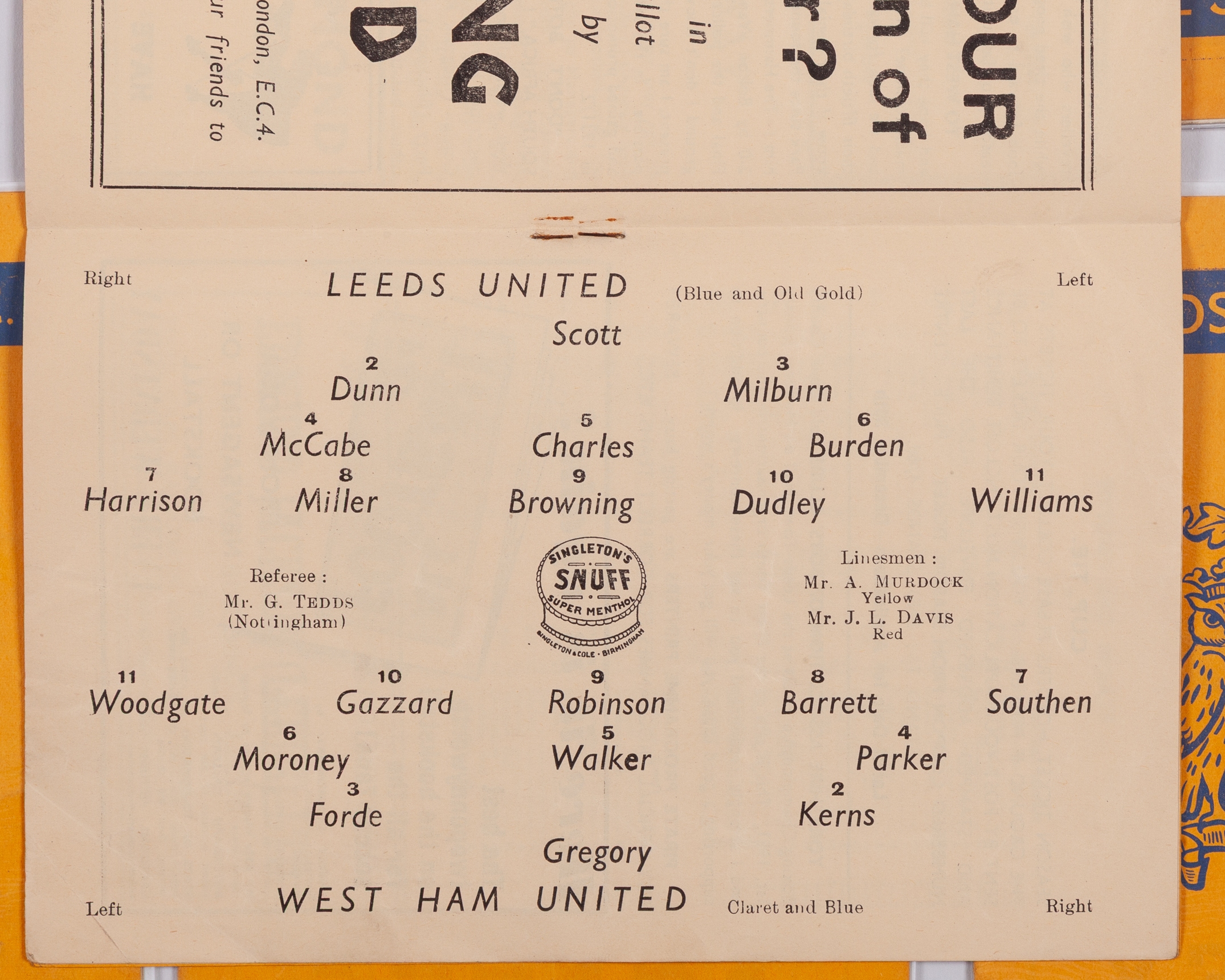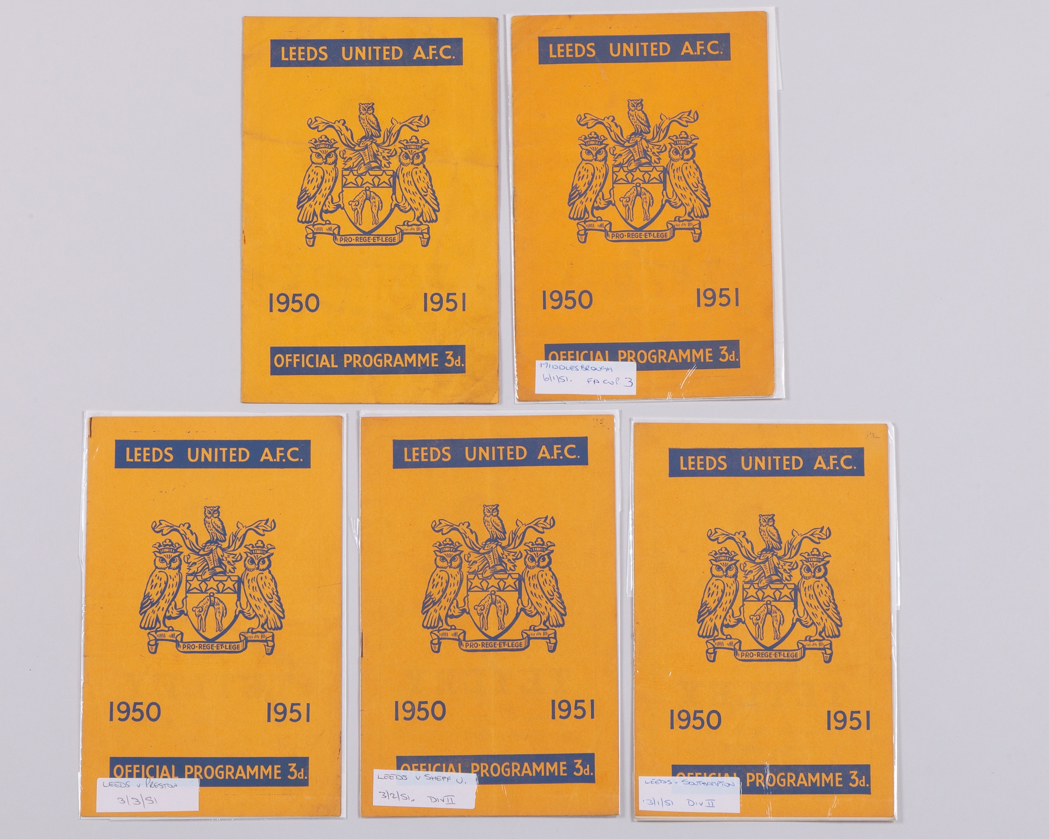 Five Leeds United home match programmes, 1950-51 comprising West Ham United, 26th December 1950, Middlesbrough, F.A.Cup, 6th January 1951, Southampton, 13th January 1951, Sheffield United, 3rd February 1951 and Preston, 3rd March 1951, folds, some text (5)
