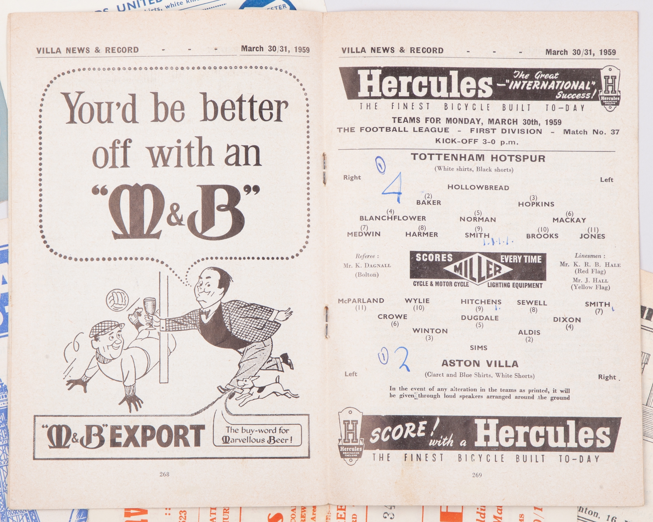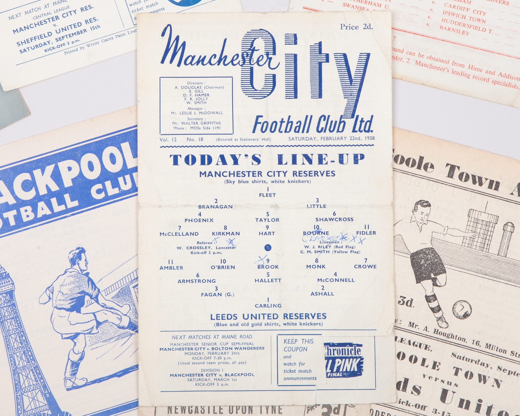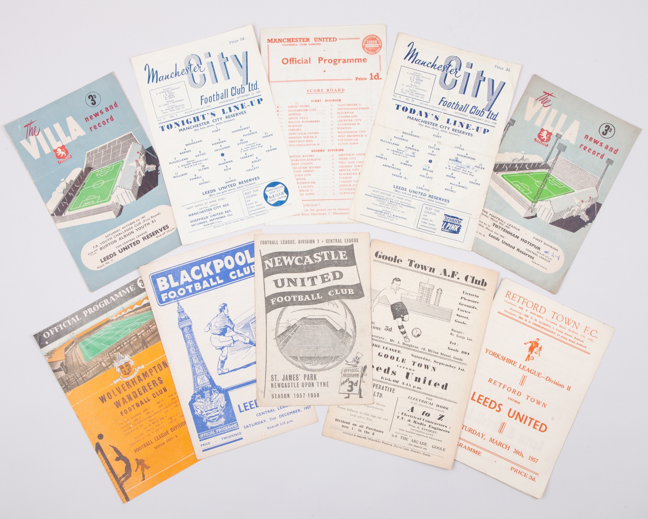 Ten Leeds United Reserve away match programmes, 1950s comprising Goole Town, 1st September 1956, Manchester City, 12th September 1956, Retford Town, 30th March 1957, Aston Villa, 5th October 1957, Blackpool, 21st December 1957, Wolves, 8th February 1958, Manchester City, 22nd February 1958 Newcastle United, 26th April 1958, Aston Villa, 31st March 1959 and Manchester United, 11th January 1958, folds, some text (10)