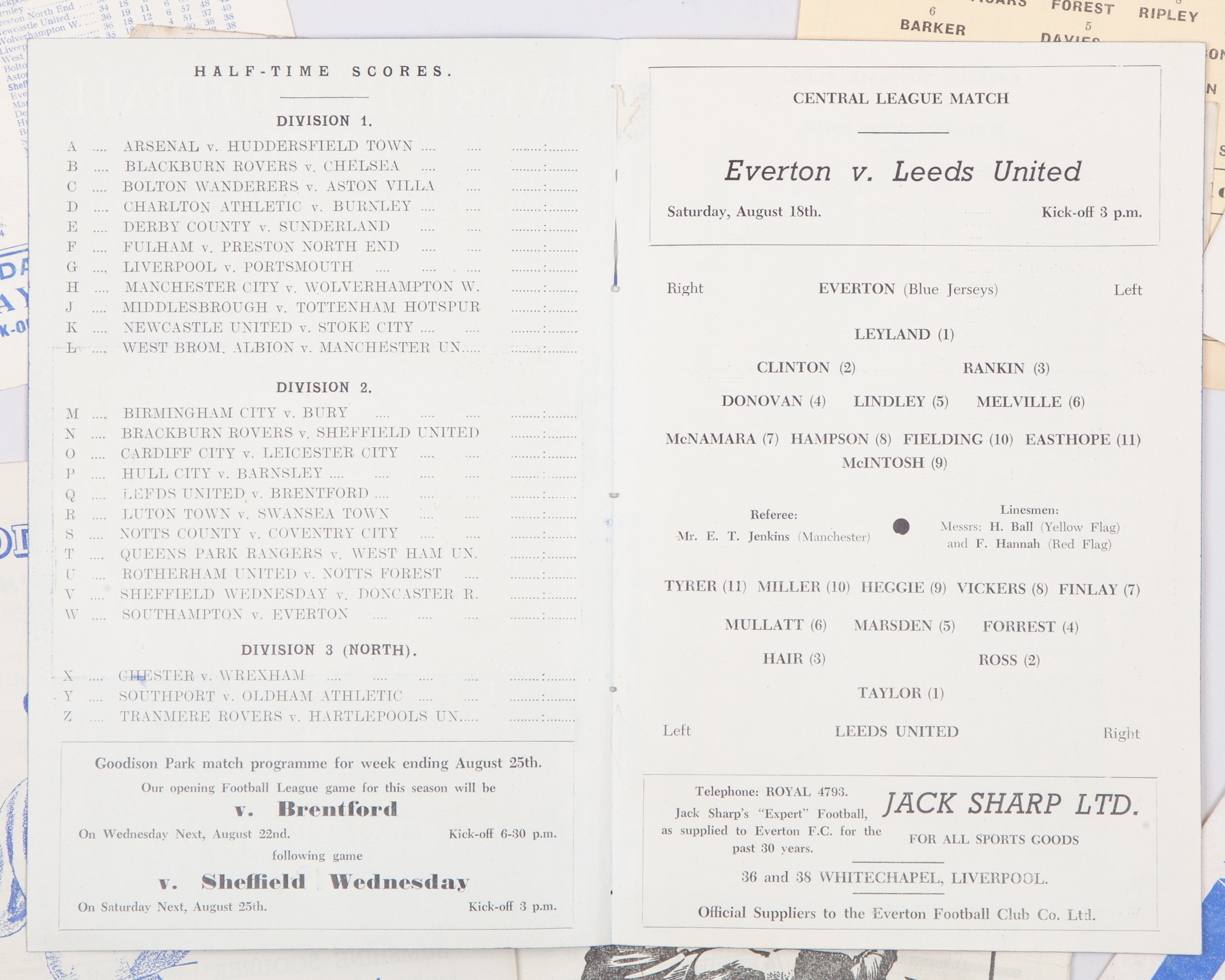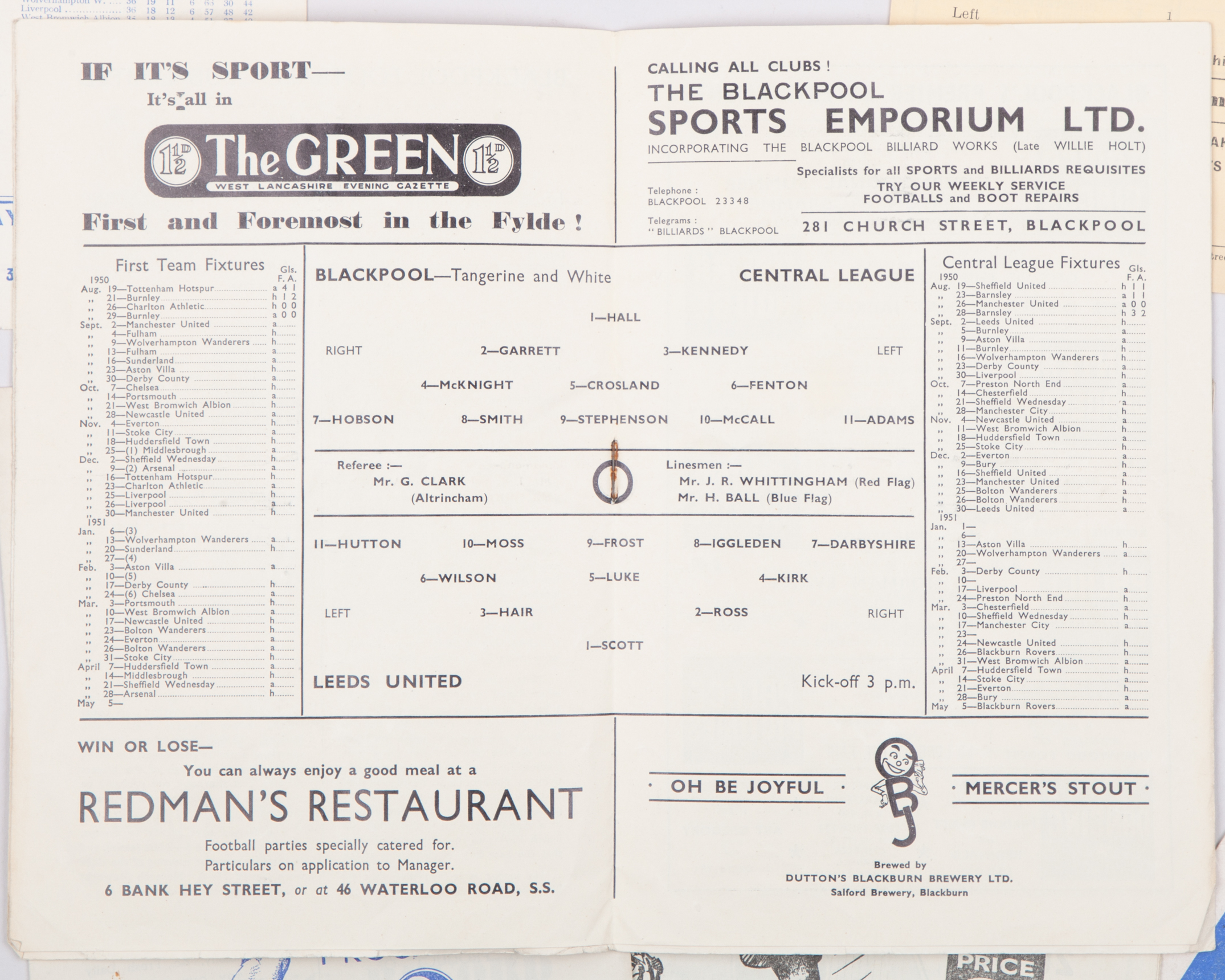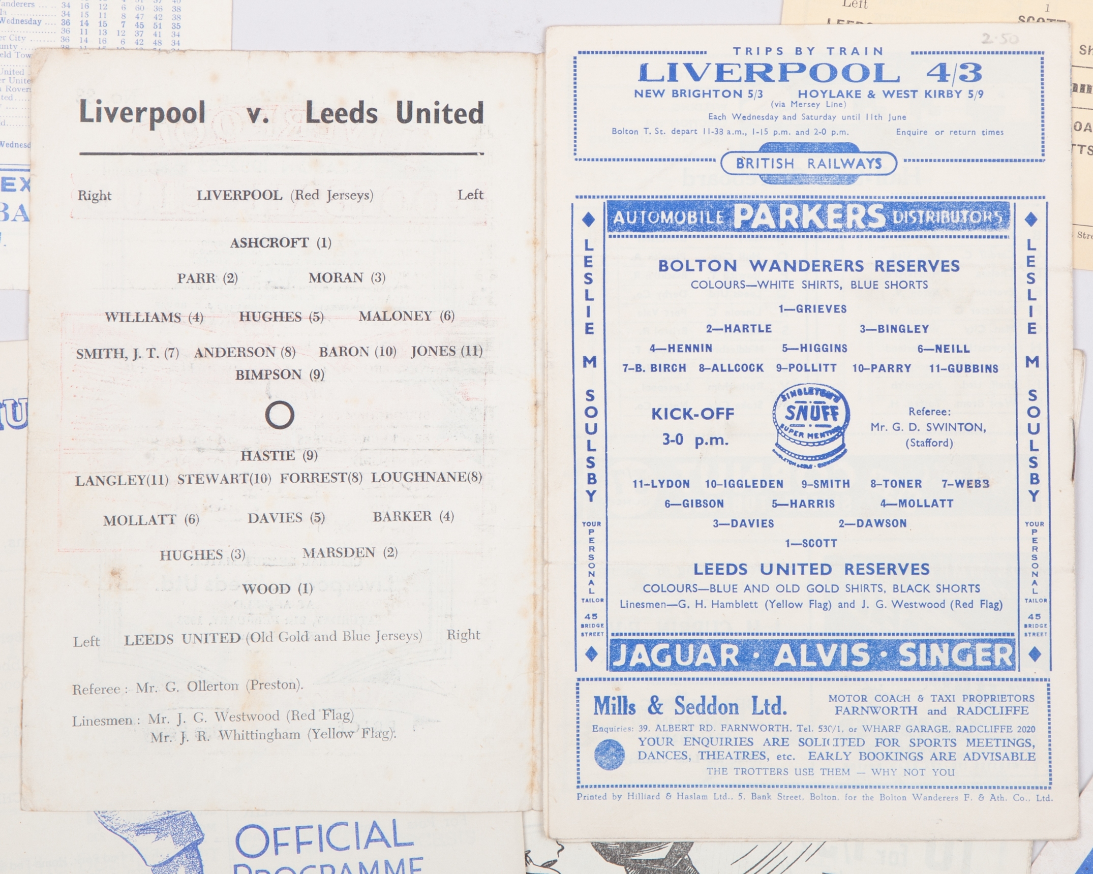 Ten Leeds United Reserve away match programmes, 1950s comprising Sheffield Wednesday, 1st April 1950, Blackpool, 2nd September 1950, Huddersfield Town, 24th February 1951, Newcastle United, 3rd May 1951, Everton, 18th August 1951 Liverpool, 21st February 1953, Preston North End, 28th August 1954, Bolton Wanderers, 26th February Barnsley, 27th August 1955 and Blackpool, 2nd April 1956, folds, some text (10)